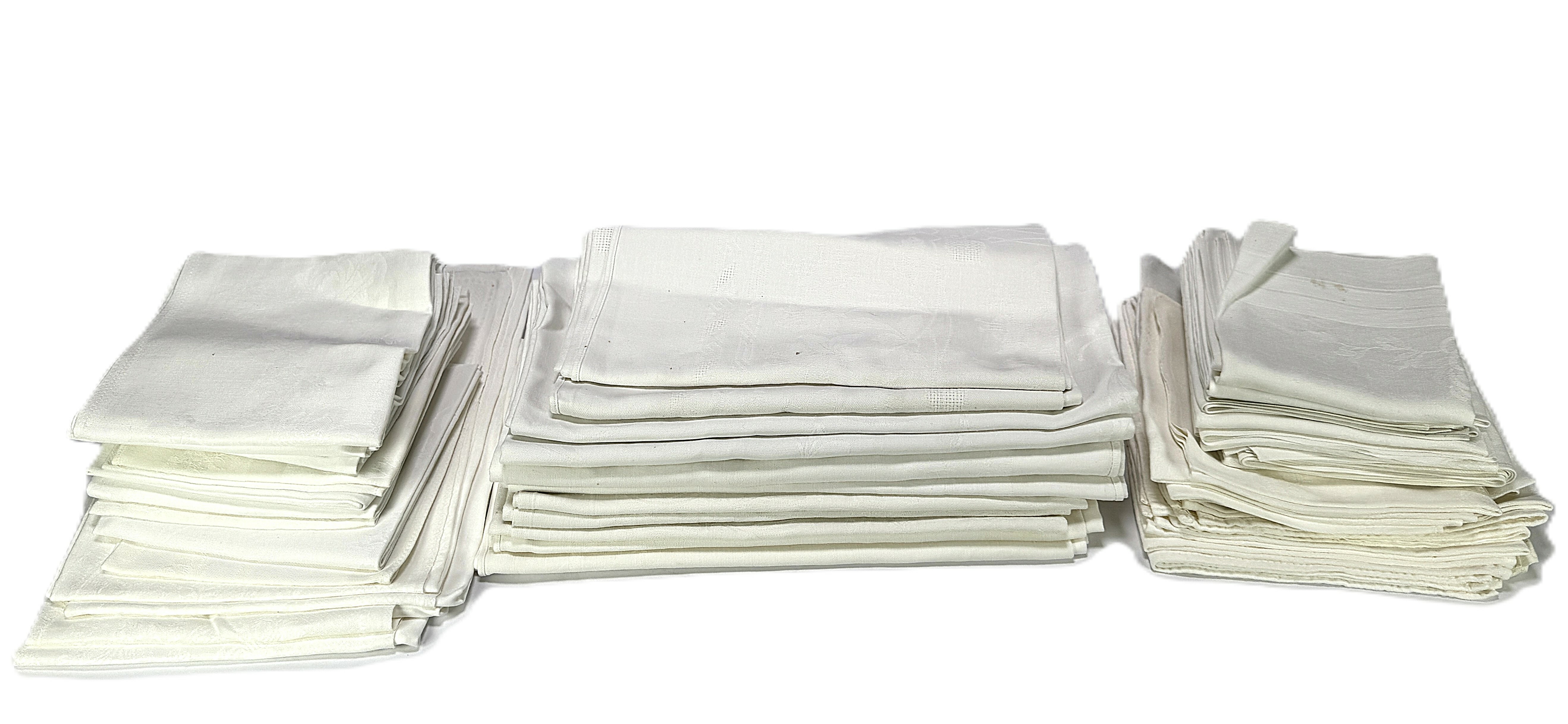 Tafelgoed van damast in traditionele stijl, vervaardigd uit wit geweven textiel met florale en geometrische patronen. Het lot bevat diverse servetten en tafellakens met glanzende weefstructuur en afgewerkte zomen. De collectie toont een variatie in afmetingen, datering 20e eeuw en een Europese herkomst. Geïnteresseerd? Bezoek onze kijkdagen op 10, 11 en 12 april van 11:00 tot 17:00 uur. |