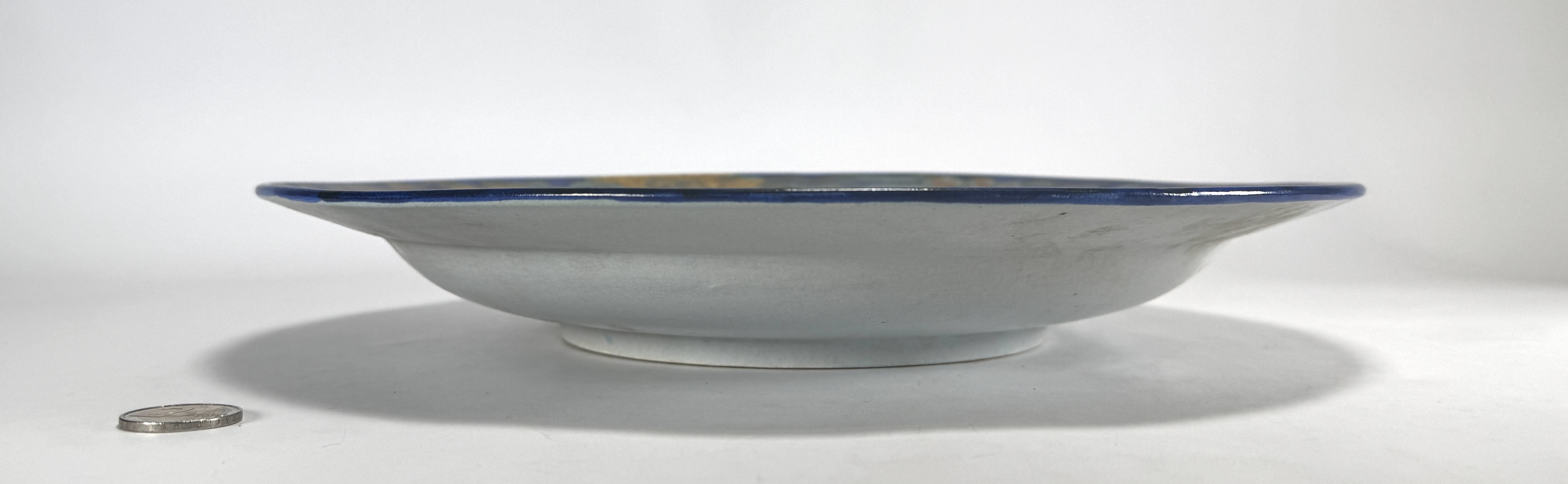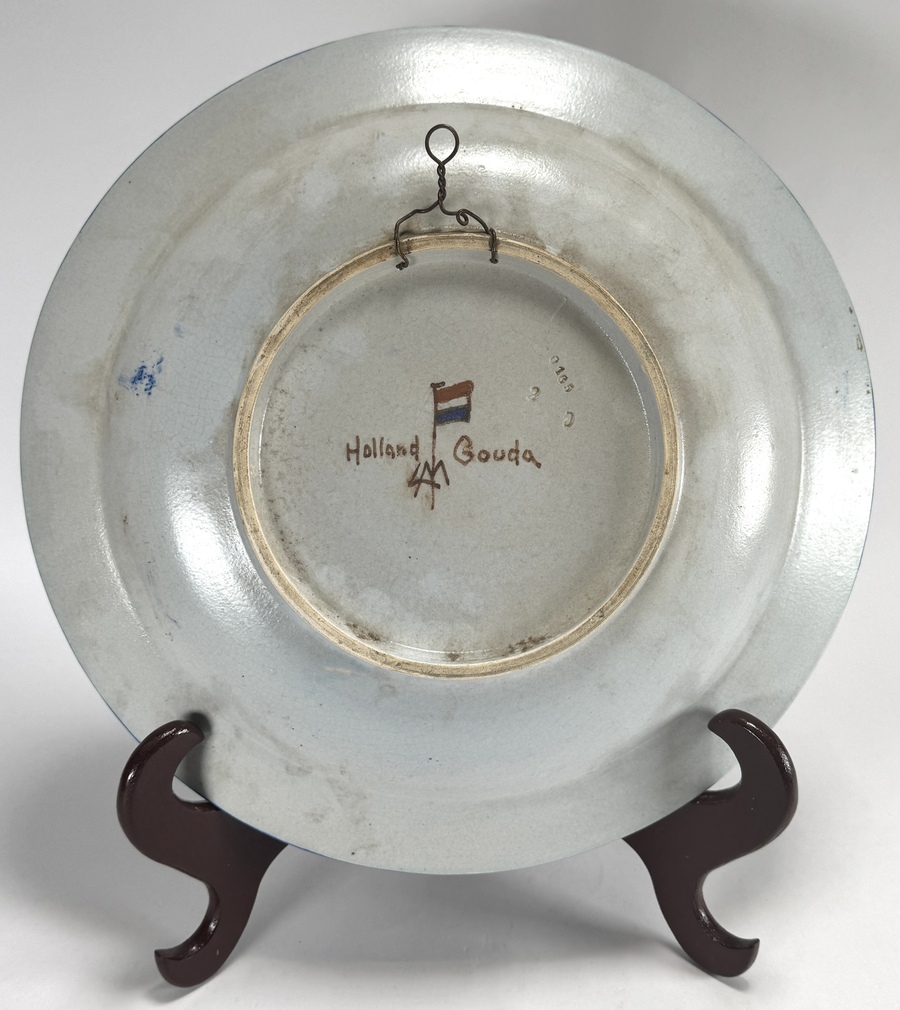 Schaal van Plateelbakkerij Zuid-Holland uit de Art Deco periode, vervaardigd uit aardewerk met een handbeschilderd polychroom decor. De schaal toont het decor van gestileerde bloemmotieven in okergeel en aardetinten tegen een diepblauwe achtergrond. Aan de achterzijde bevindt zich het fabrieksmerk met de Nederlandse vlag en modelnummer 0165. Daterend uit het eerste kwart 20e eeuw en een Nederlandse herkomst. De schaal zelf beoordelen? Je bent welkom op onze kijkdagen op 10, 11 en 12 april! |