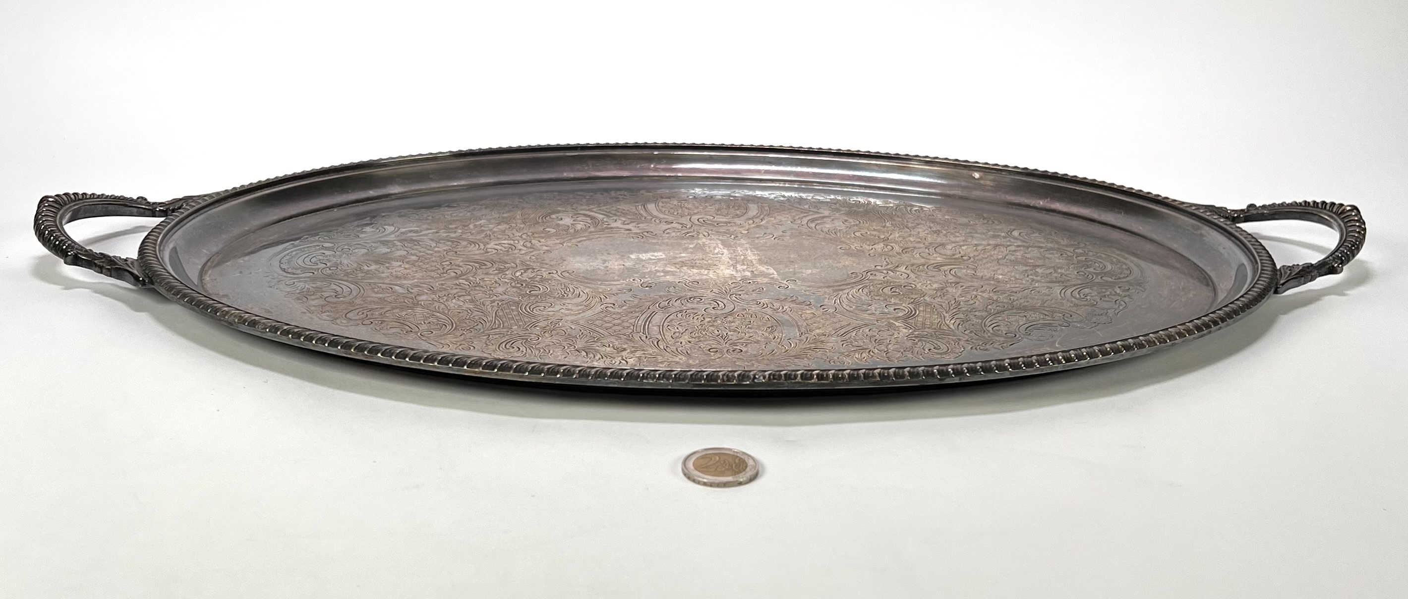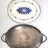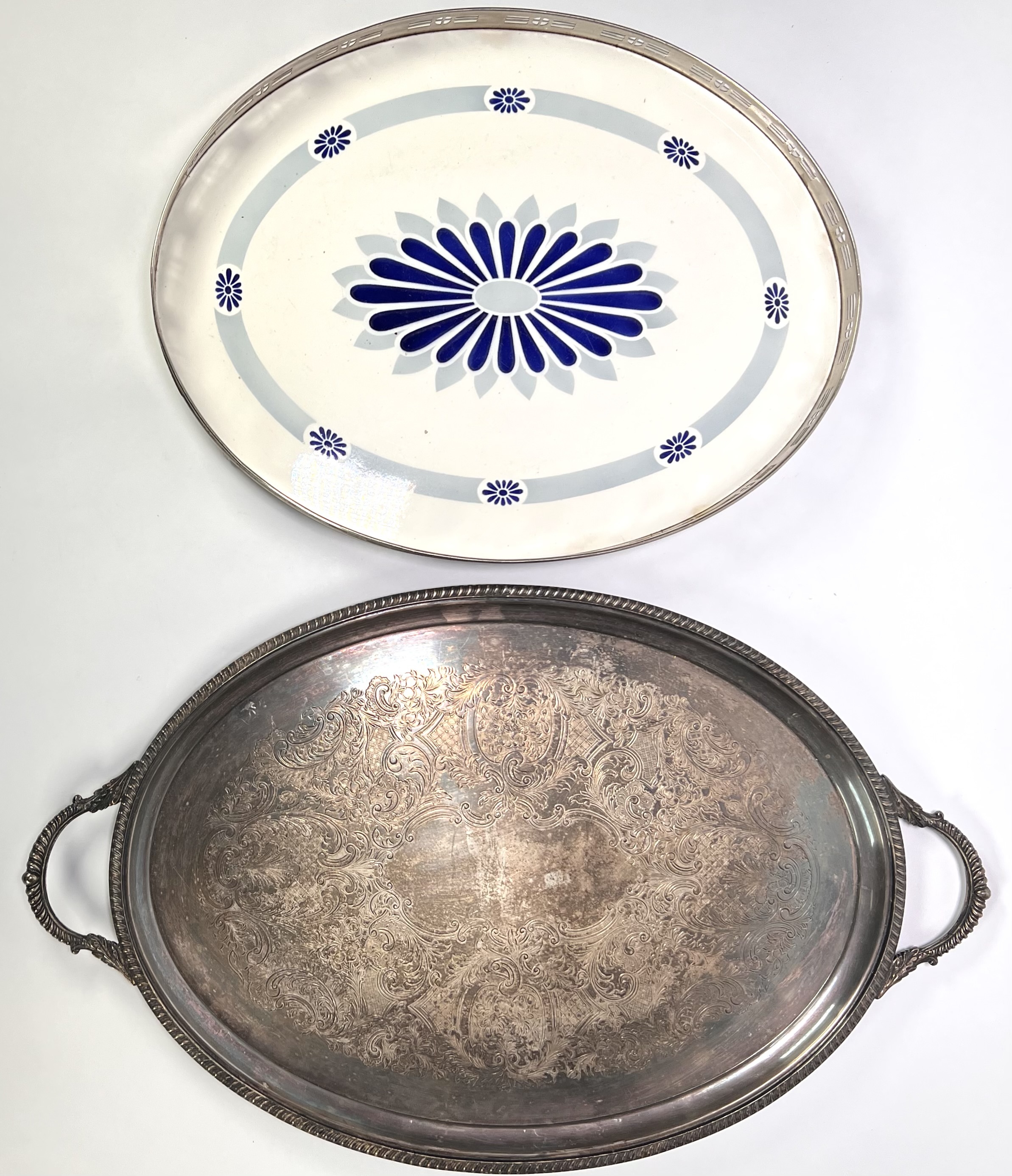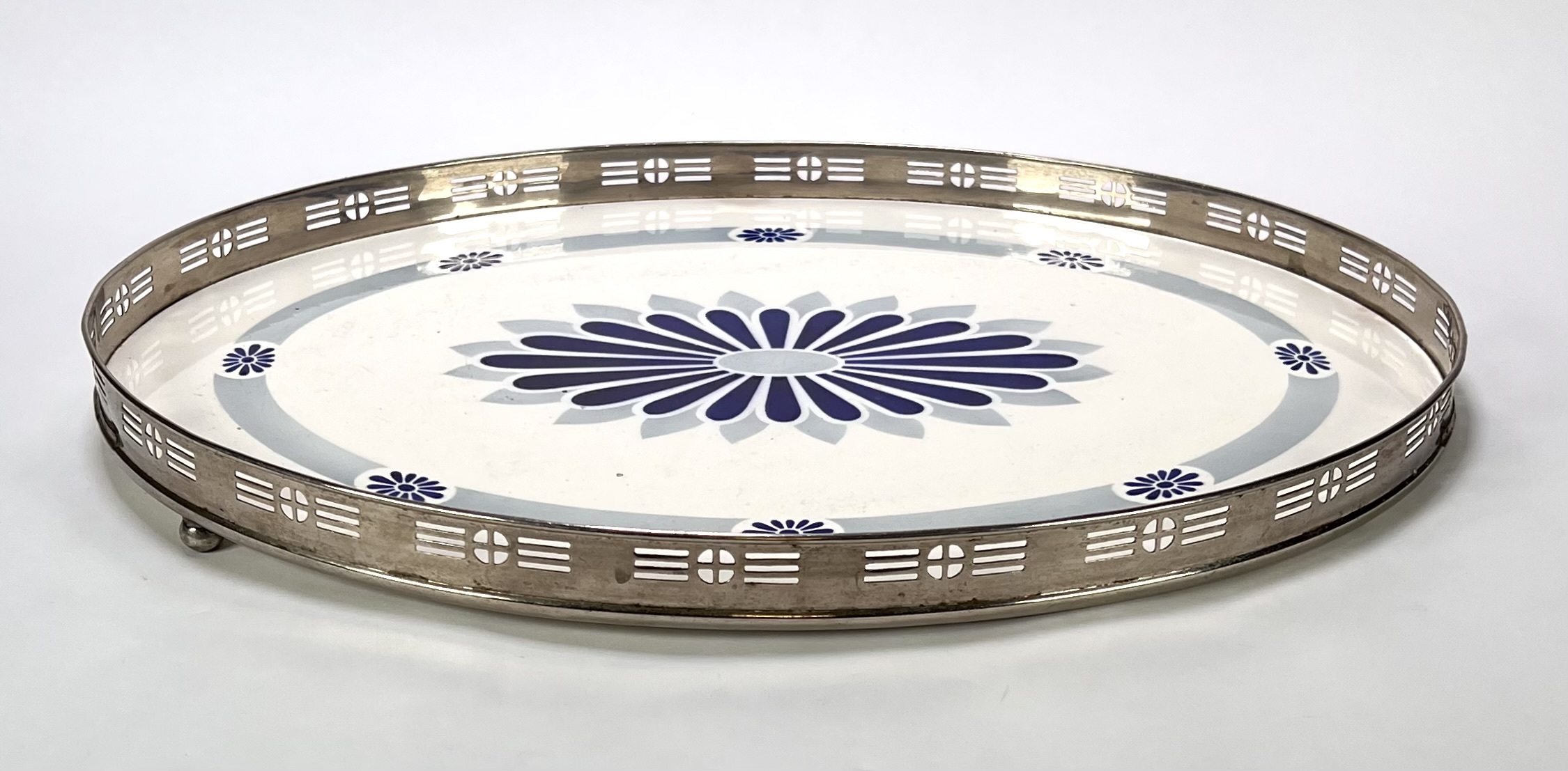Dienbladen in Art Deco stijl, vervaardigd uit keramiek en verzilverd metaal. Bestaand uit een ovaal dienblad met opengewerkte galerierand, keramische inzet met kobaltblauw en grijs bloemmotief, en een ovaal verzilverd dienblad met gegraveerd bloempatroon en grepen. De dienbladen dateren uit het midden van de 20e eeuw en hebben een Europese herkomst. Wil je direct deelnemen? Plaats vanaf 3 april alvast een schriftelijk bod via onze website! |