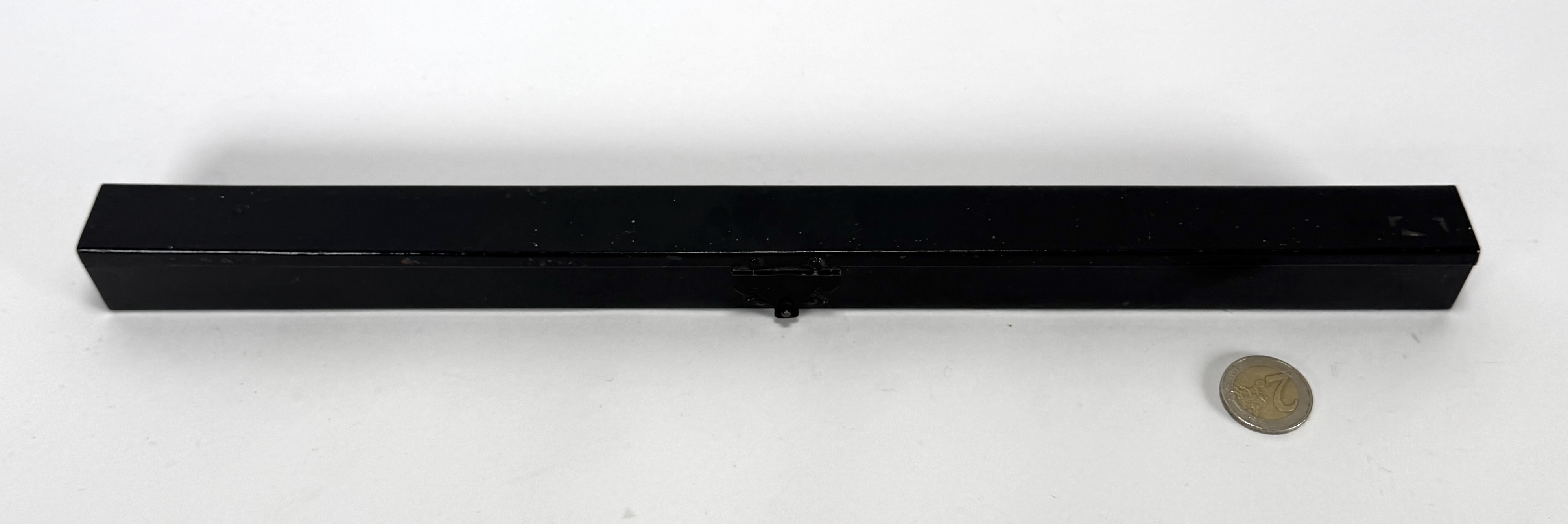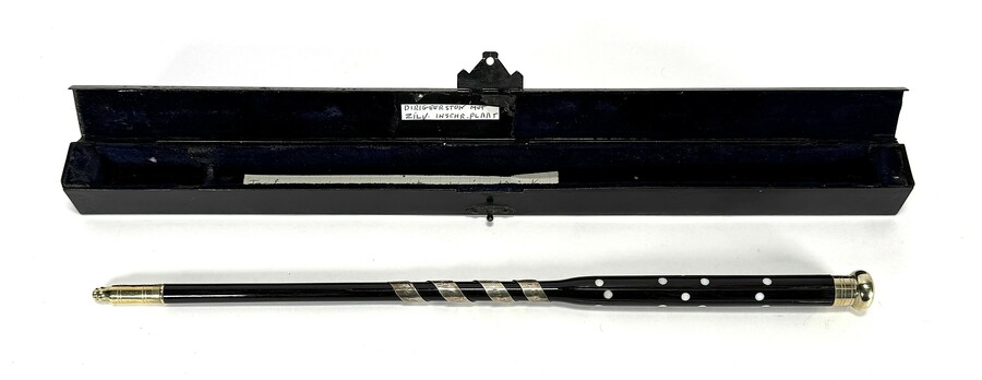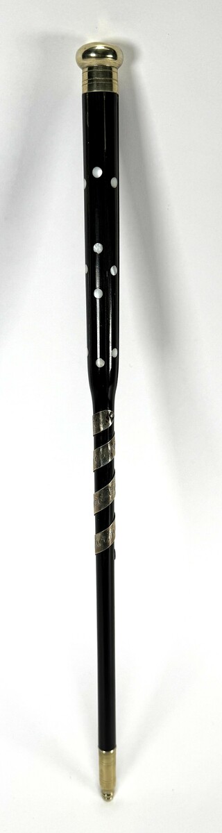Dirigeerstok uit de Art Deco periode, vervaardigd uit zwart gelakt hout met zilveren beslag en parelmoerinleg. De schacht is deels omwonden door een spiraalvormige zilveren band met gegraveerde inscriptie “Ter herinnering aan onze 1ste matinée. W.i.K.”. De bolvormige knop en witte stippen benadrukken het geometrische karakter. In zwart houten kistje, daterend circa 1930 en een Nederlandse herkomst. Geïnteresseerd? Bezoek onze kijkdagen op 10, 11 en 12 april van 11:00 tot 17:00 uur! |