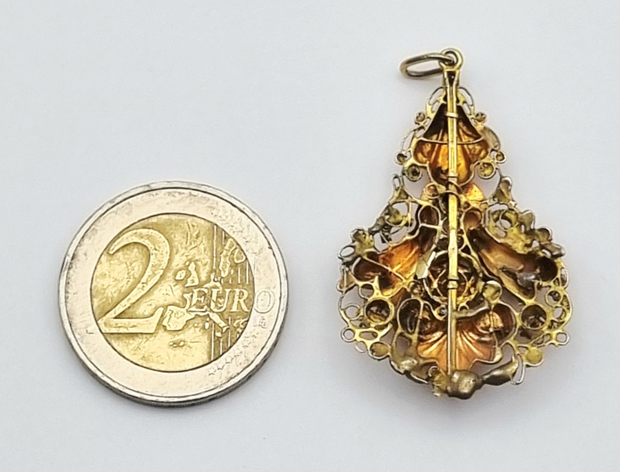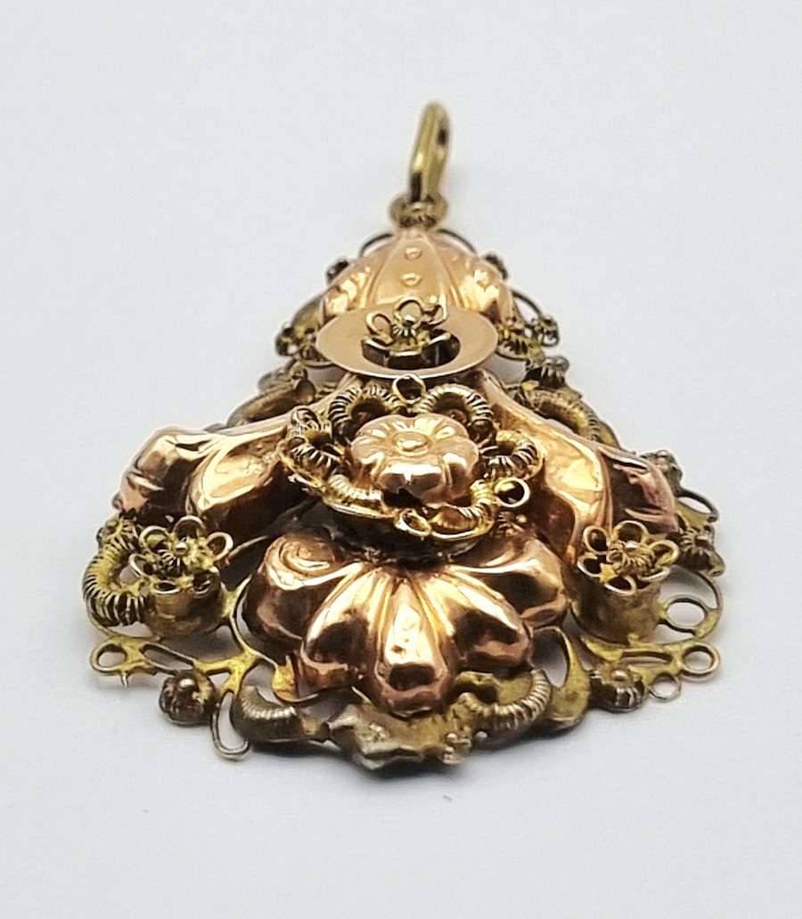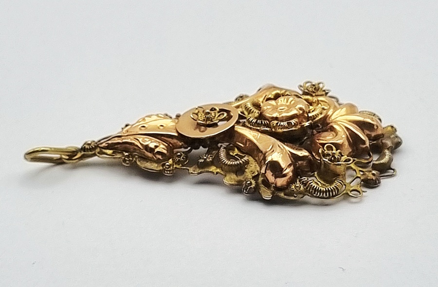 18 karaat gouden hanger, getoetst, met een tweekleurige ontwerp van geelgoud met roségouden accenten in een compositie van gedreven florale motieven en gestileerde voluten. De hanger toont een centraal bloemornament omgeven door waaiervormige elementen en fijn cannelurewerk aan de zijden. Datering midden 20e eeuw. Eerst de hanger zien voordat je biedt? Bezoek onze kijkdagen op 10, 11 en 12 april! |