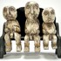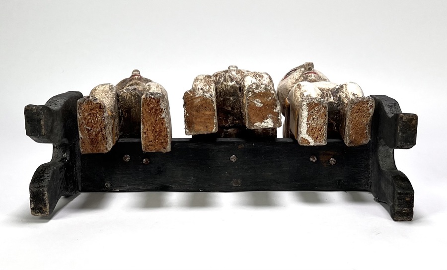 Beeld in tribale stijl, vervaardigd uit hout met handgesneden en polychroom beschilderde voorstelling van drie zittende figuren op een bank. De langgerekte hoofden met amandelvormige, rood omlijnde ogen en gestileerde handen rusten frontaal op de romp, geelkleurige banden accentueren polsen en enkels. Het beeld dateert uit de tweede helft van de 20e eeuw en heeft een West-Afrikaanse herkomst. Wil je direct deelnemen? Plaats vanaf 3 april alvast een schriftelijk bod via onze website! |