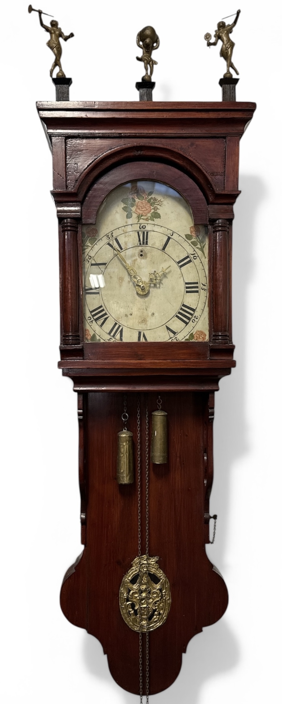 Friese staartklok, vervaardigd uit een houten kast met halve pilaren en metalen beelden van Atlas en bazuinblazers op de kap. Het uurwerk is voorzien van een ankergang en slagwerk op een bel, aangedreven door messing gewichten aan kettingen. De handbeschilderde wijzerplaat toont florale motieven en Romeinse cijfers. Eind 19e eeuw. Geïnteresseerd? Bezoek onze kijkdagen op 10, 11 en 12 april van 11:00 tot 17:00 uur! |
