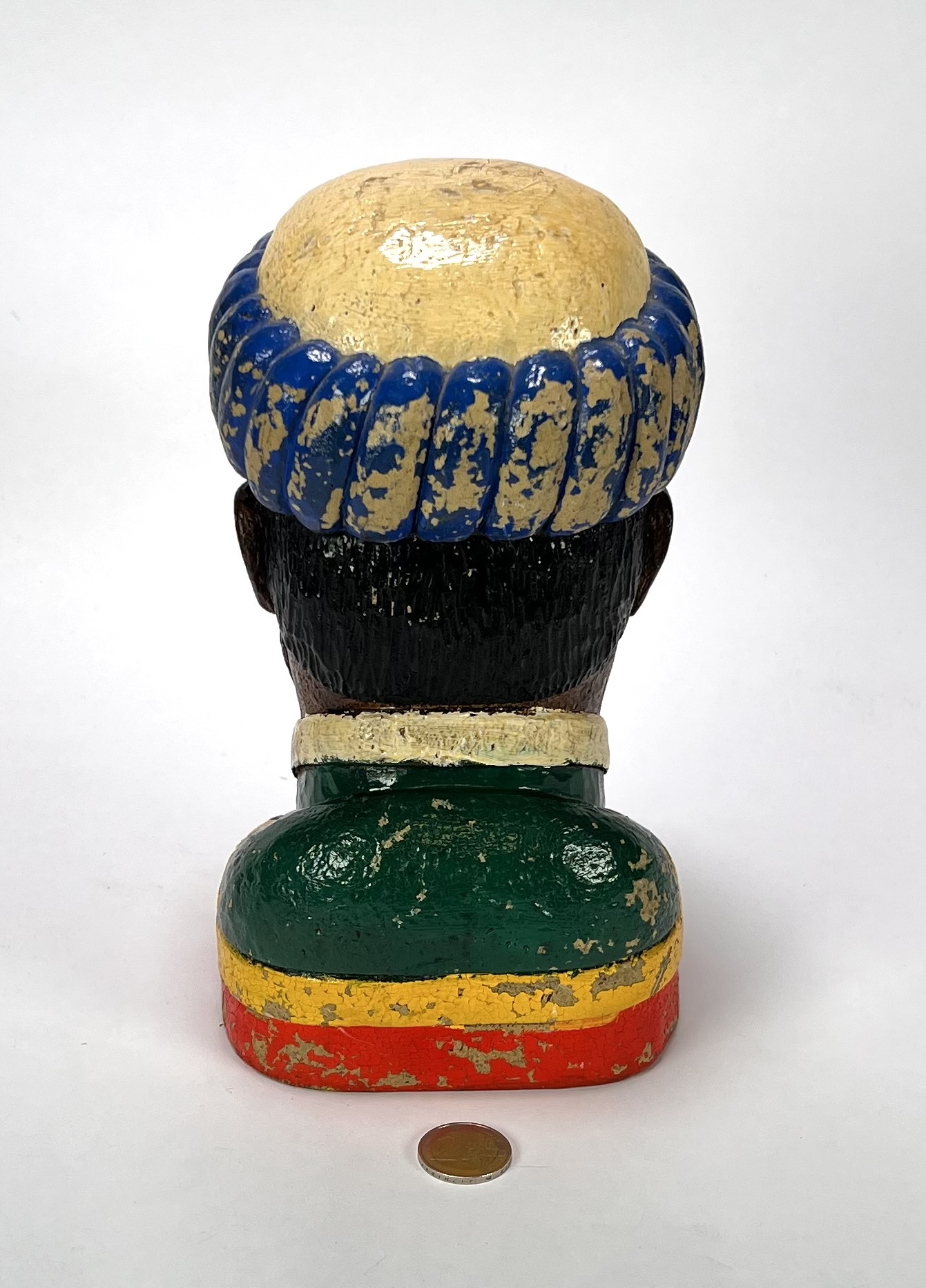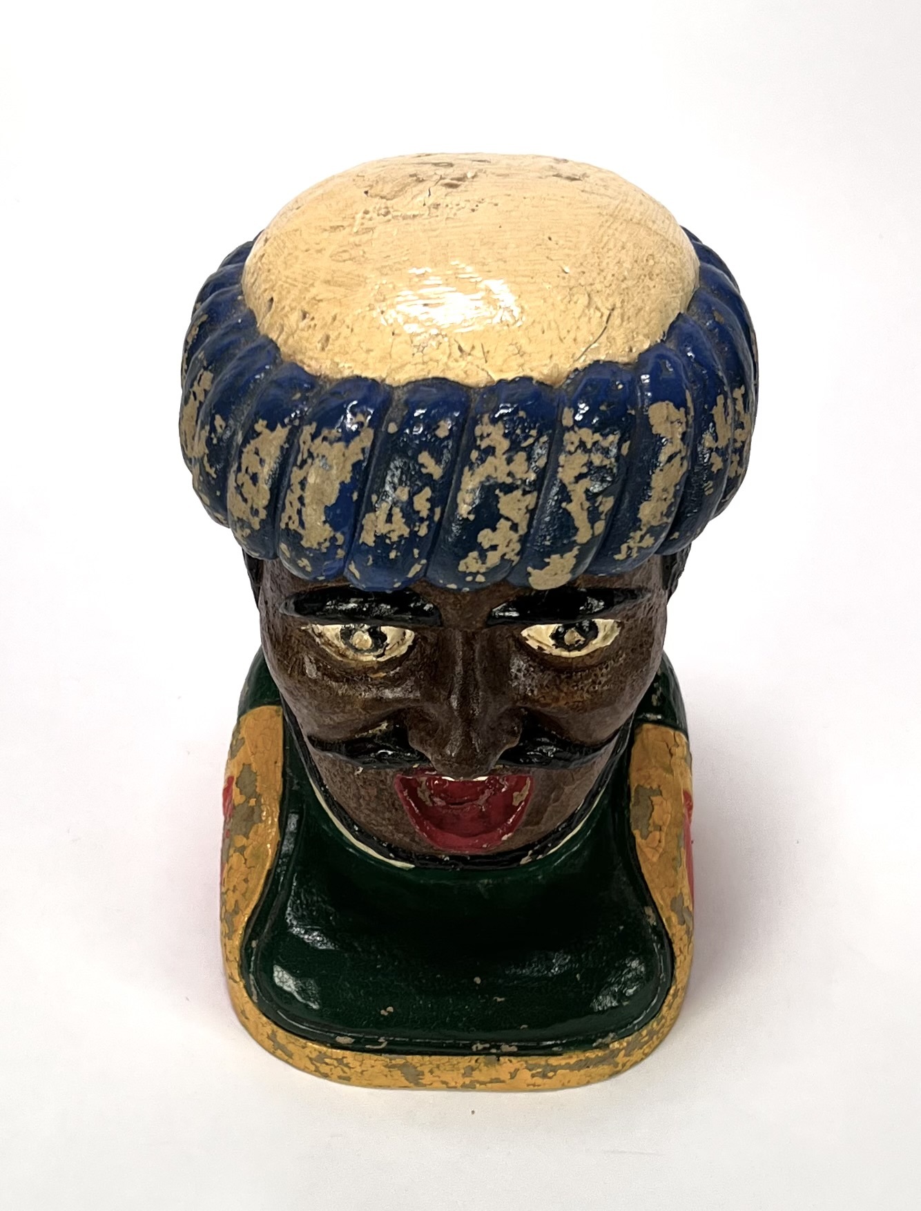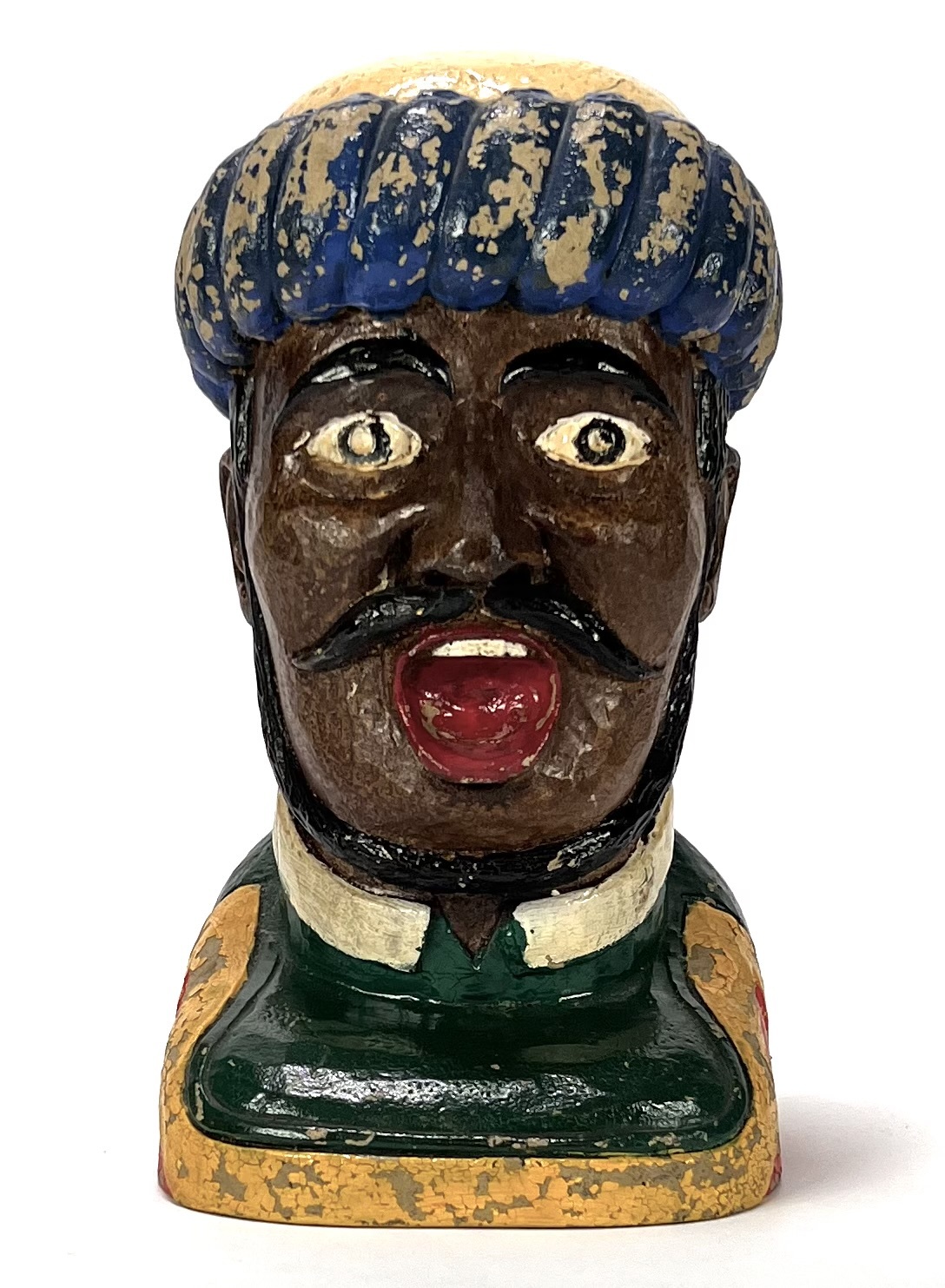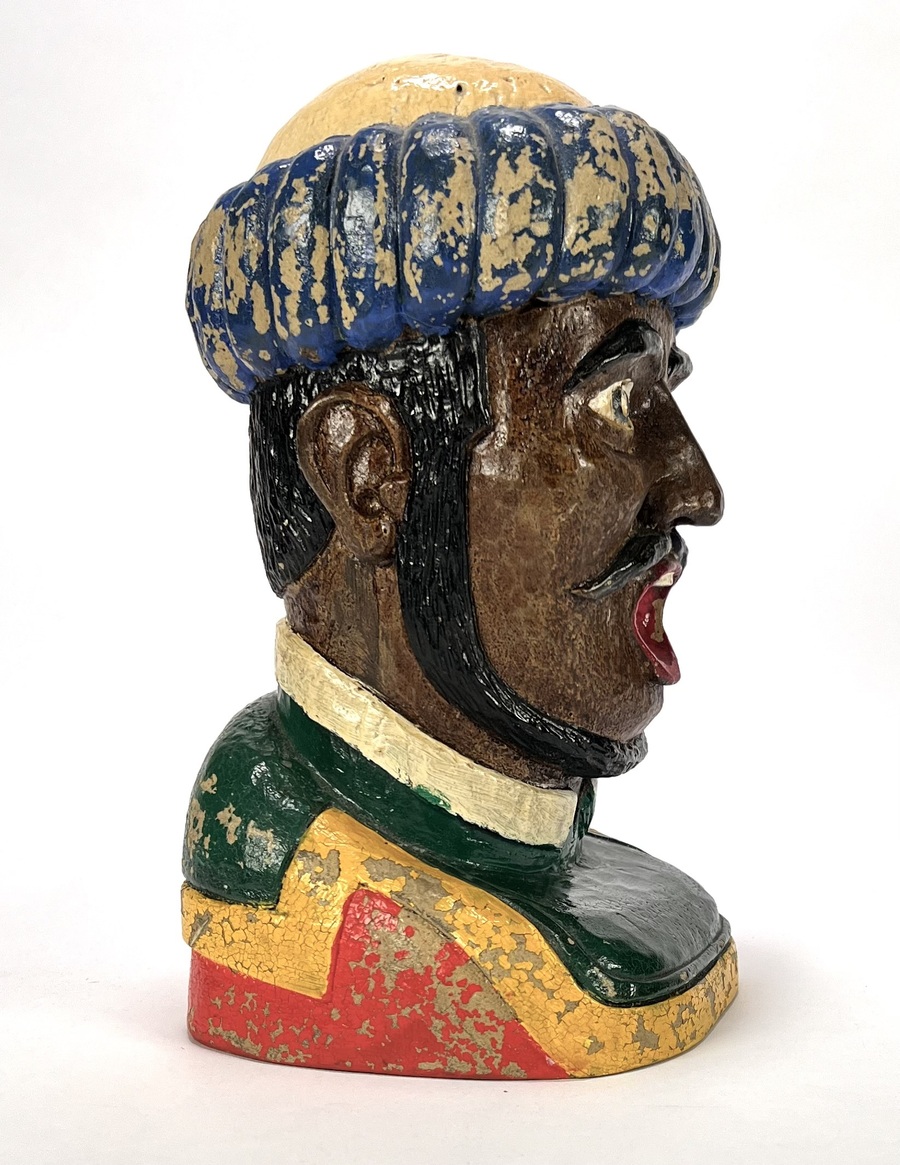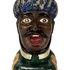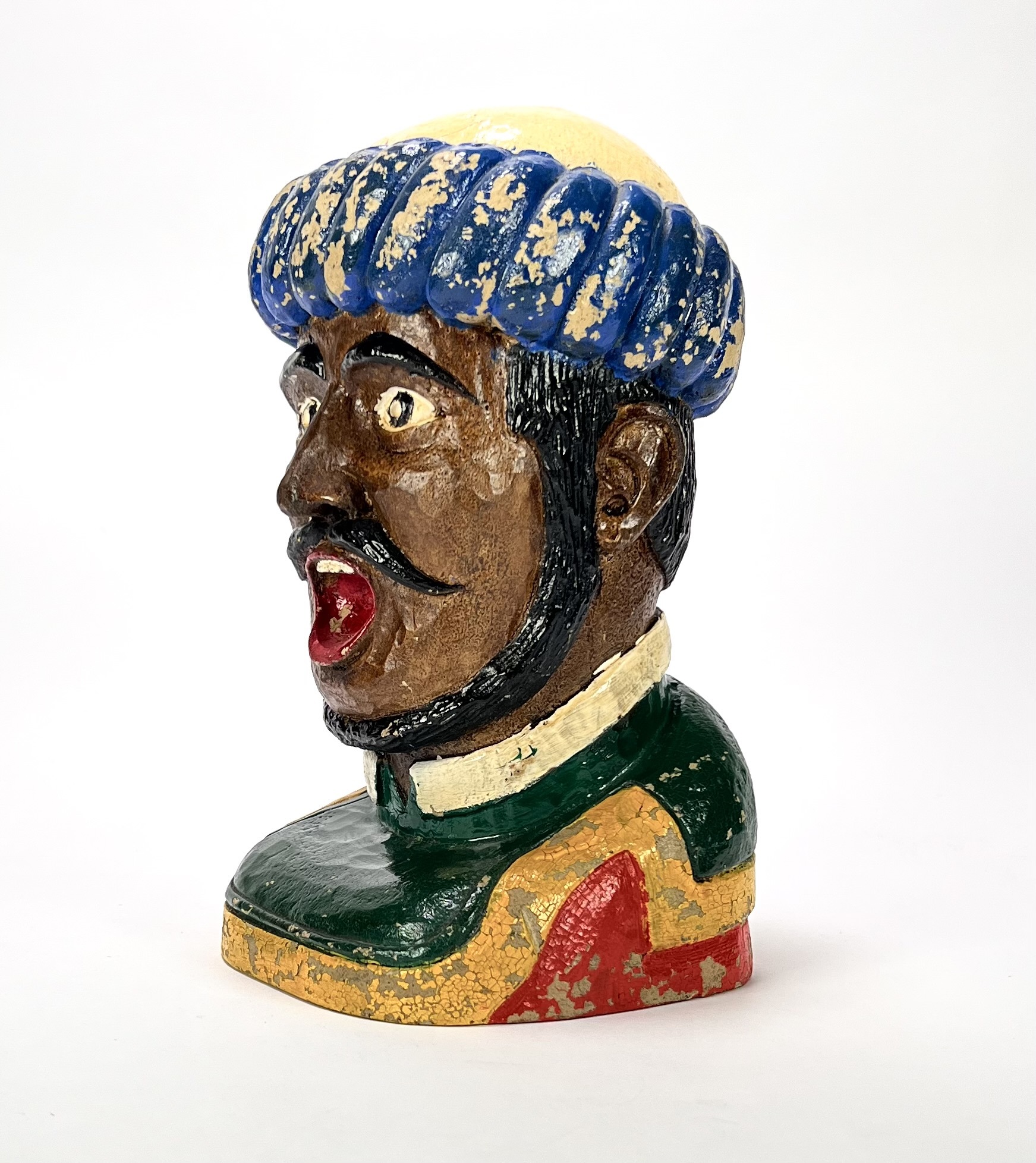 Gaper vervaardigd uit keramiek, uitgevoerd als buste van een Moor met een blauw-gele tulband. De apothekersfiguur toont een karakteristieke opengesperde mond, zwarte krulsnor en een polychrome beschildering. Daterend midden 20e eeuw en een Nederlandse herkomst. Klaar om te bieden? Registreer je nu en doe mee aan de veiling! |