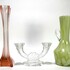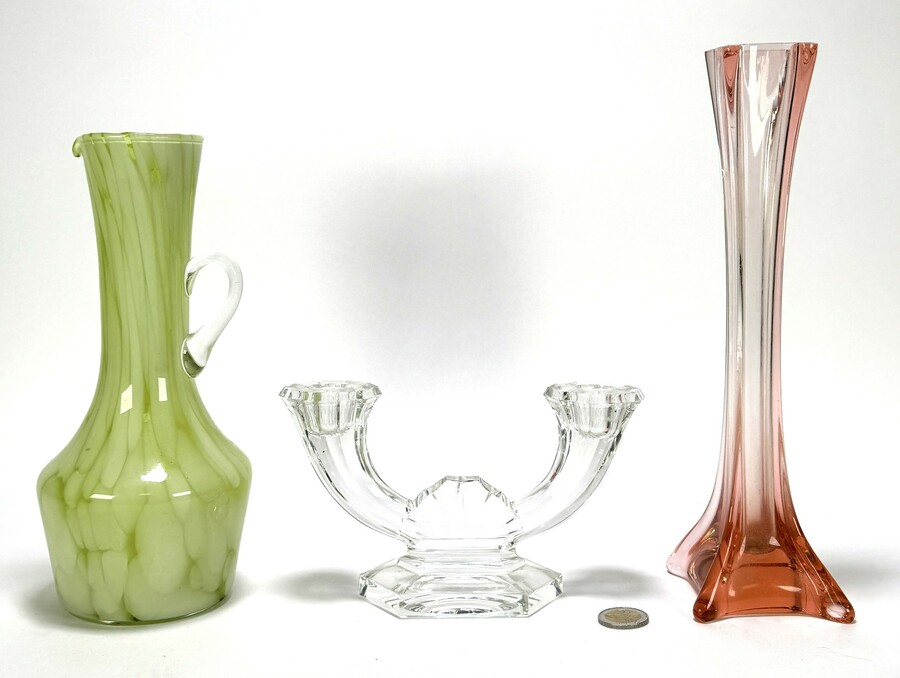 Glaswerk vervaardigd uit mondgeblazen glas; een groene vaas met gemarmerd decor en aangezet oor, een transparante tweearmige kandelaar met gefacetteerde voet en een hoge vaas met roze kleurverloop en vierlobbig gevormde voet. Datering 20e eeuw en een Europese herkomst. Wil je dit glaswerk in het echt bekijken? Kom naar de kijkdagen! |