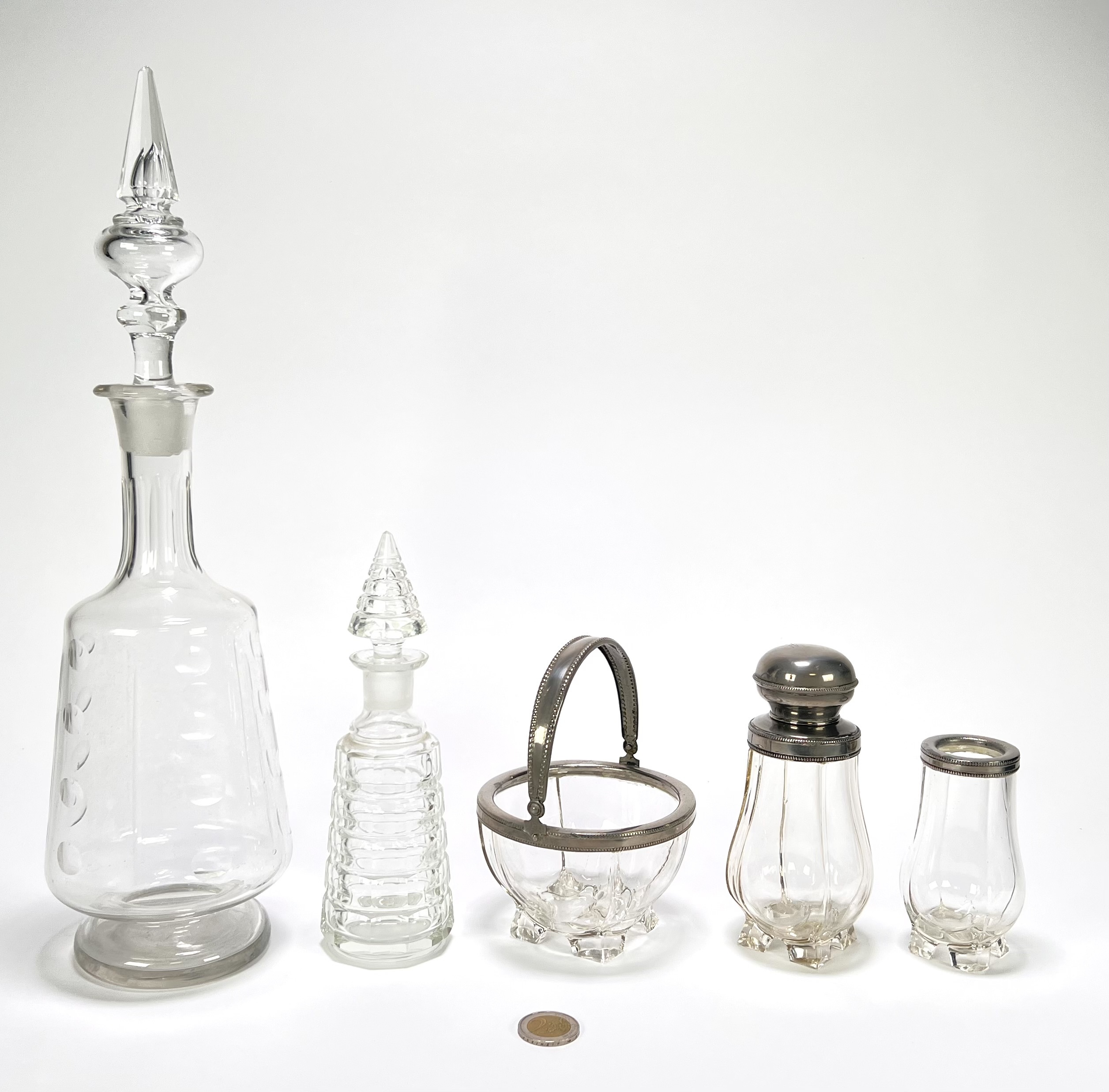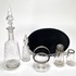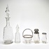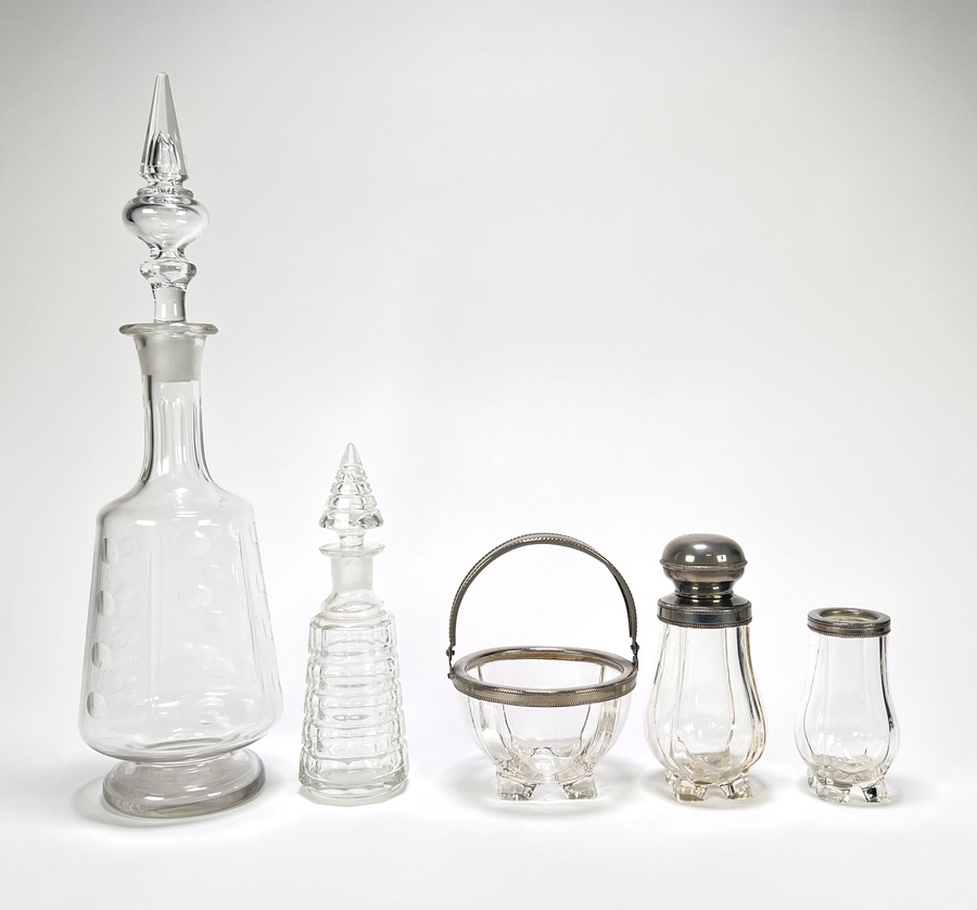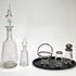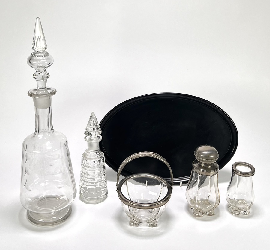 Servies uit de Art Deco periode, vervaardigd uit geslepen kristalglas en bakeliet. Het kavel omvat twee karaffen, een suikerpot, kandijschaaltje, lepelvaasje en een zwart bakeliet dienblad. Het glaswerk vertoont geometrische slijppatronen. Datering circa 1930 en een Europese herkomst. Zeker zijn van deelname? Plaats vanaf 3 april een schriftelijk bod online! |