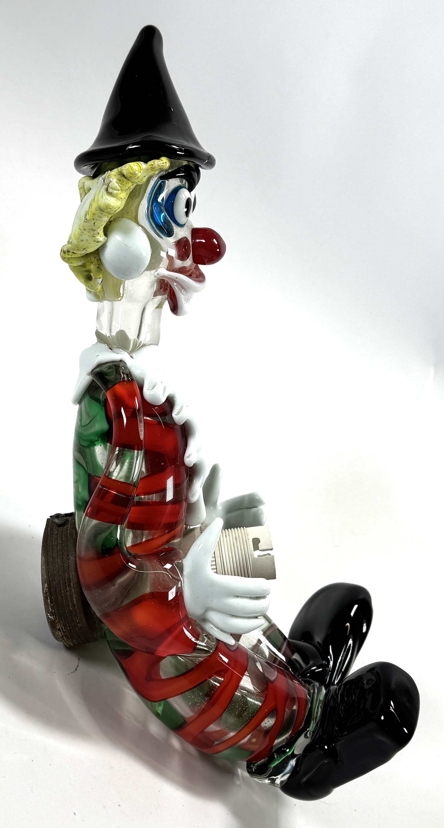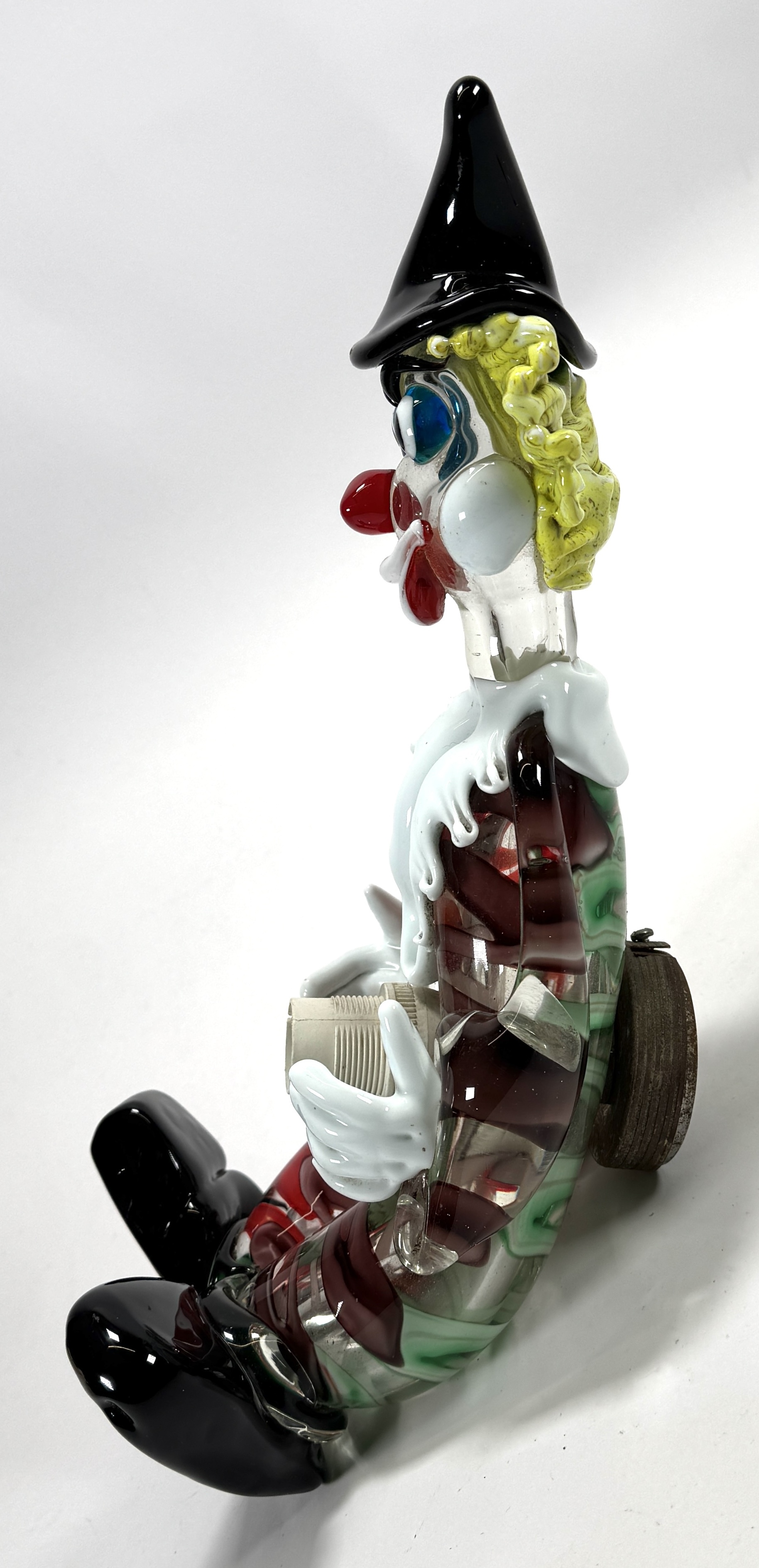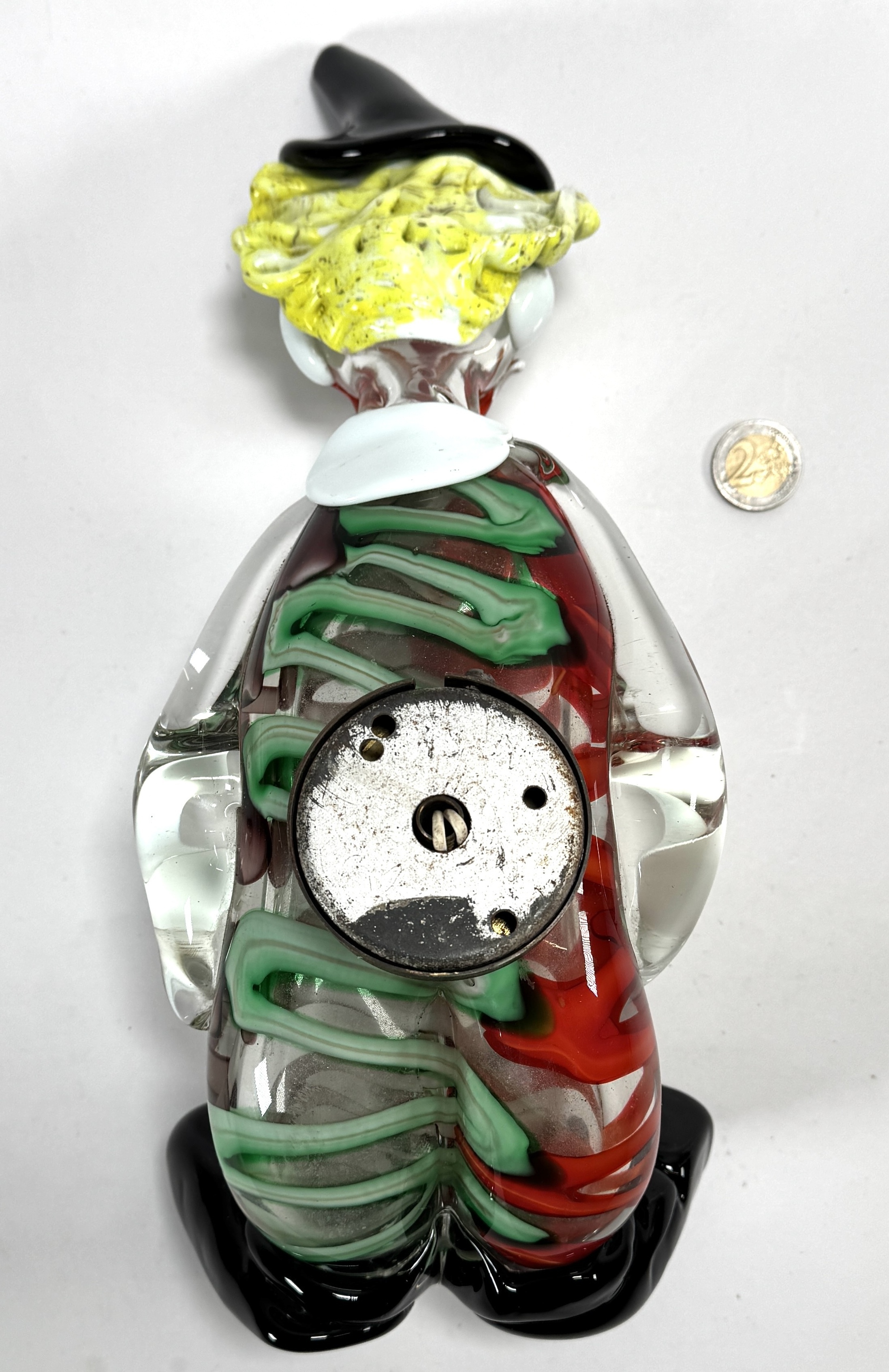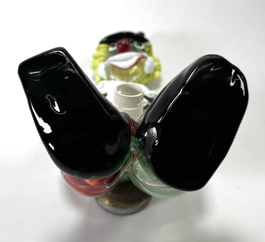 Wandlamp van Murano in de vorm van een zittende clown, type Pagliaccio, vervaardigd uit veelkleurig handgeblazen glas. De figuur toont een zwarte punthoed, geel krulhaar en een wit geplooide kraag boven een gestreept corpus in rood en groen. Het object fungeert als wandverlichting met een metalen armatuur aan de achterzijde. De lamp dateert uit het midden van de 20e eeuw en heeft een Italiaanse herkomst. Klaar om te bieden? Registreer je nu en doe mee aan de veiling! |