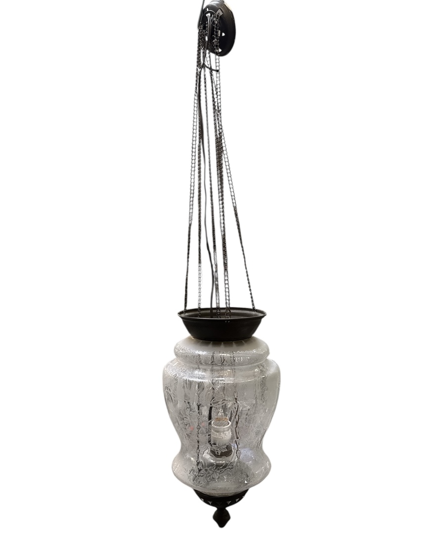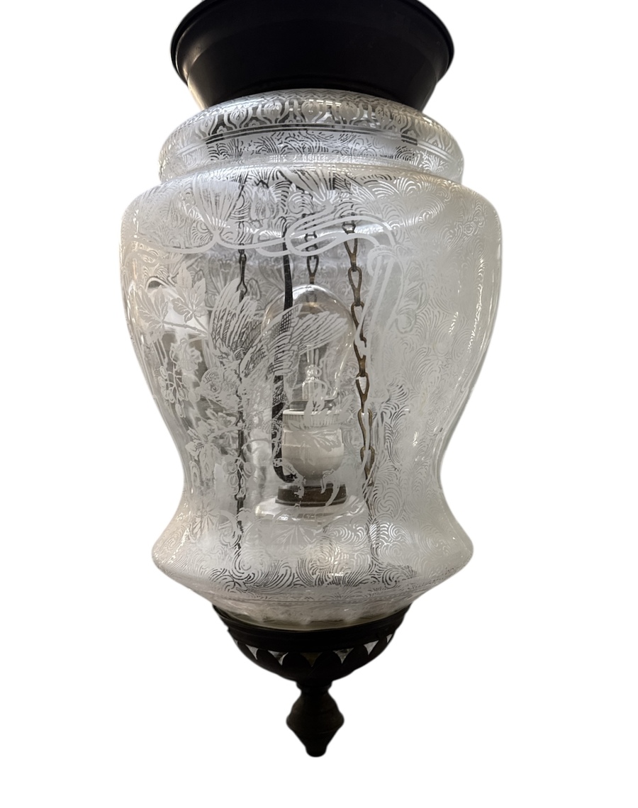 Hanglamp uit de Art Nouveau periode, vervaardigd uit mousselineglas met een goudkleurig messing montuur. De kap toont een verfijnde geëtste decoratie van florale slingers en gestileerde vogels binnen een geometrisch kader. De balustervormige corpus hangt aan een messing kettingconstructie met decoratieve plafondrozet. De hanglamp dateert uit het begin van de 20e eeuw en heeft een herkomst in West-Europa. Zeker zijn van deelname? Plaats vanaf 3 april een schriftelijk bod online! |