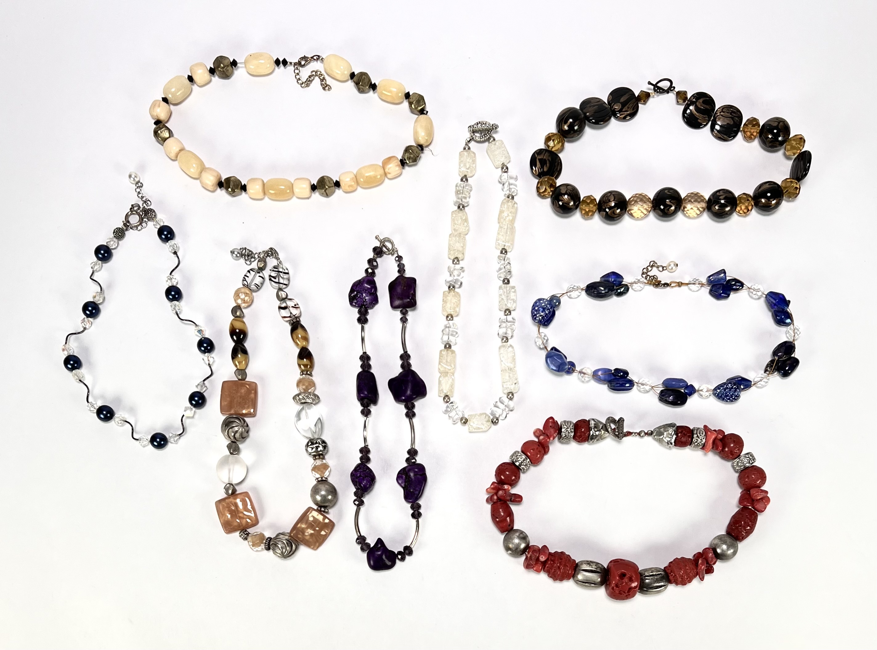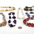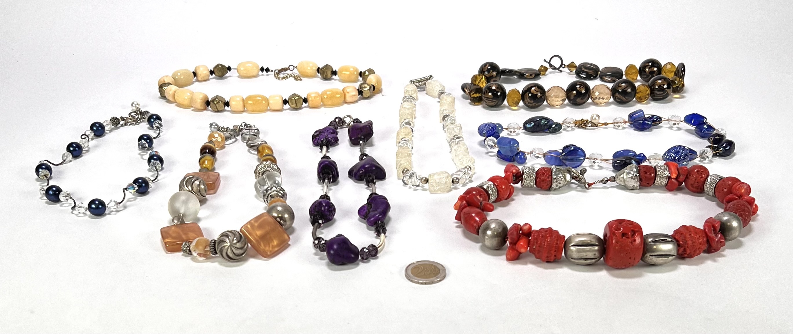 Kettingen van glas en kunststof in een gevarieerde samenstelling. De collectie bevat exemplaren met amethistkleurige elementen, imitatiekoraal en gefacetteerde glaskralen in diverse tinten. De ontwerpen variëren van enkelvoudige strengen tot meervoudige snoeren met metalen accenten. Datering eind 20e eeuw. Geïnteresseerd? Bezoek onze kijkdagen op 10, 11 en 12 april van 11:00 tot 17:00 uur! |