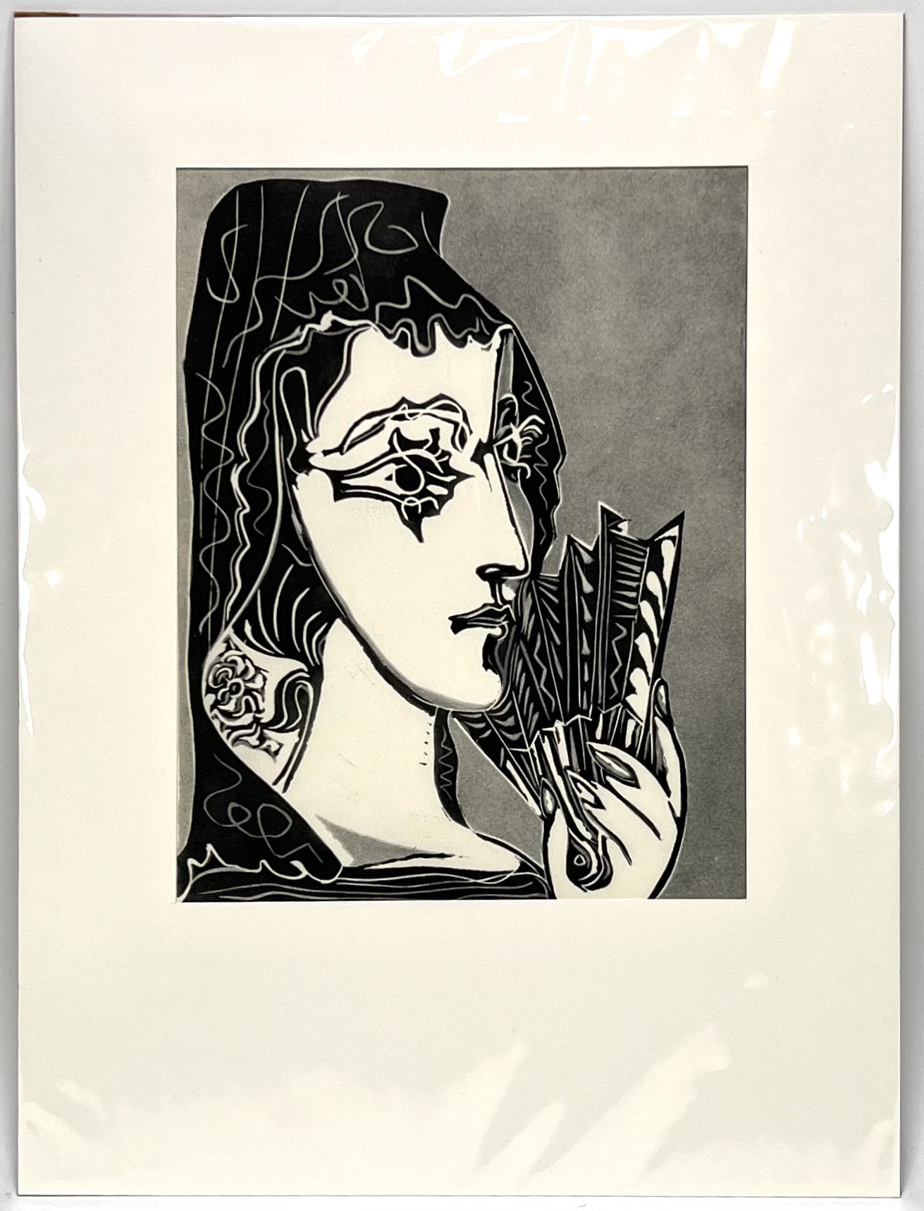 Heliogravure door Pablo Picasso (1881–1979) toont een vrouw met waaier in kubistische stijl, uitgevoerd op papier naar een houtsnede uit 1962. In de plaat gesigneerd en getiteld “L’ Esgagnole”. De voorstelling combineert een scherp geprofileerd gelaat, contrastrijke zwart-witvlakken en een diagonaal geplaatste waaier tegen een egale grijze achtergrond. Uitgegeven door S.P.A.D.E.M. en Cosmopress Genève. Geïnteresseerd? Bezoek onze kijkdagen van 11:00 tot 17:00 uur! |