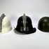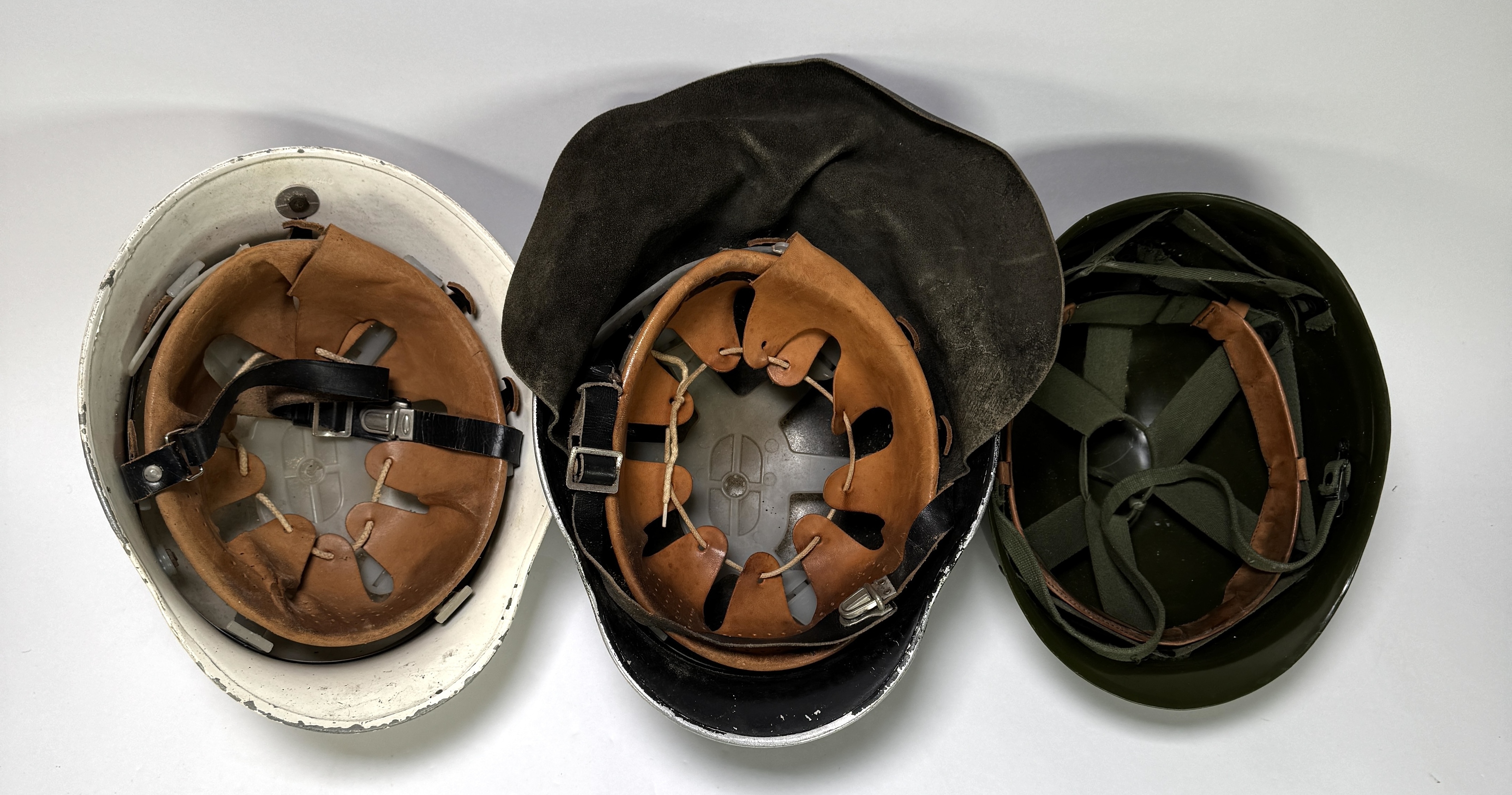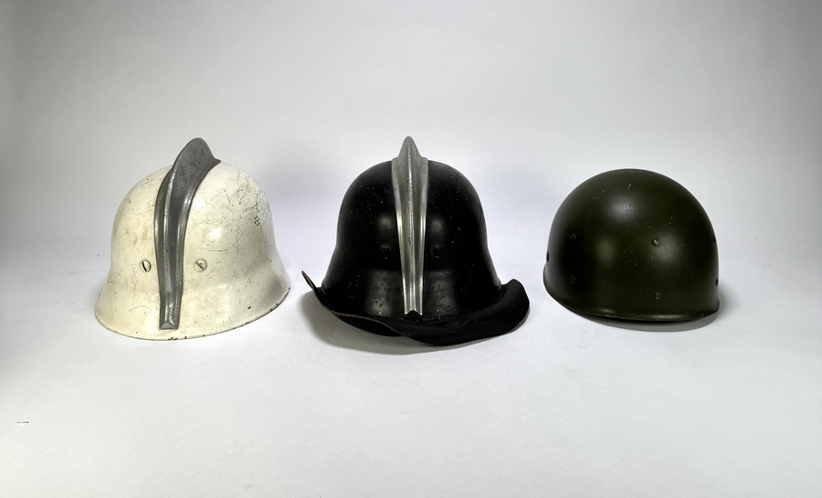 Drie helmen van diverse West-Europese diensten, vervaardigd uit geperst staal met lederen binnenwerken. De verzameling bevat een witte helm met metalen kam, een zwart Adrian helm typerend voor civiele bescherming en een olijfgroene militaire helm. Datering omstreeks 1940–1955 en een Europese herkomst. Klaar om te bieden? Registreer je nu en doe mee aan de veiling! |