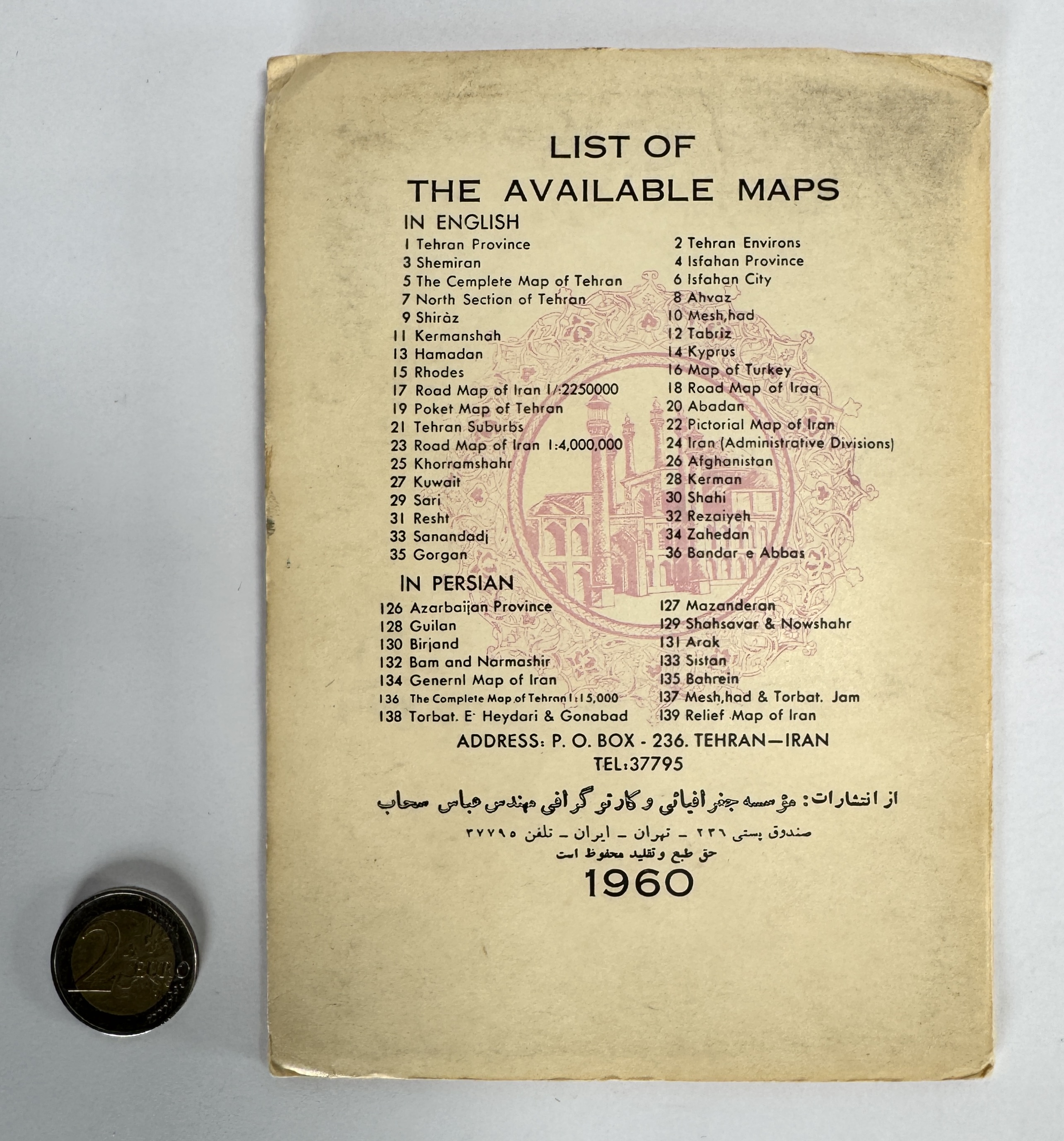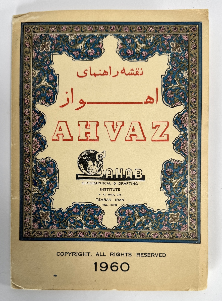 Kaart van Sahab Geographical & Drafting Institute, gedrukt op papier als gevouwen stadsplattegrond van Ahvaz. De uitgave is tweetalig (Engels en Perzisch) en toont het gedetailleerde stratenplan aan weerszijden van de Karun rivier, met bruggen, spoorlijn en belangrijke locaties. Een polychrome omslag met Islam geïnspireerde bloemenrand en SAHAB-logo. De kaart dateert uit 1960. Geïnteresseerd? Bezoek onze kijkdagen op 10, 11 en 12 april van 11:00 tot 17:00 uur! |