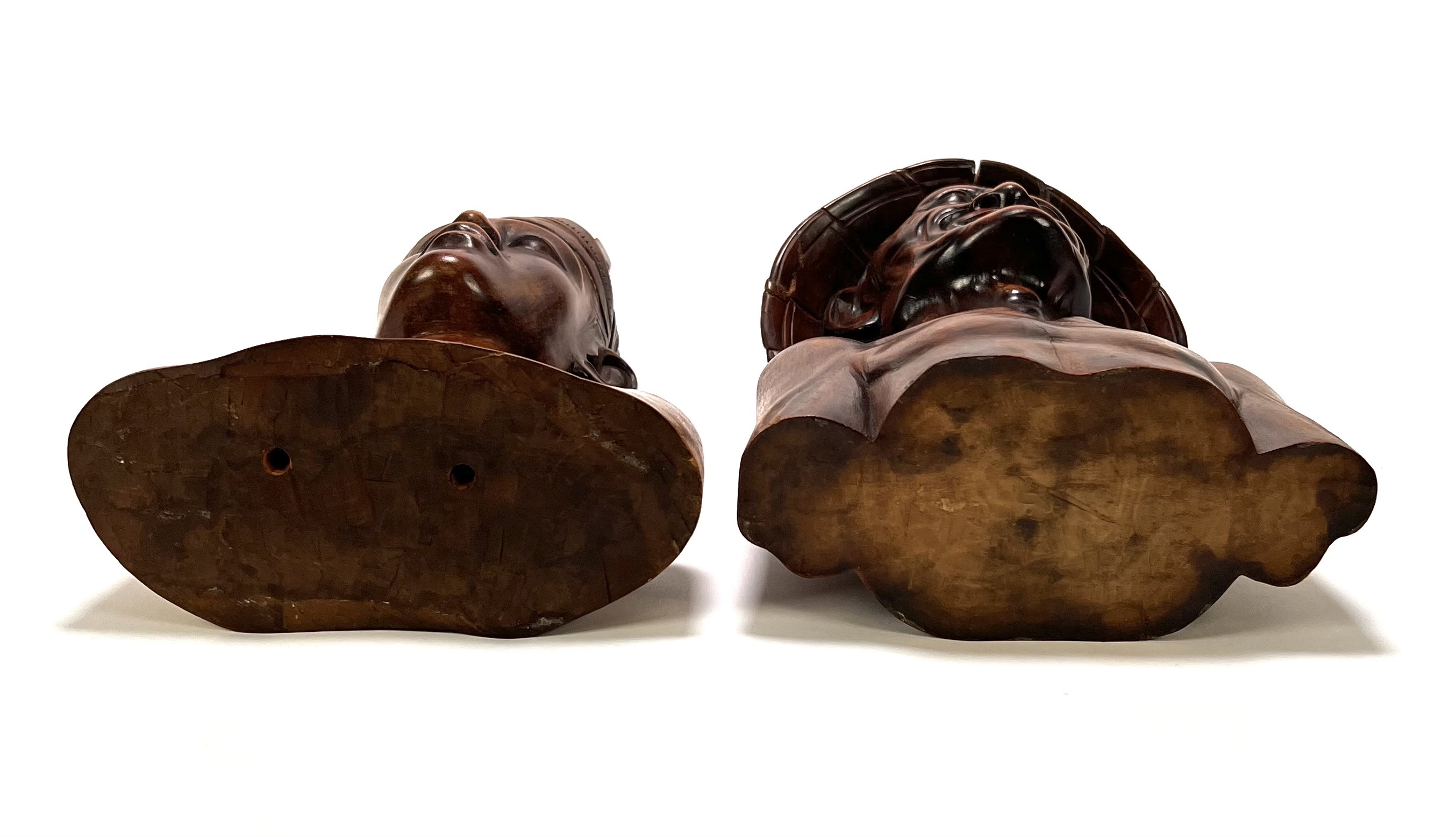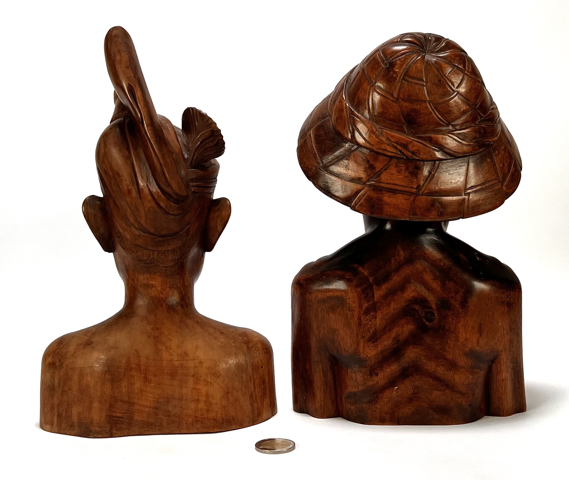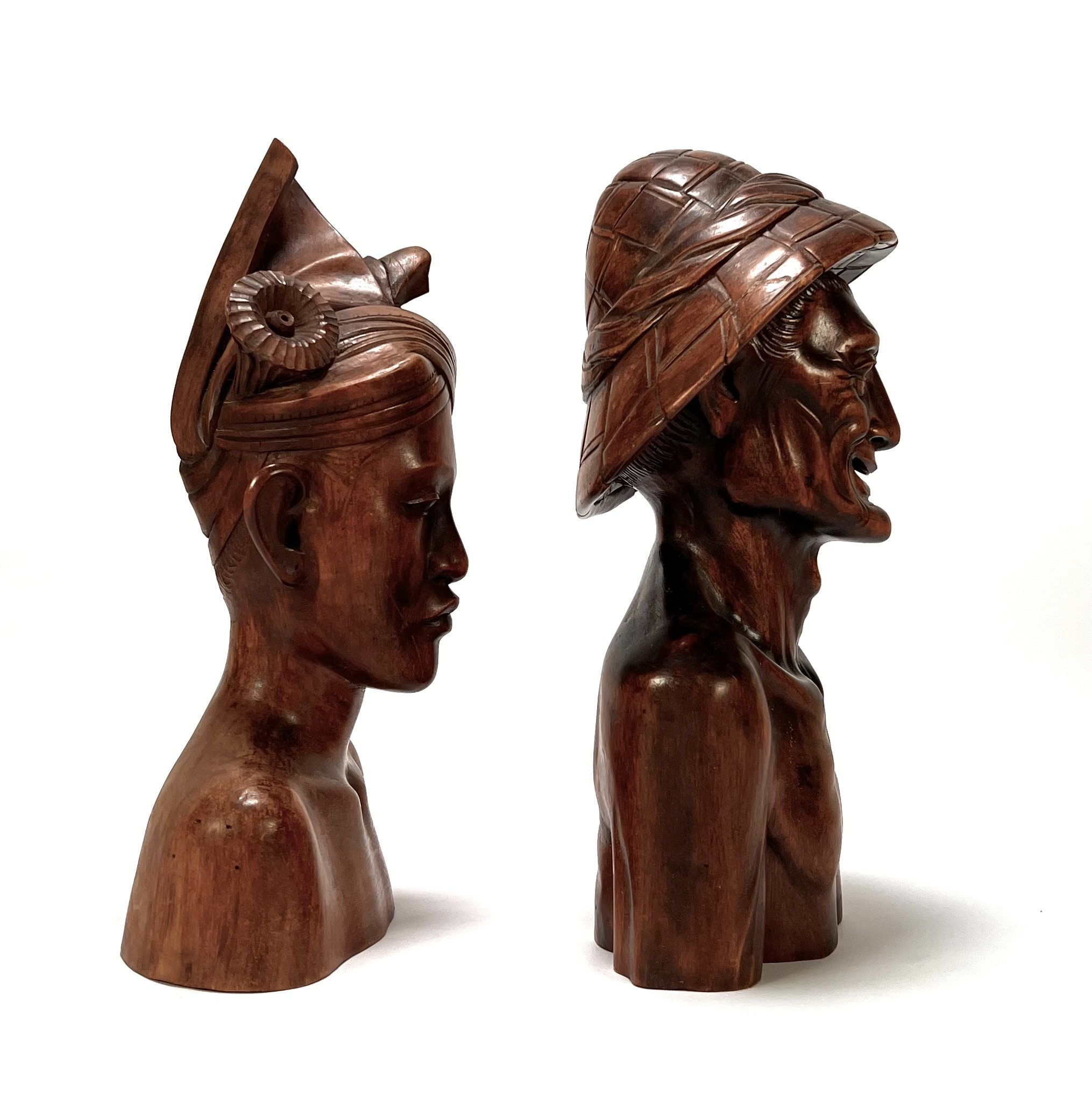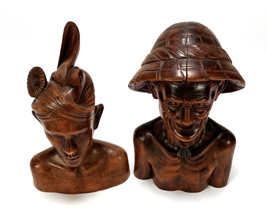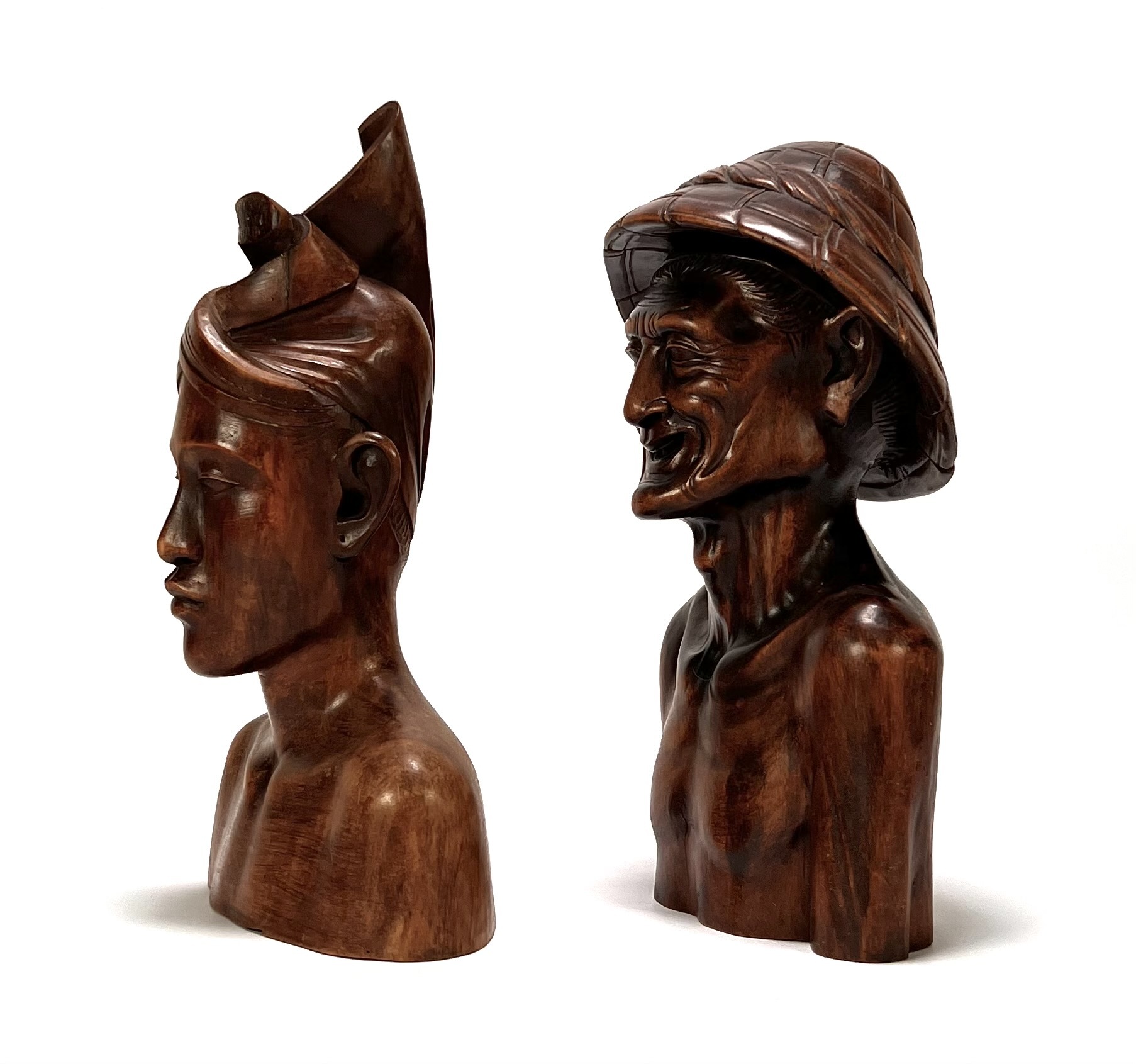 Balinese beelden van coromandelhout, vervaardigd uit massief hout met handmatig houtsnijwerk. Een beeld van een jonge man met traditionele hoofdbedekking en een beeld van een lachende oudere man. De beelden dateren uit midden 20e eeuw en hebben een Indonesische herkomst. Deze beelden zelf beoordelen? Je bent welkom op onze kijkdagen op 10, 11 en 12 april! |
