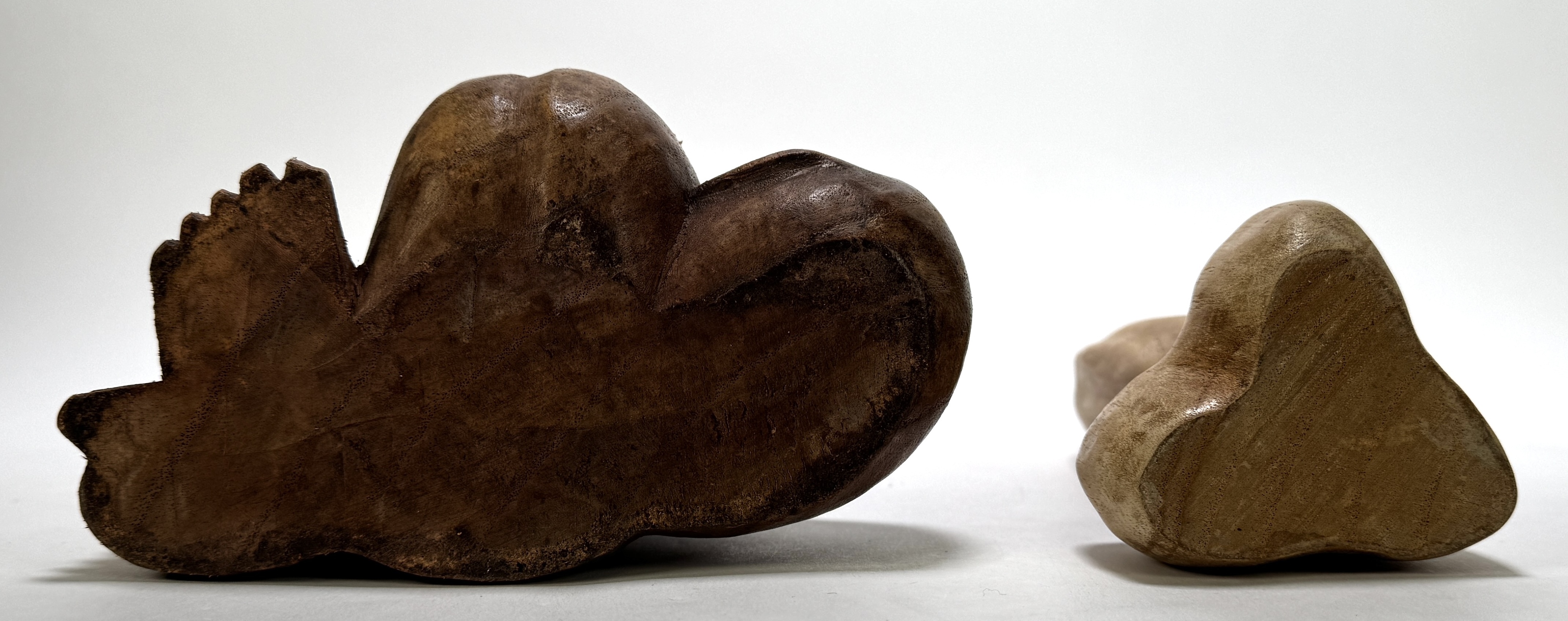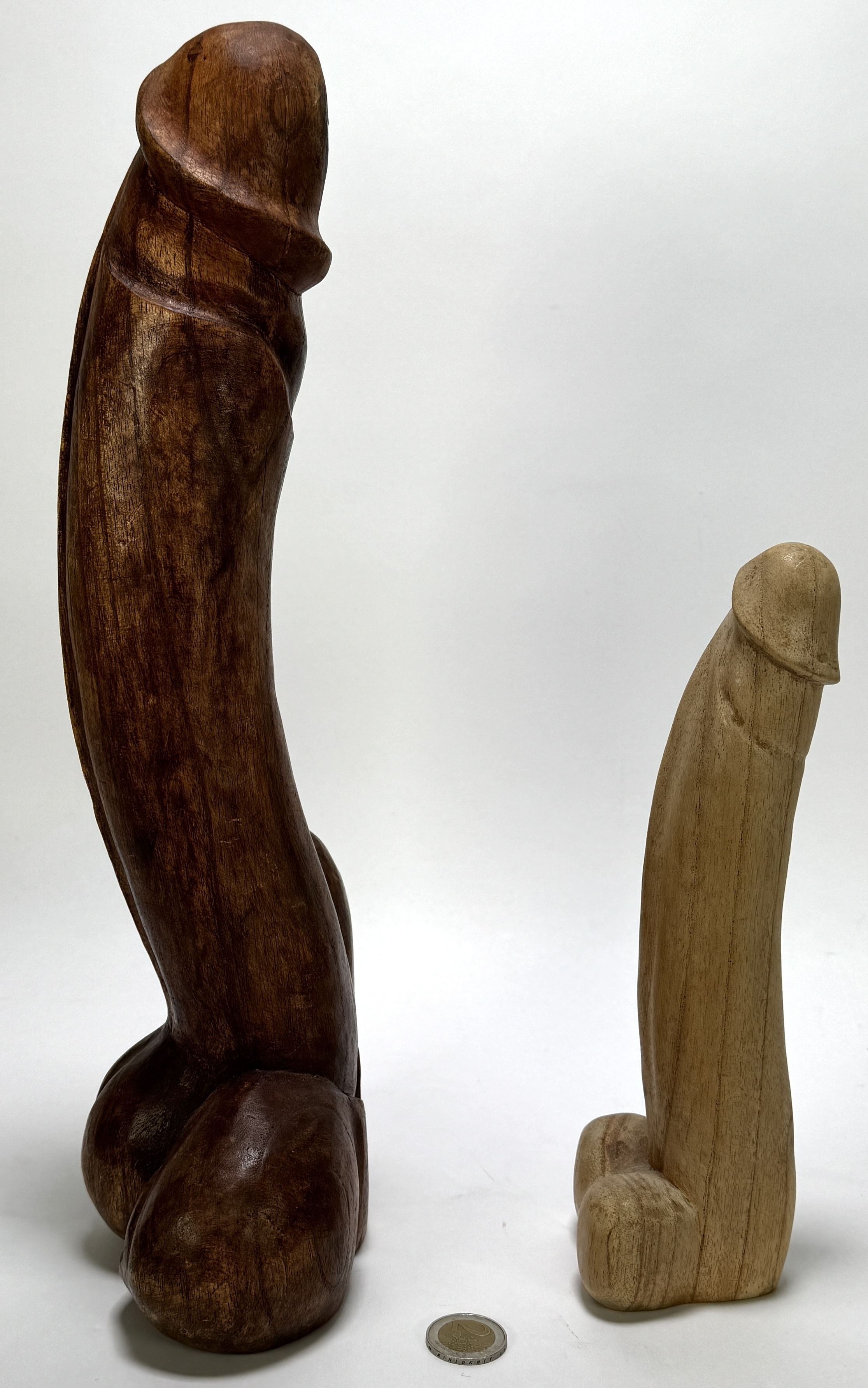 Twee fallus beelden vervaardigd uit hout met handmatig snijwerk en gepolijst oppervlak. Het grotere beeld heeft een donkerbruine toon, gebogen schacht en figurale basis met uitgewerkte voeten, het kleinere beeld is lichter van kleur. De beelden dateren uit de 20e eeuw. Geïnteresseerd? Bezoek onze kijkdagen op 10, 11 en 12 april van 11:00 tot 17:00 uur. |