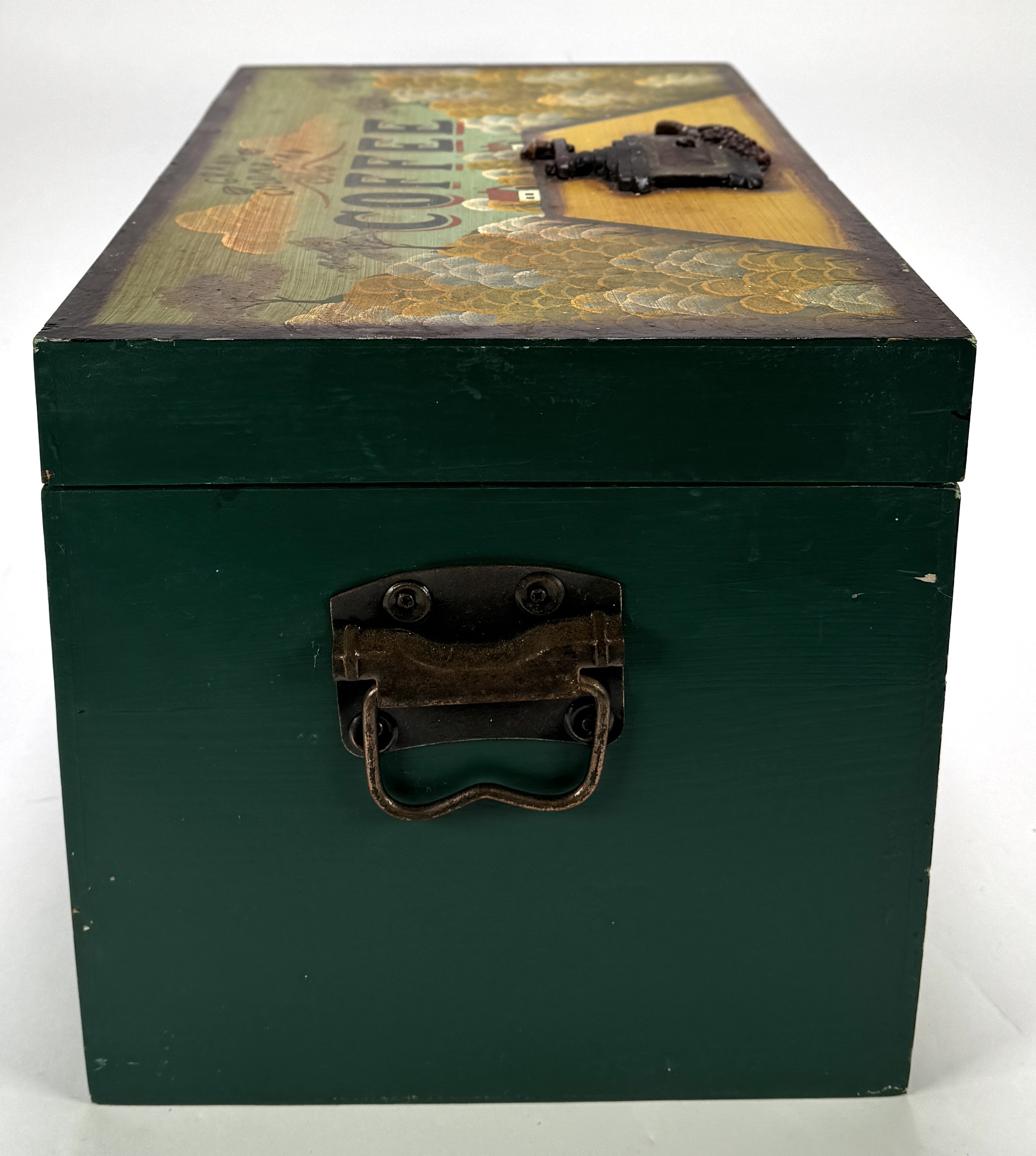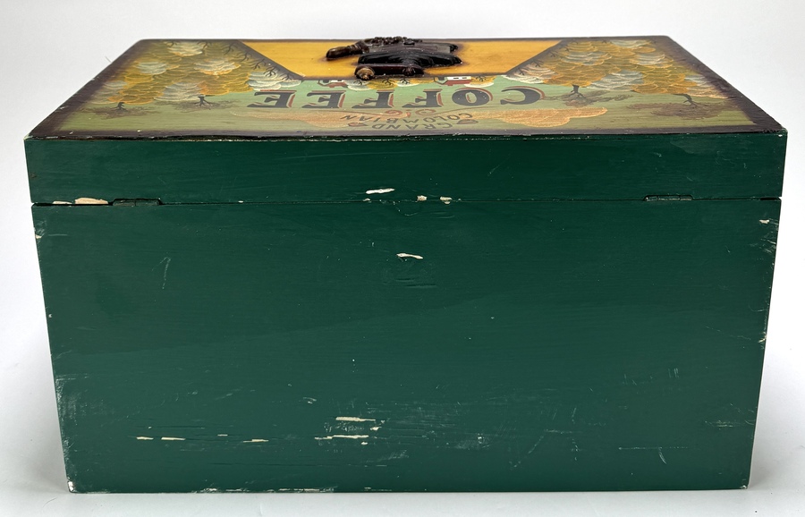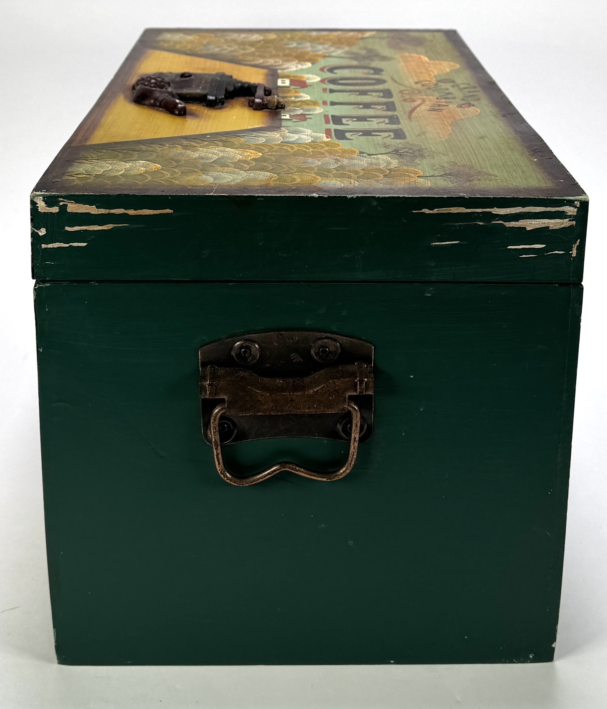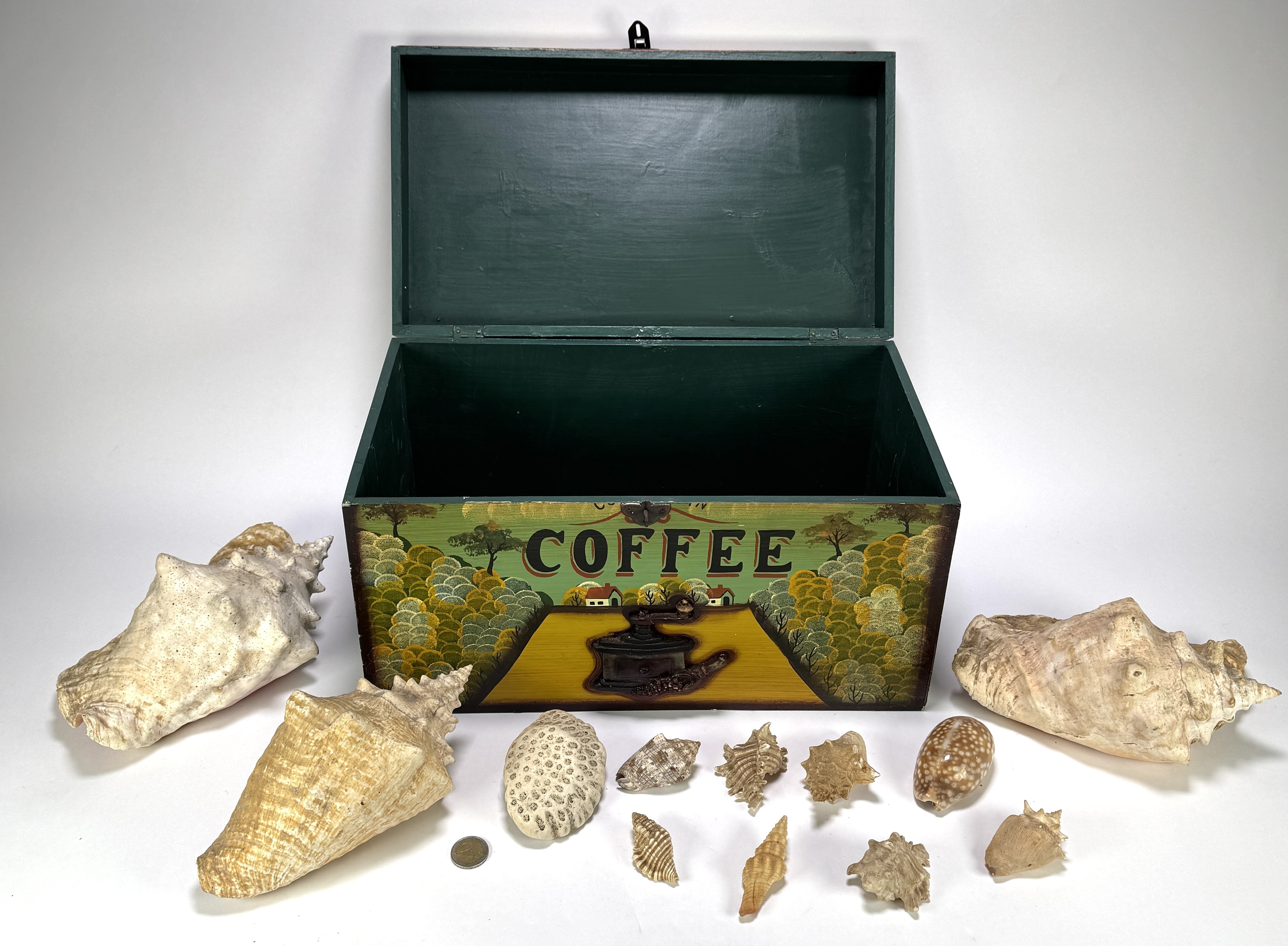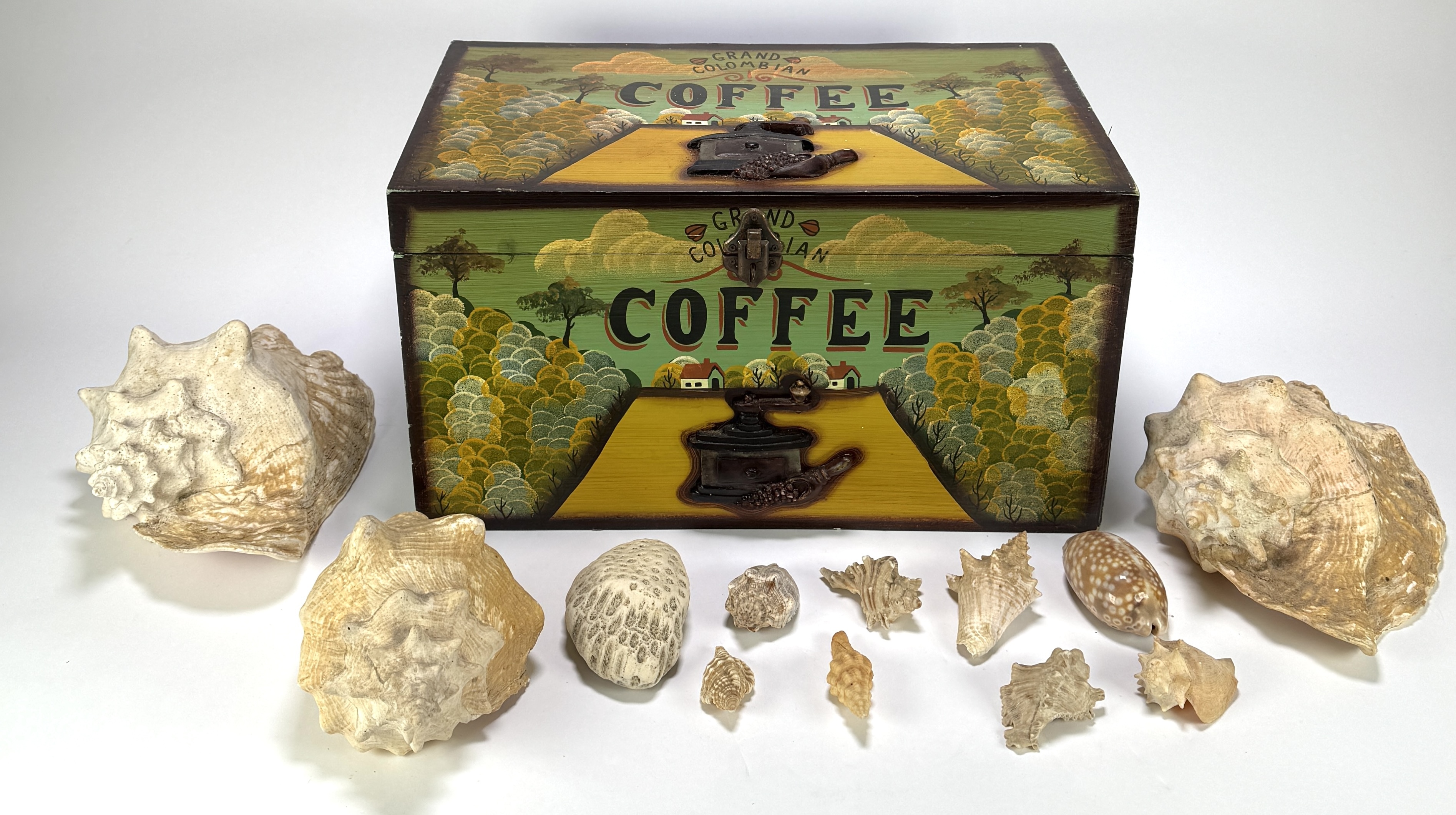 Kist vervaardigd uit groen beschilderd hout met applicaties van houten koffiemolens in reliëf. De deksel en voorzijde tonen een geschilderd landschap met de tekst 'Grand Colombian Coffee'. Bijgevoegd is een verzameling diverse natuurlijke zeeschelpen. De kist dateert uit het laatste kwart van de 20e eeuw en heeft een Europese herkomst. Wil je direct deelnemen? Plaats vanaf 3 april alvast een schriftelijk bod via onze website! |