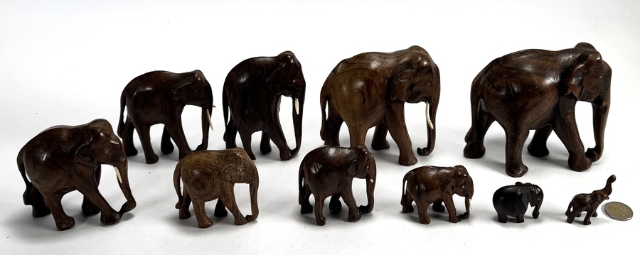 Tien olifanten uitgevoerd in diverse houtsoorten. De kavel bevat olifanten in variërende formaten, deels gedecoreerd met slagtanden van been en tonen naturalistische vormgeving. De olifanten dateren uit midden 20e eeuw en hebben een herkomst in Afrika. Klaar om te bieden? Registreer je nu en doe mee aan de veiling! |