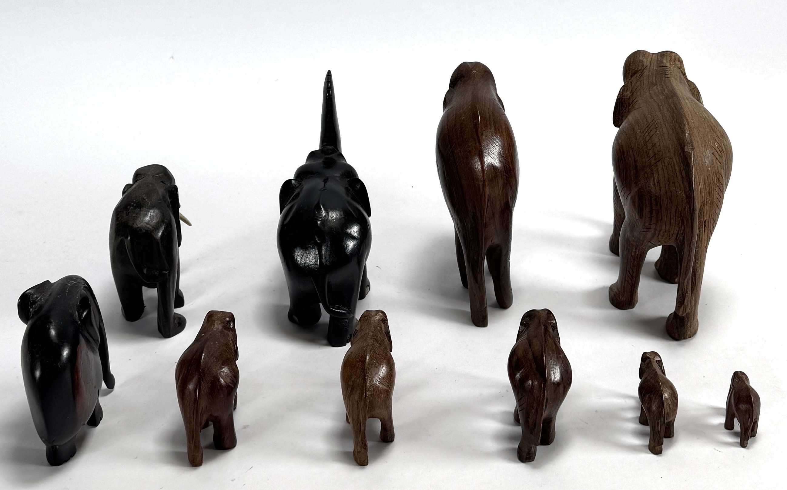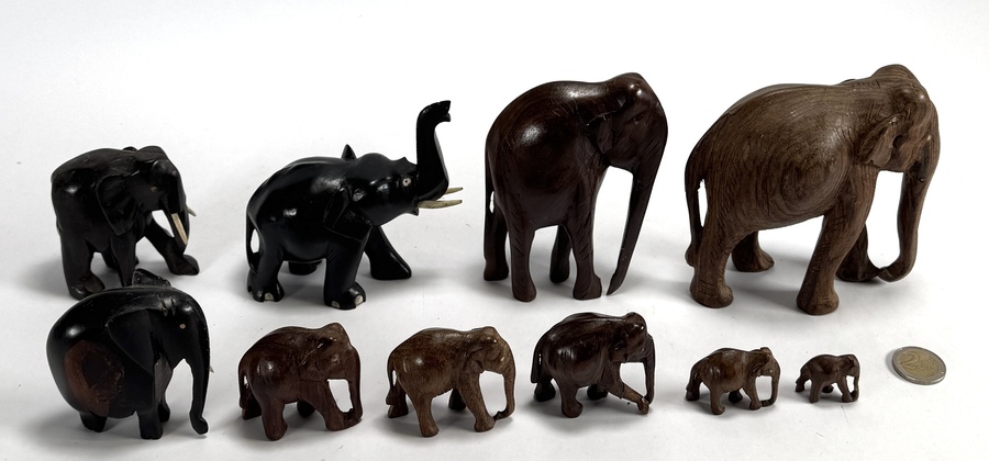 Tien olifanten vervaardigd uit hardhout met handgesneden en gepolijste afwerking. De tien exemplaren variëren in formaat en houtsoort, waaronder donker gebeitste figuren en lichter generfde varianten; enkele hebben slagtanden van been. De olifanten dateren uit midden 20e eeuw en hebben een herkomst in Afrika. Eerst de olifanten zien voordat je biedt? Bezoek onze kijkdagen op 10, 11 en 12 april! |