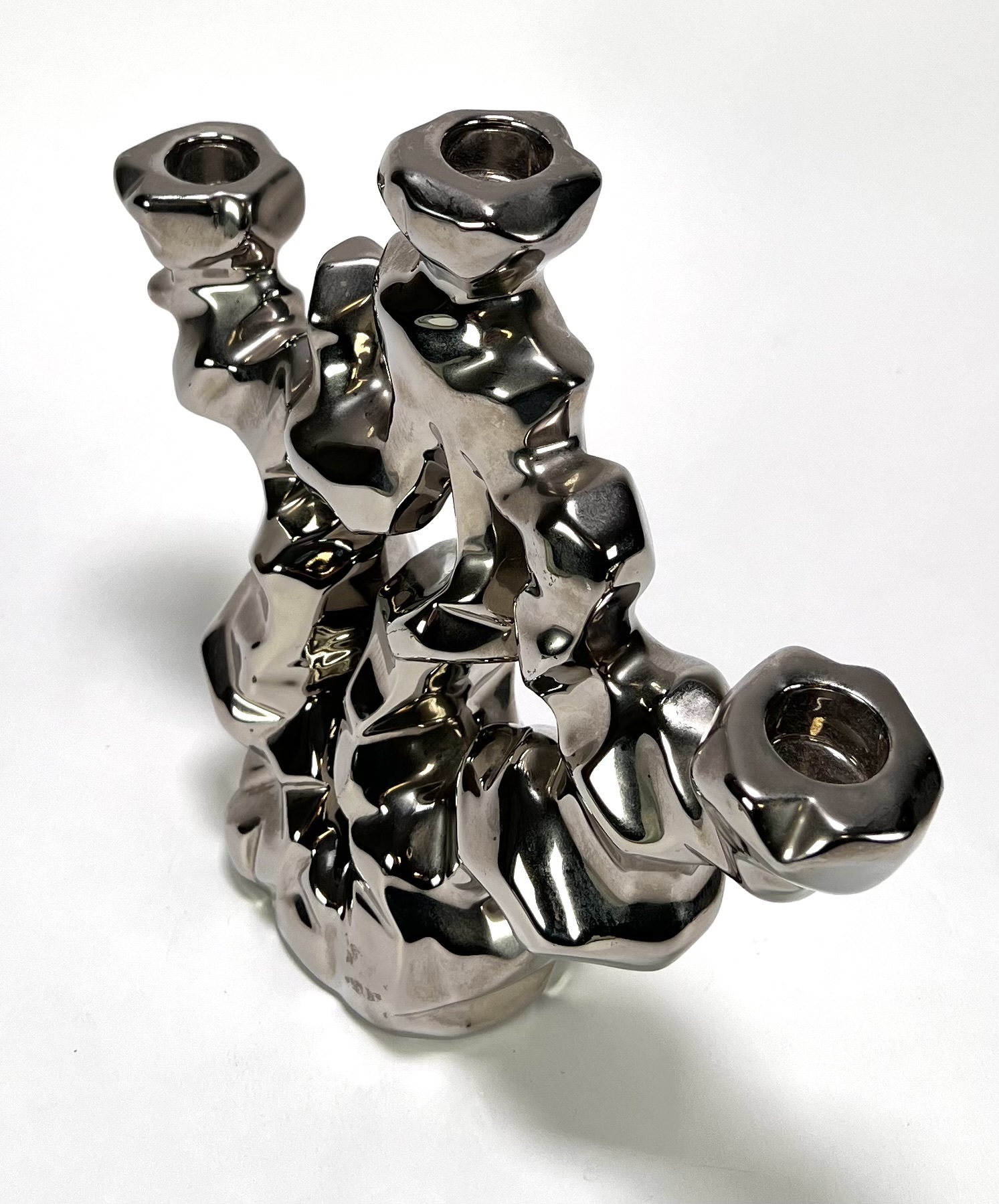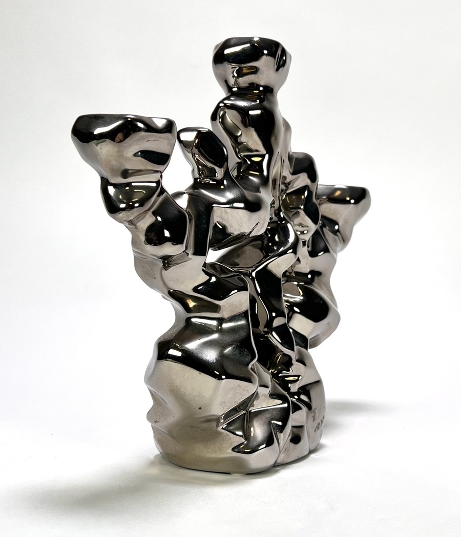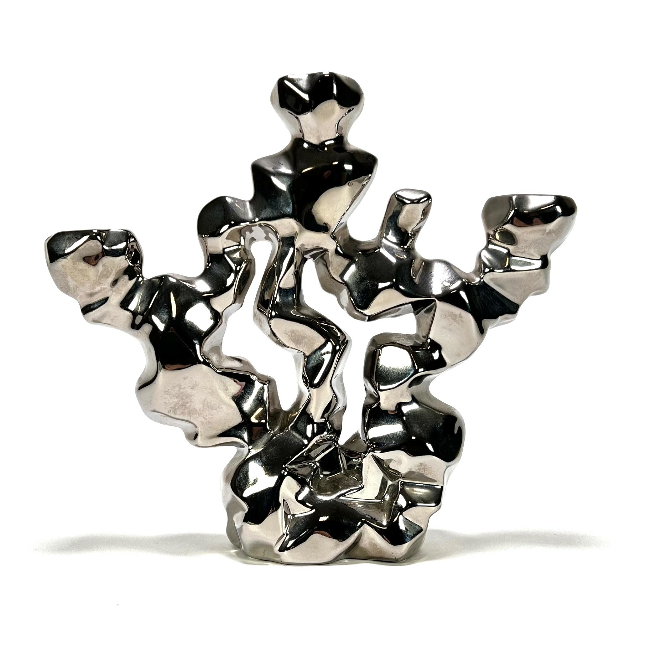 Kaarsenstandaard in postmoderne stijl, vervaardigd uit keramiek met een hoogglanzend zilverkleurig glazuur. De kandelaar vertoont een grillige, organische structuur die doet denken aan vloeibaar metaal. De asymmetrische compositie biedt plaats aan drie kaarsen op variërende niveaus. Datering eind 20e eeuw en een Europese herkomst. Geïnteresseerd? Bezoek onze kijkdagen op 10, 11 en 12 april van 11:00 tot 17:00 uur! |