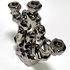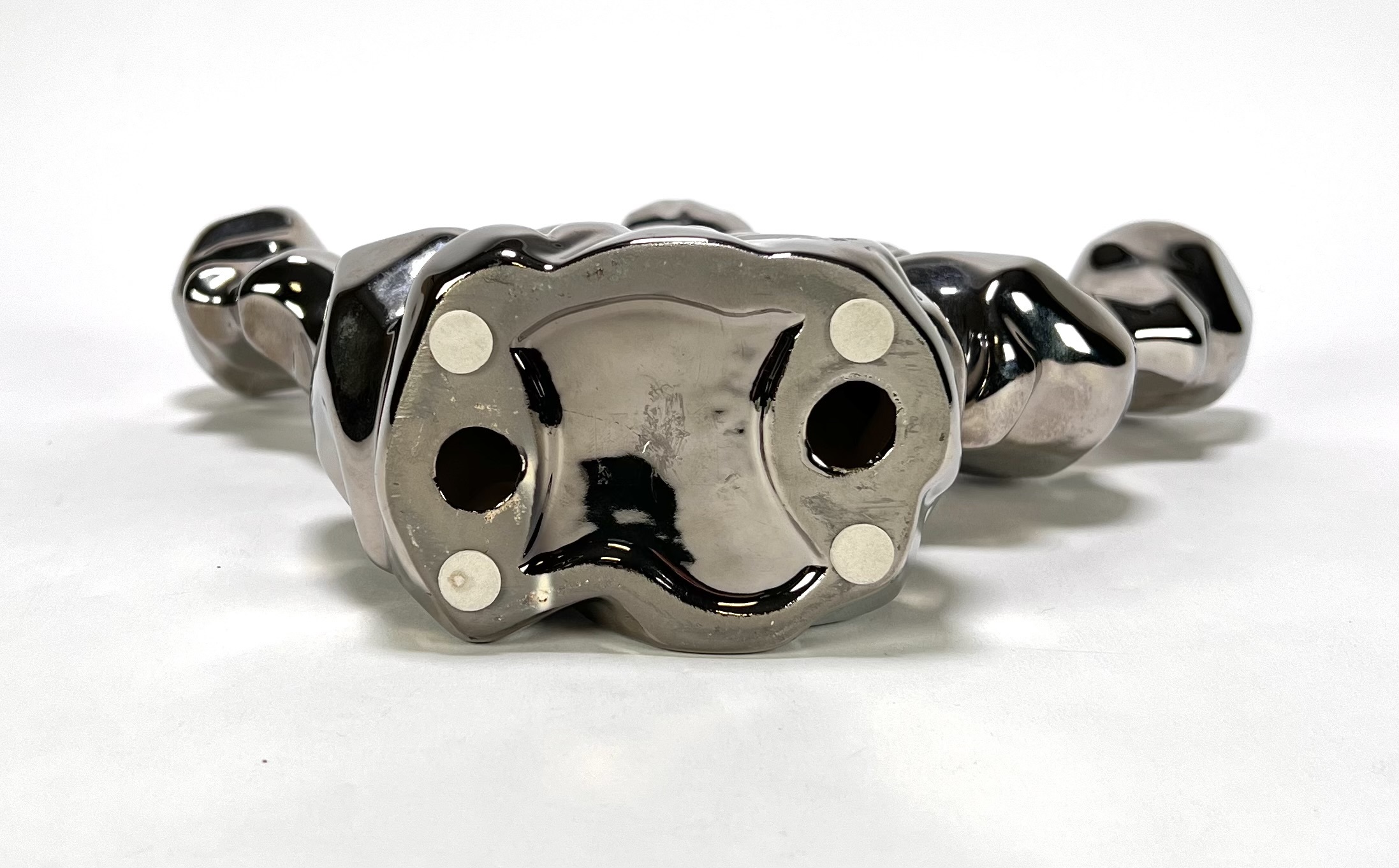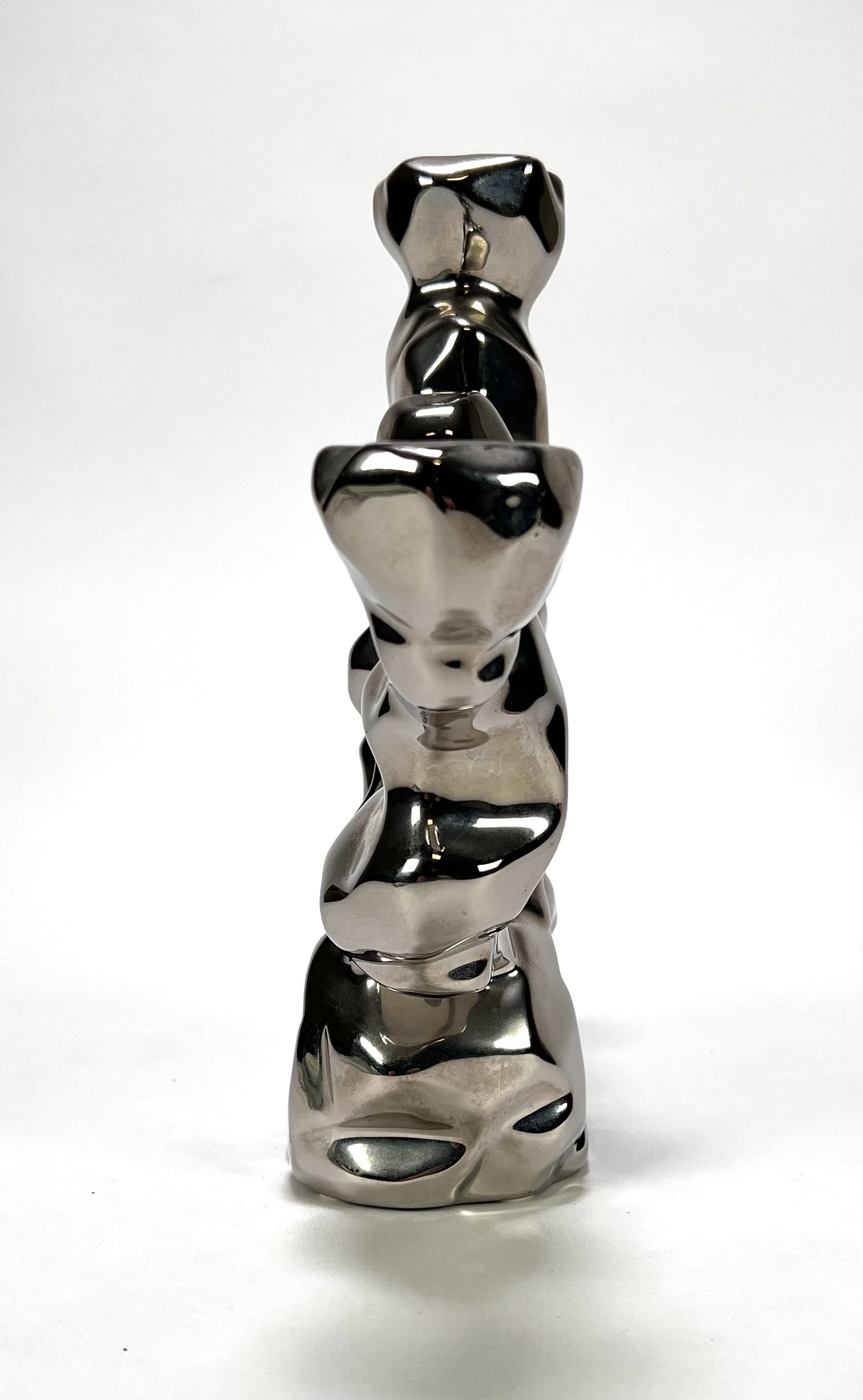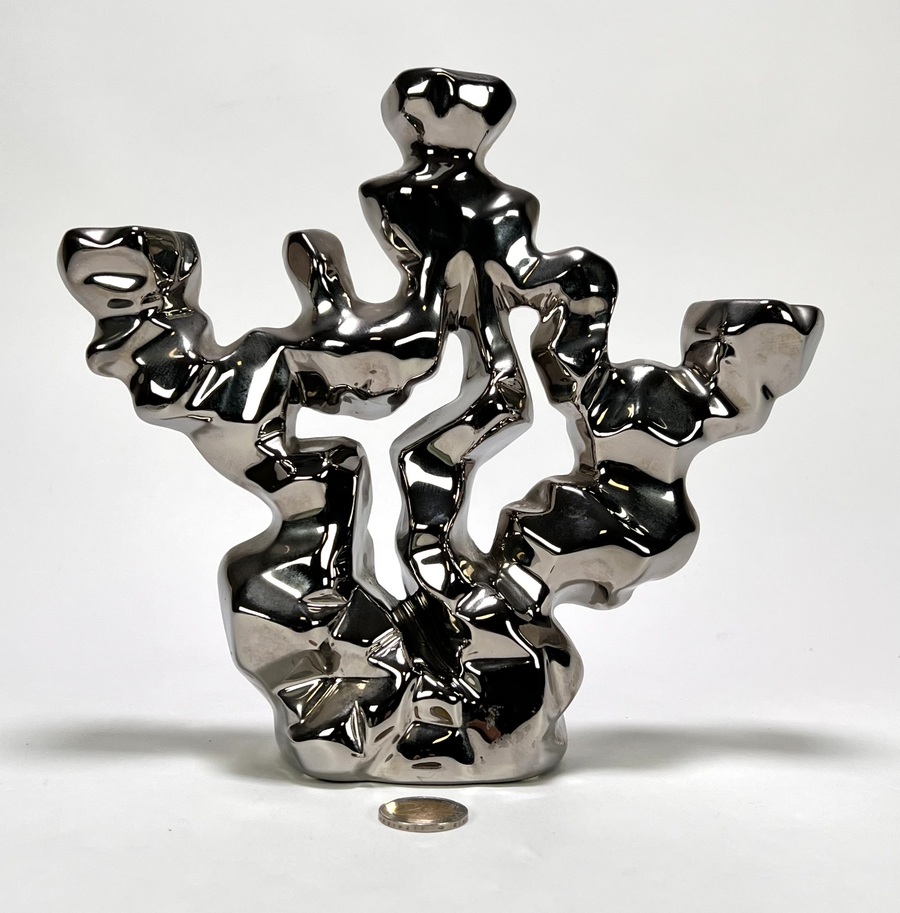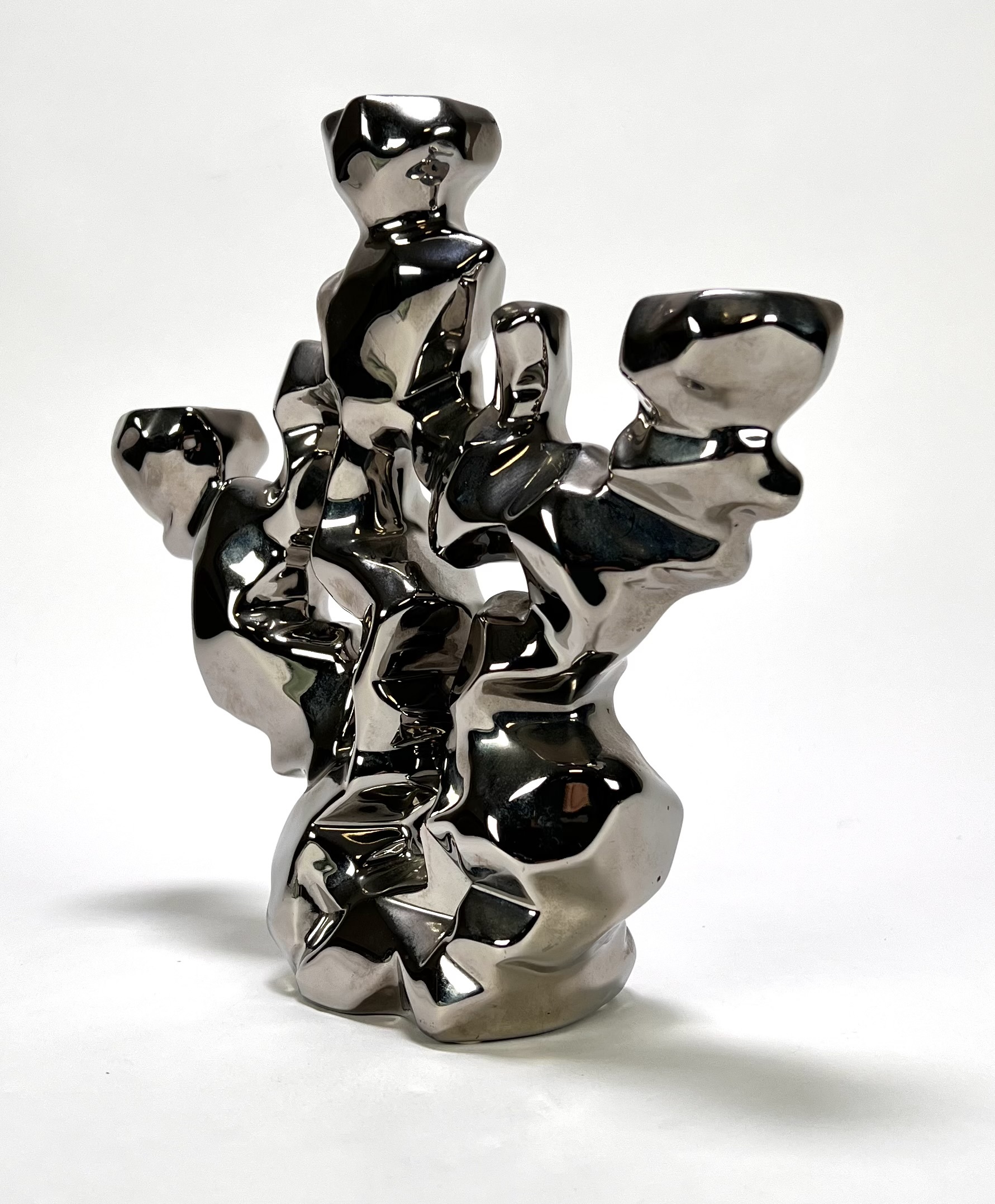 Kaarsenstandaard in postmoderne stijl, vervaardigd uit keramiek met een hoogglanzend zilverkleurig glazuur. De kandelaar vertoont een grillige, organische structuur die doet denken aan vloeibaar metaal. De asymmetrische compositie biedt plaats aan drie kaarsen op variërende niveaus. Datering eind 20e eeuw en een Europese herkomst. Geïnteresseerd? Bezoek onze kijkdagen op 10, 11 en 12 april van 11:00 tot 17:00 uur! |