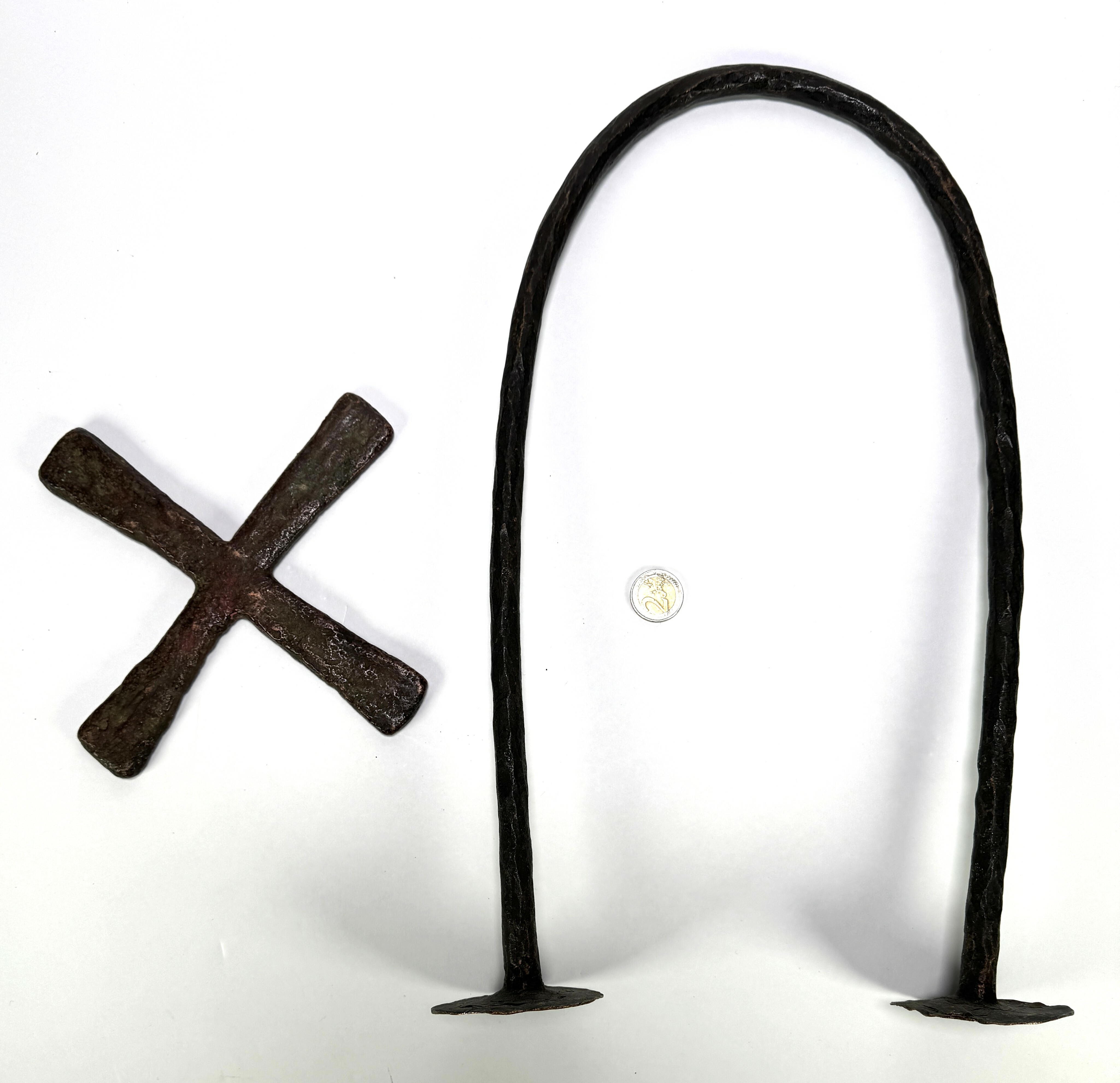 Katangakruis en Boloko uit de Democratische Republiek Congo, 20e eeuw, uitgevoerd in gegoten koper en gesmeed ijzer. Het kavel bestaat uit een Handa-kruisvorm en een hoefijzervormige Kusu-valuta. Beide objecten dienden als traditionele betaalmiddelen en bruidsschat binnen de Centraal-Afrikaanse handelscultuur. Eerst deze betaalmiddelen zien voordat je biedt? Bezoek onze kijkdagen op 10, 11 en 12 april! |