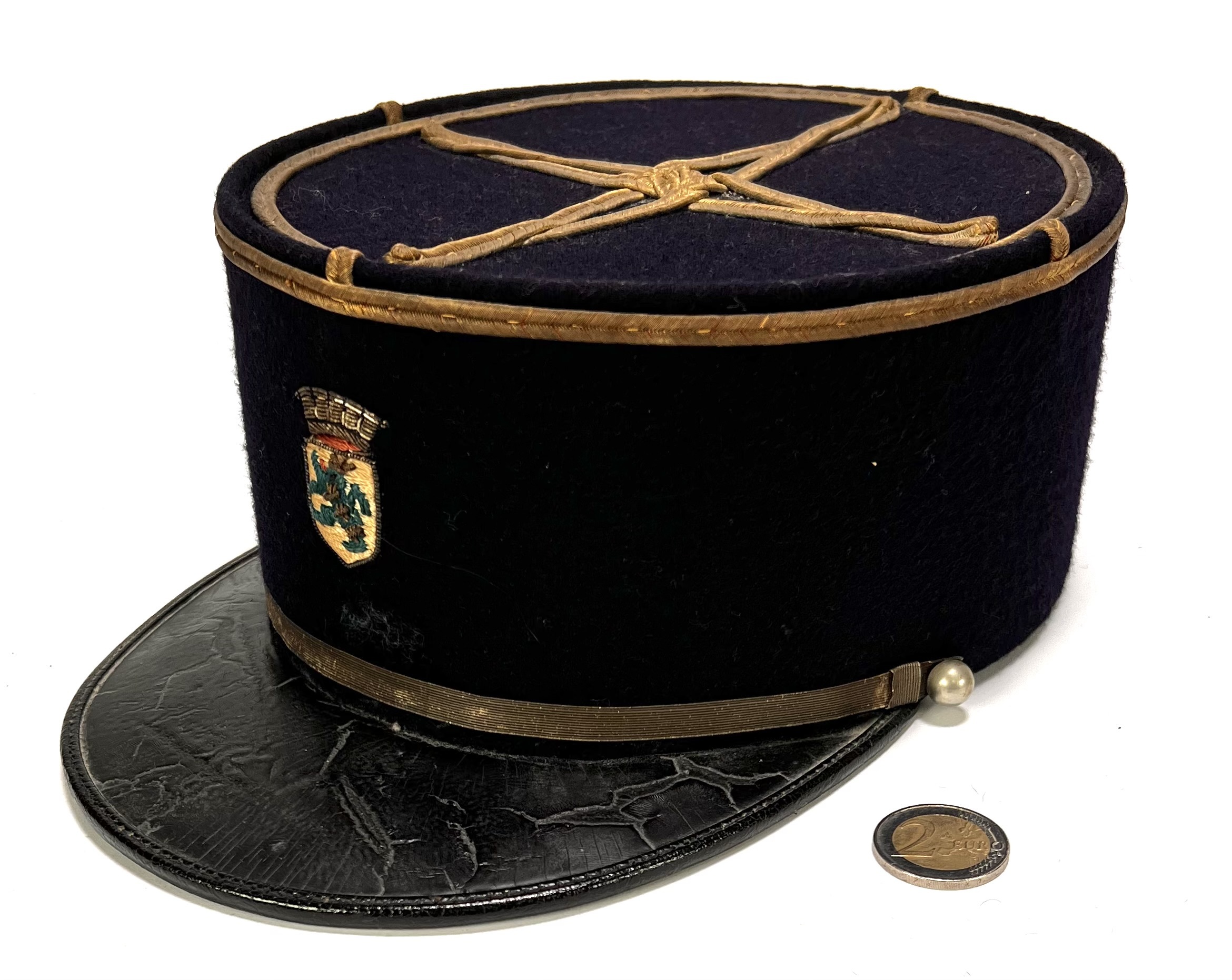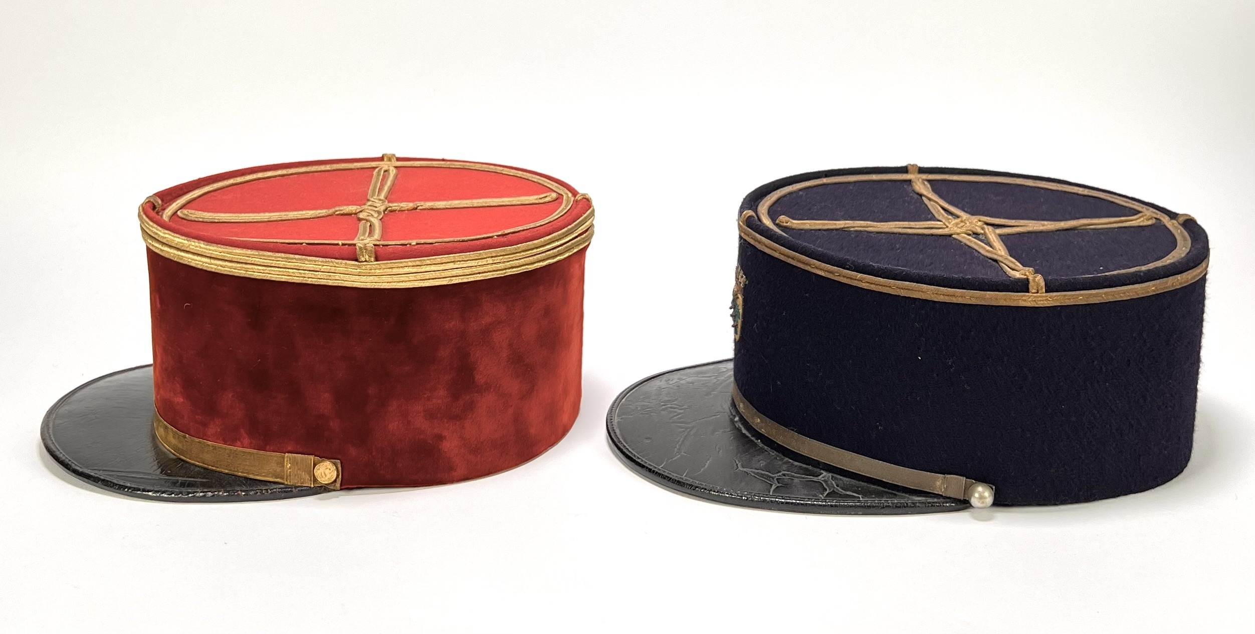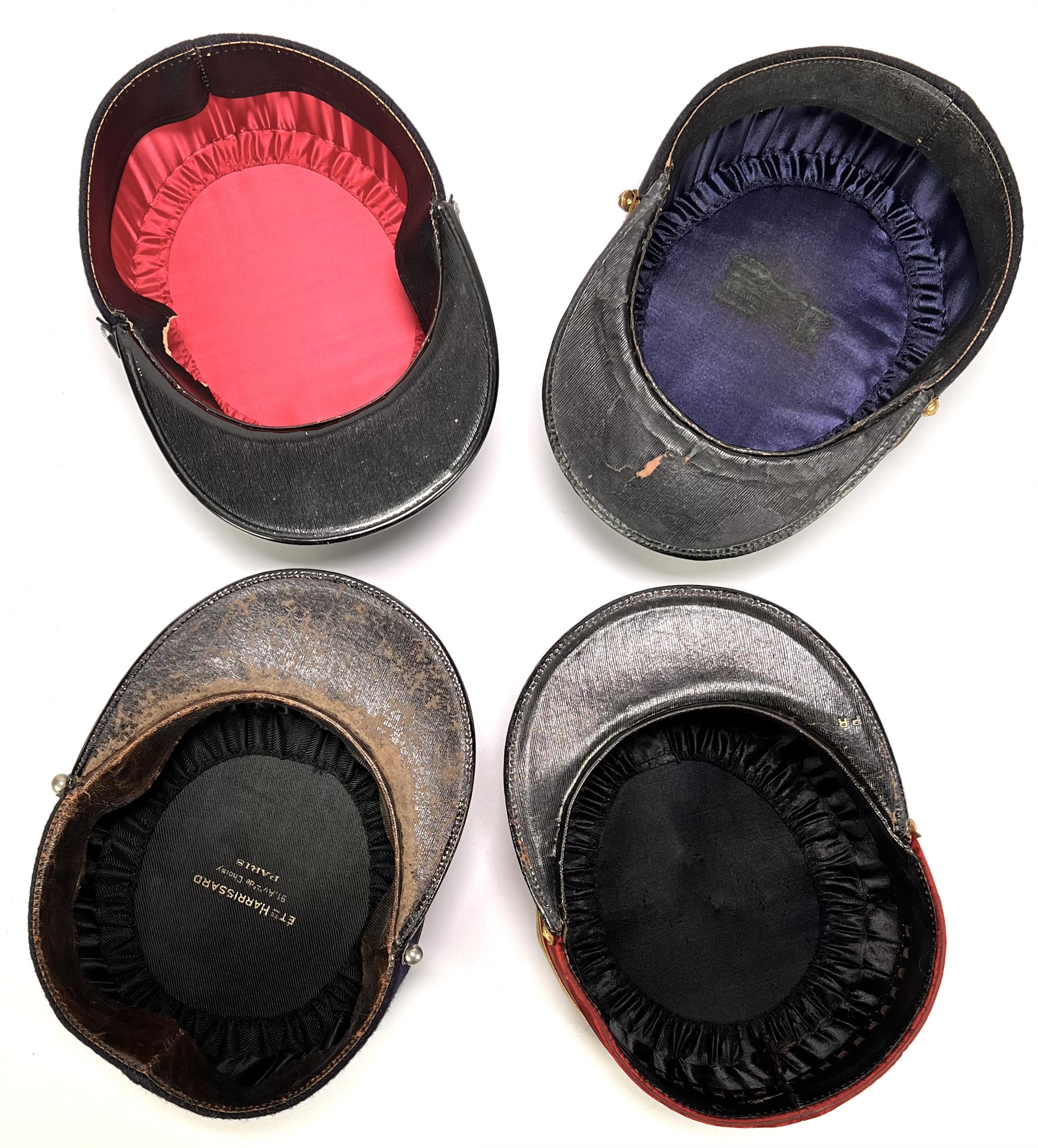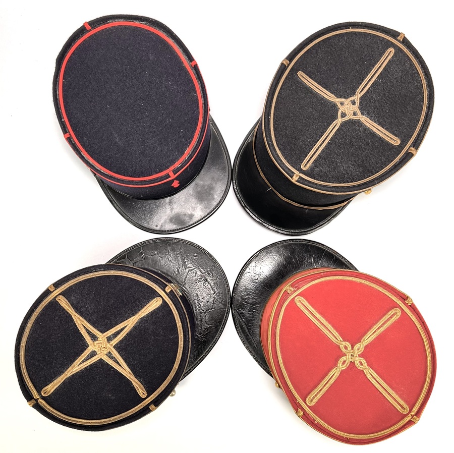 Vier kepies bestaande uit één pompier kepie en drie militaire kepies, vervaardigd uit wol en vilt met lederen kleppen en cannetille-borduurwerk. De hoofddeksels hebben cilindrische vormen met vlakke bovenzijden en koorddecoraties in kruisvorm. Kleurstellingen omvatten rood met goudkleurige biezen en donkerblauw met contrasterende afwerkingen. De set omvat diverse Franse modellen, waaronder een officieruitvoering met gouden galon en een Sapeurs-Pompiers kepie met rode biezen. Datering eerste helft 20e eeuw. De kepies zelf beoordelen? Je bent welkom op onze kijkdagen op 10, 11 en 12 april! |