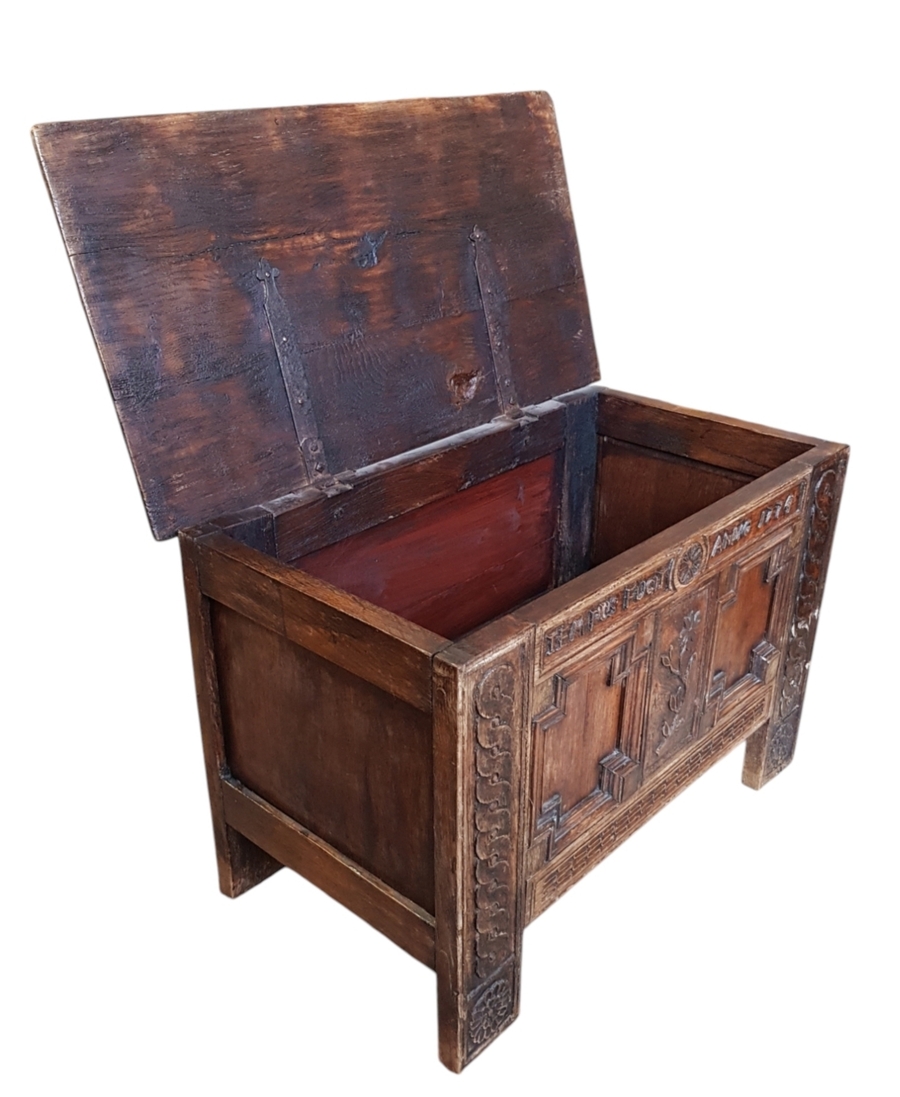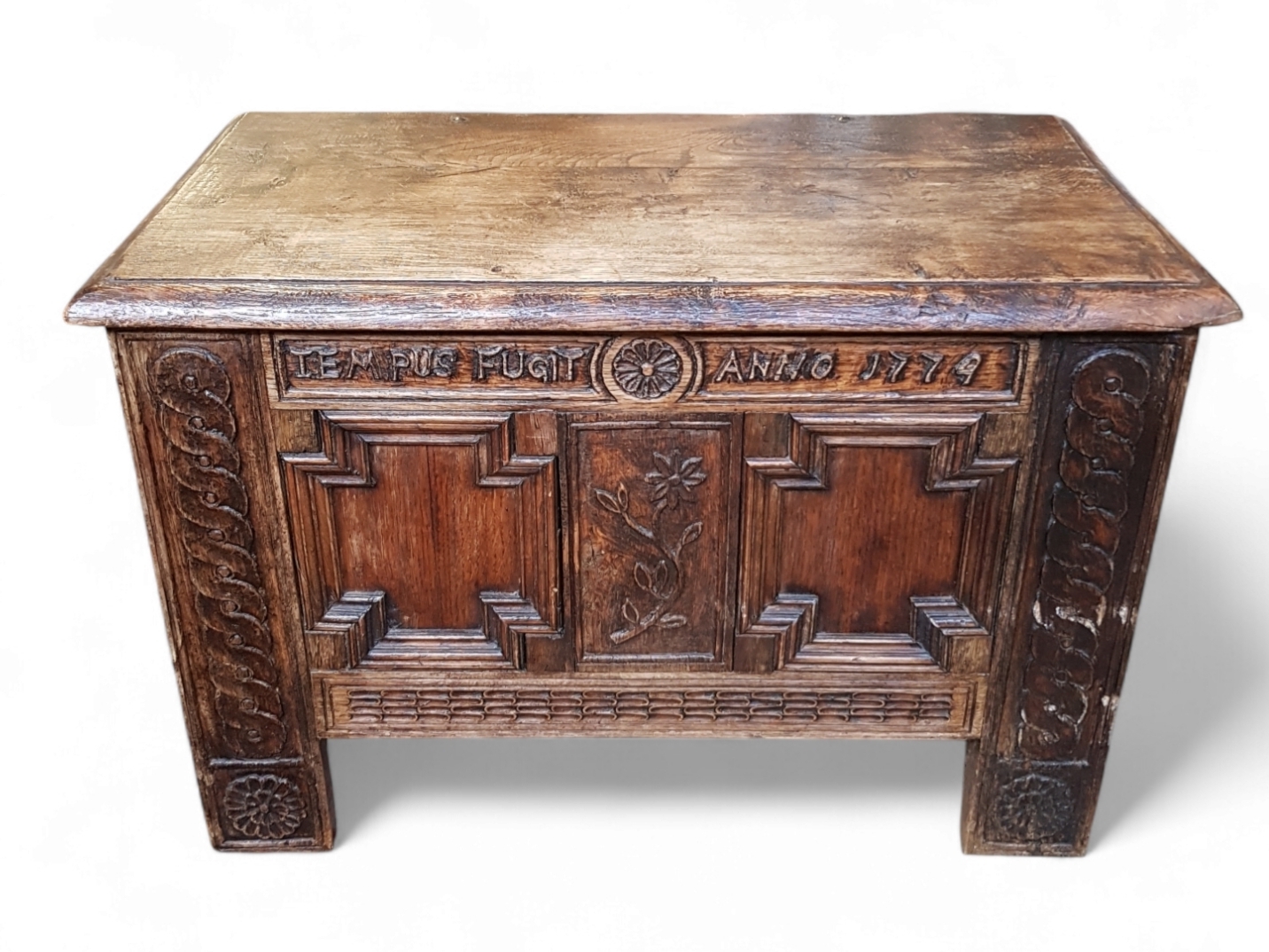 Kist in de stijl van de Noord-Nederlandse renaissance, vervaardigd uit massief eikenhout met cannelures en een ingesneden tekst decoratie. De voorzijde toont drie geometrisch ingedeelde panelen geflankeerd door rijk gestoken pilasters met krulmotieven. Boven de panelen is de tekst "Tempus Fugit Anno 1774" zichtbaar. De kist dateert uit de 19e eeuw en heeft een herkomst in Nederland. Klaar om te bieden? Registreer je nu en doe mee aan de veiling! |