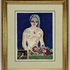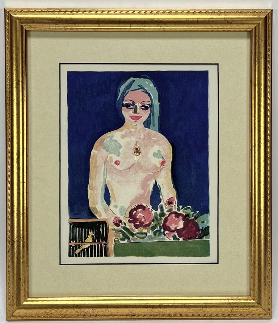 Houtsnede door Kees van Dongen (1877–1968) toont een vrouwelijk naakt getiteld "Le balcon fleuri" in fauvistische stijl, uitgevoerd in kleurendruk op papier. De compositie combineert een diepblauwe achtergrond met een floraal stilleven en een karakteristieke gele vogel in kooi. Deze druk uit 1955 weerspiegelt de kunsthistorische School van Parijs, het werk zit in een goudkleurige lijst achter glas. Wil je deze houtsnede in het echt bekijken? Kom naar de kijkdagen! |
