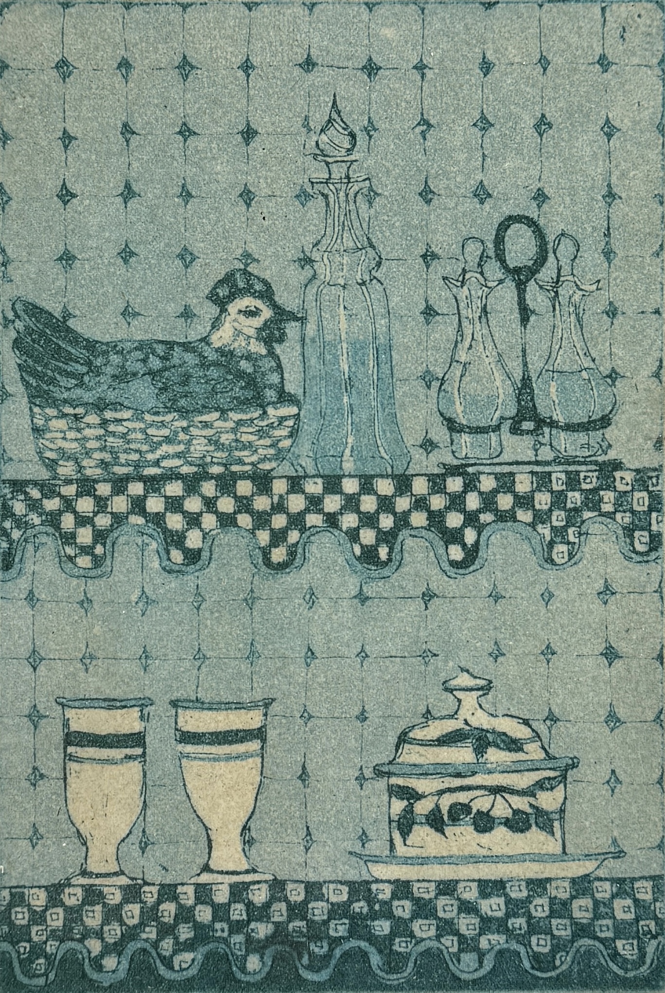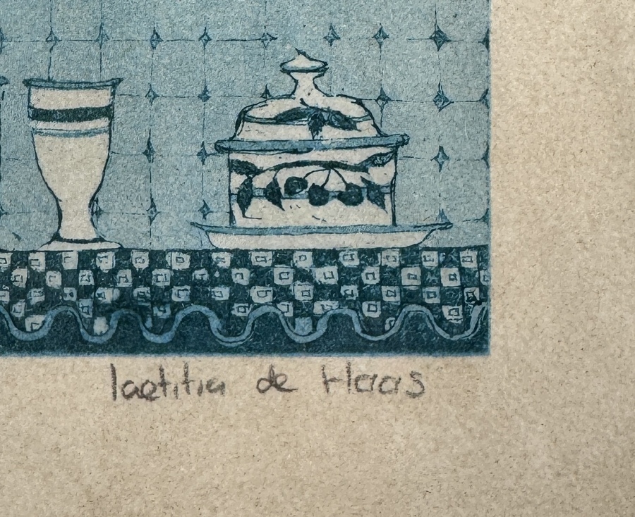 Kleurenets door Laetitia de Haas (1948) toont een gestileerd interieur in modernistische stijl, gedrukt op papier. Twee horizontale planken dragen een een mand met kip, karaf, bekers en een gedekte schaal met kersenmotief. De achtergrond is opgebouwd uit een repetitief sterpatroon in blauwgroene tinten. Gesigneerd in potlood onder de plaatrand. Datering eind 20e eeuw, Nederlandse herkomst. Zeker zijn van deelname? Plaats vanaf 3 april een schriftelijk bod online! |