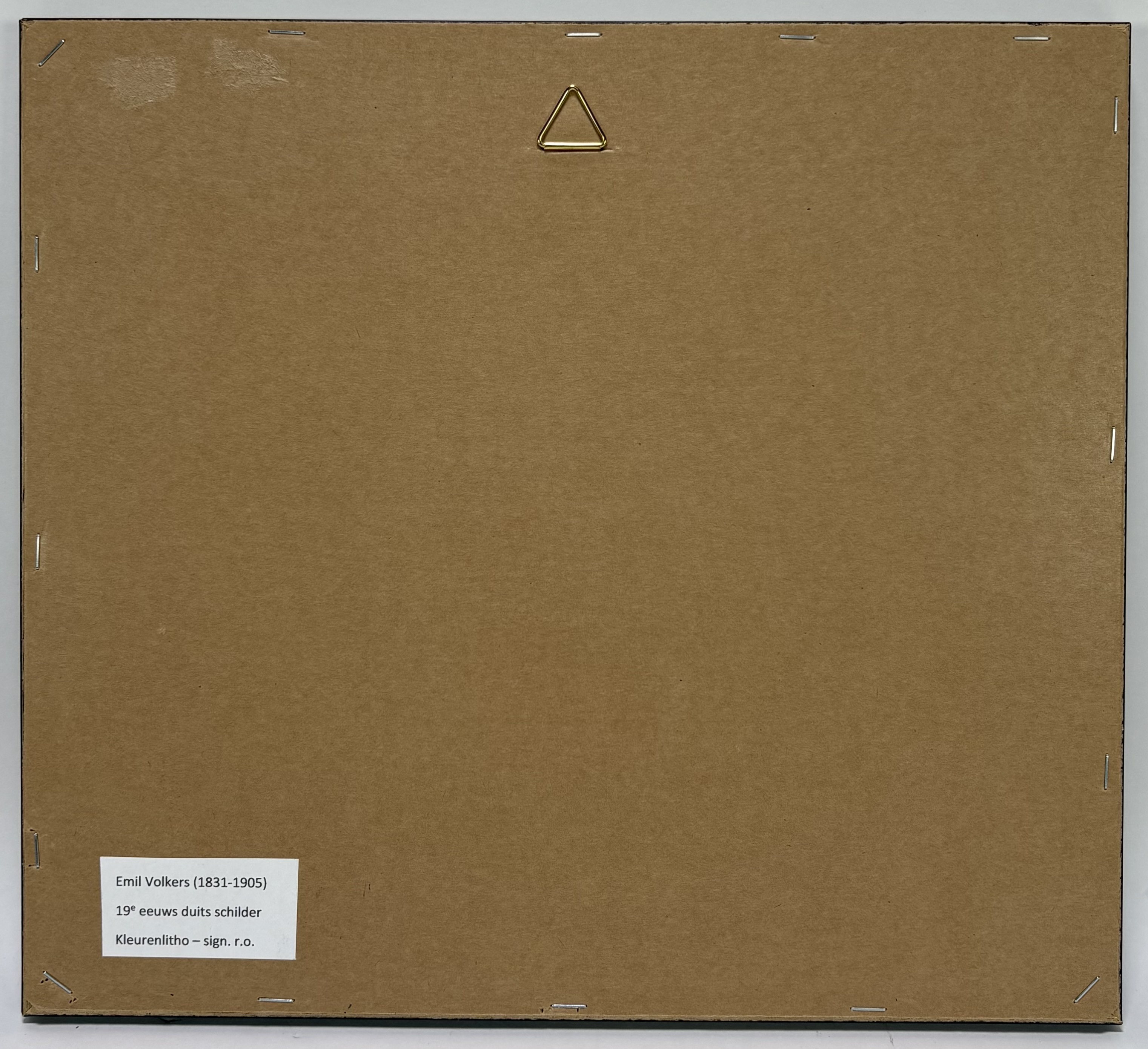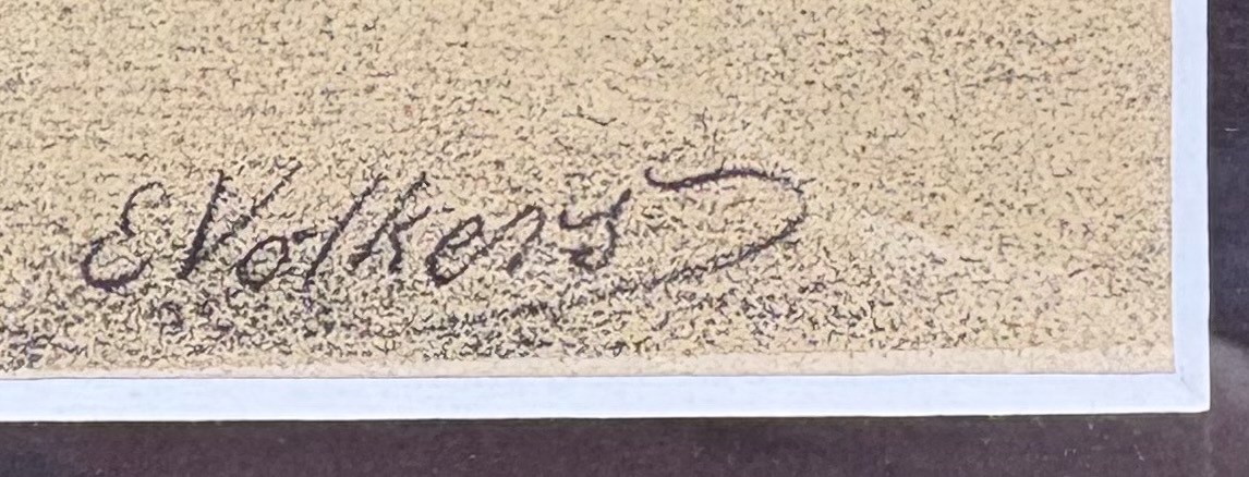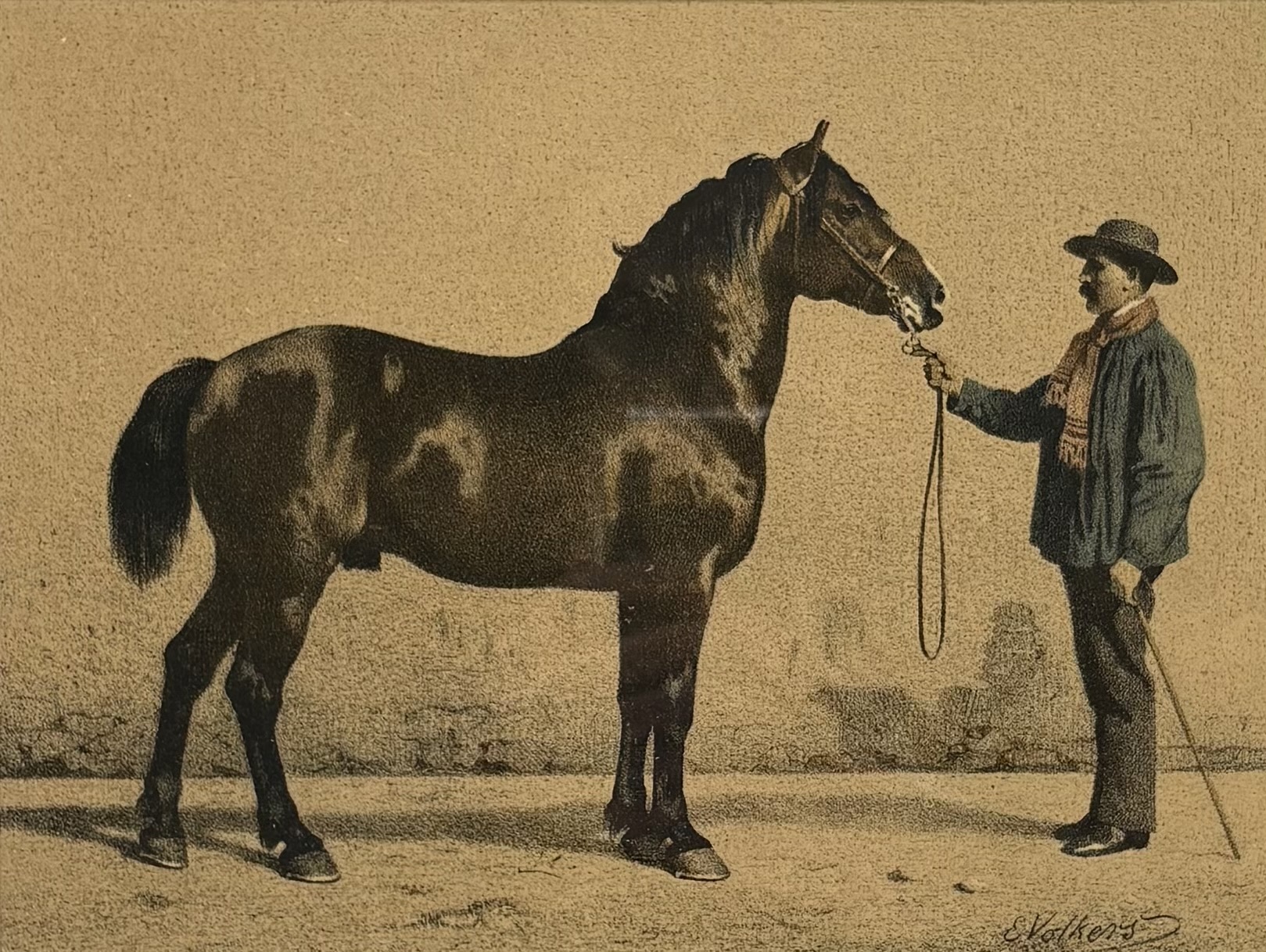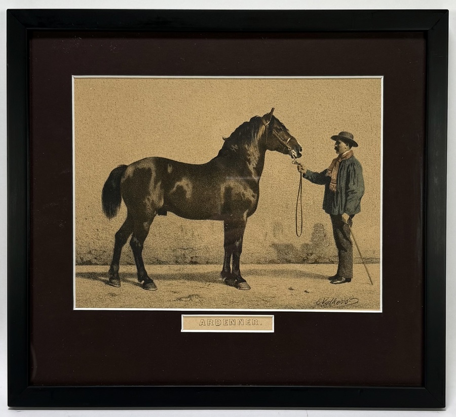 Kleurenlitho door Emil Volkers (1831–1905) toont een hengst in profiel, begeleid door een staande man met hoed en wandelstok, in 19e-eeuws realisme, kleurenlithografie op papier. De anatomisch uitgewerkte paardenfiguur met glanzende vacht contrasteert met de vlak gehouden achtergrond. Rechtsonder in de plaat gesigneerd. Deze litho dateert uit de tweede helft van de 19e eeuw en heeft een Duitse herkomst. Geïnteresseerd? Bezoek onze kijkdagen op 10, 11 en 12 april van 11:00 tot 17:00 uur! |