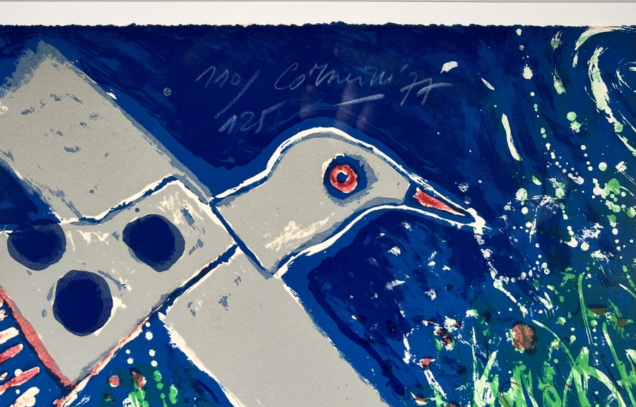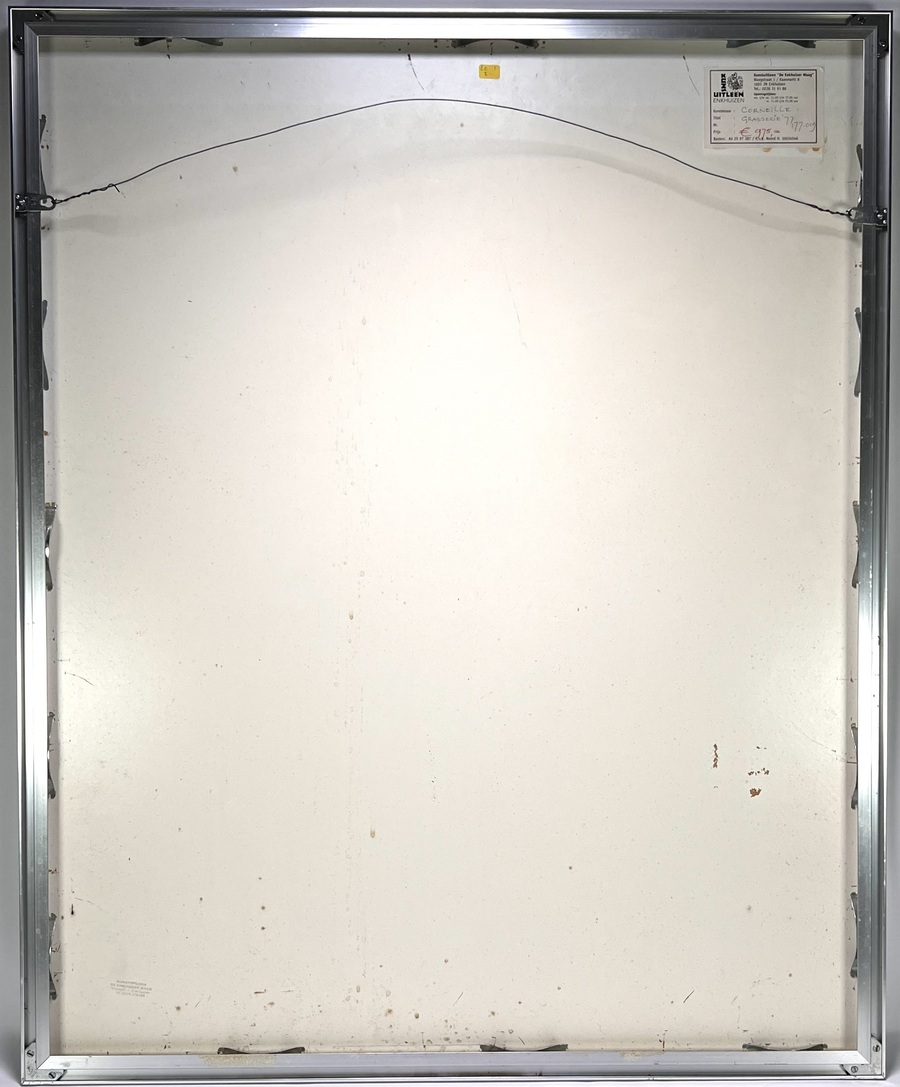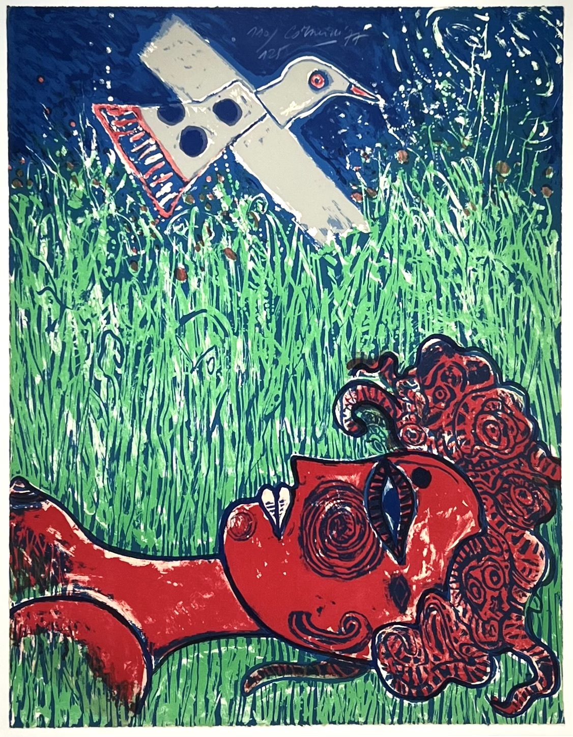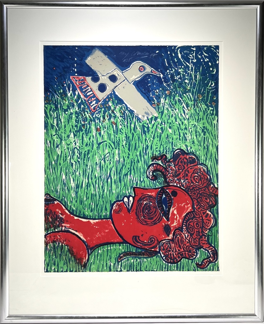 Kleurenlitho door Cornelis Guillaume van Beverloo (1922–2010) toont een expressieve voorstelling getiteld "Herbes" in CoBrA-stijl op papier. Een liggend rood vrouwenfiguur is omgeven door gestileerde grassprieten onder een vogel en hemel. De compositie bevat primaire kleuren en krachtige contouren. Midden boven oplagenummer 110/125, gedateerd '77 en gesigneerd. Deze litho heeft een Nederlandse herkomst en kenmerkt zich door een dynamisch, organisch lijnenspel en diepblauw kleurgebruik. Geïnteresseerd? Bezoek onze kijkdagen op 10, 11 en 12 april van 11:00 tot 17:00 uur! |