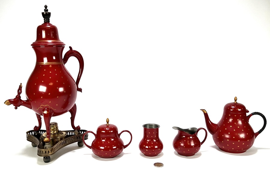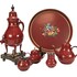 Koffie- en theeservies van Kurz Edeltin in Biedermeier-stijl, vervaardigd uit handbeschilderd edeltin met een rode lakafwerking. De kavel omvat een kraantjeskan op koperen komfoor, koffiepot, suikerpot, melkkan en lepelvaasje, gepresenteerd op een floraal gedecoreerd dienblad. Datering tweede helft 20e eeuw en een Nederlandse herkomst. Wil je dit koffie- en theestel op dienblad in het echt bekijken? Kom naar de kijkdagen! |