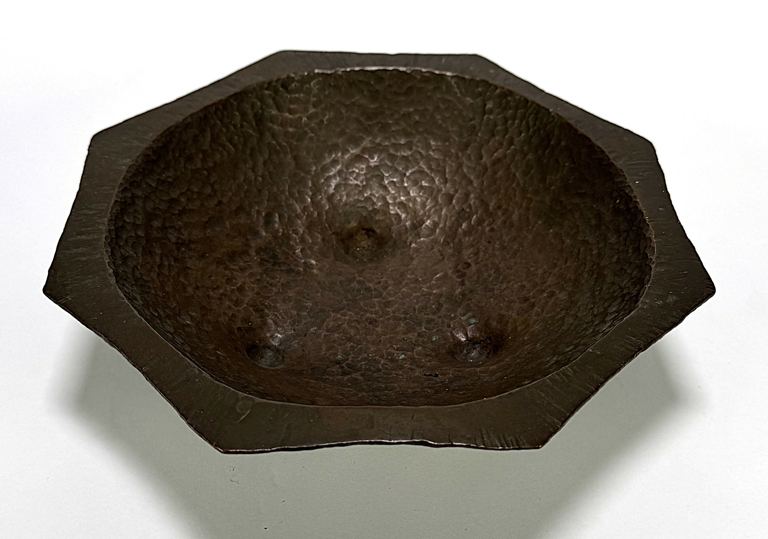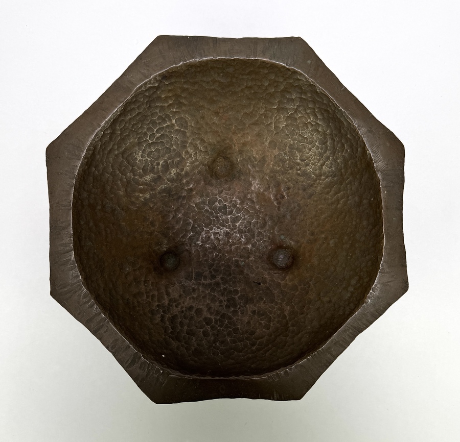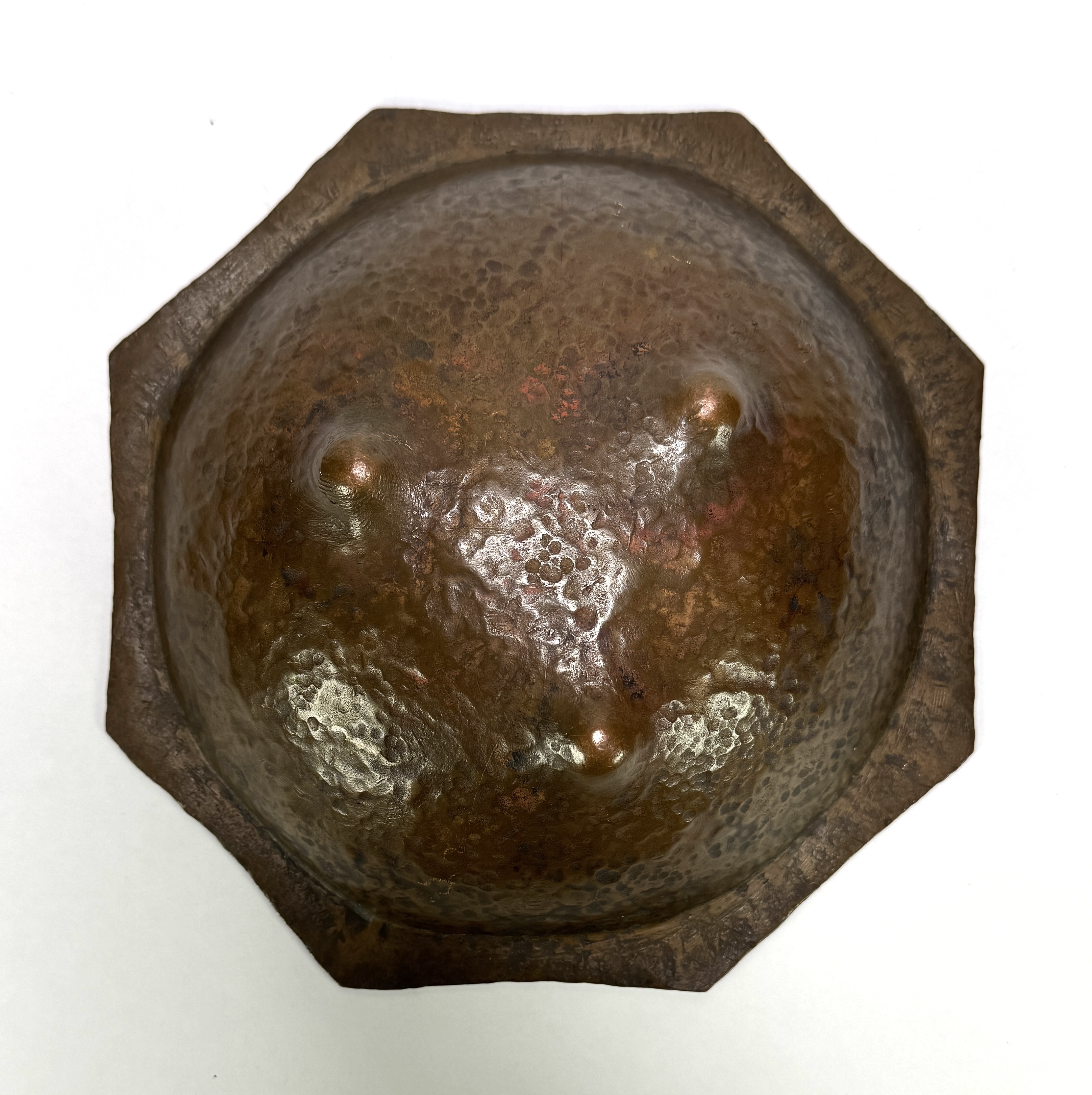 Schaal uit de Arts and Crafts periode, vervaardigd uit koper met gehamerde en gedreven techniek. De achtzijdige schaal heeft een vlakke rand, gehamerde binnenwand en drie stand noppen. De schaal dateert