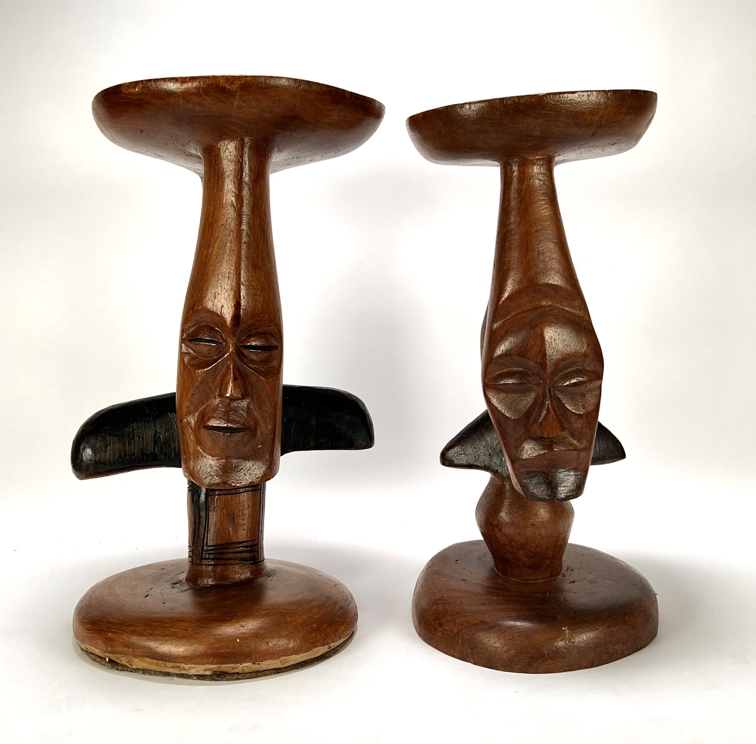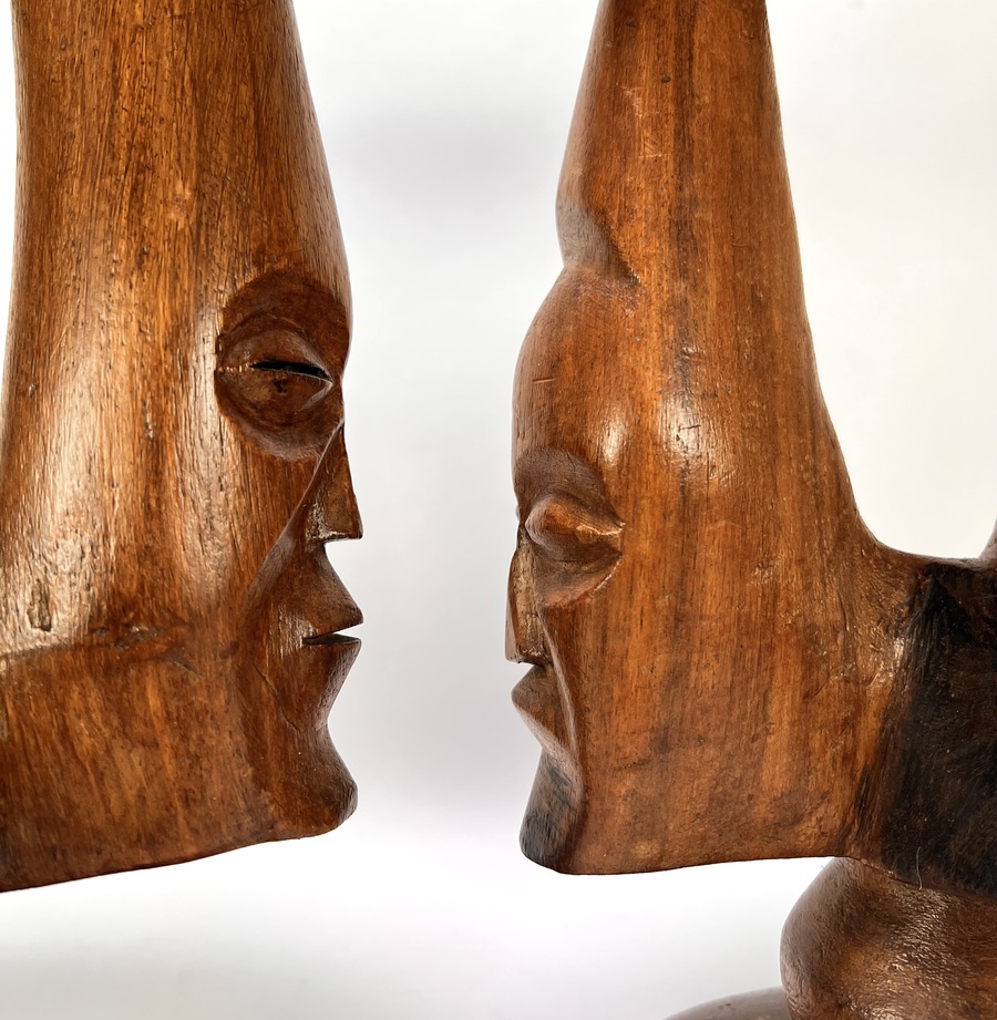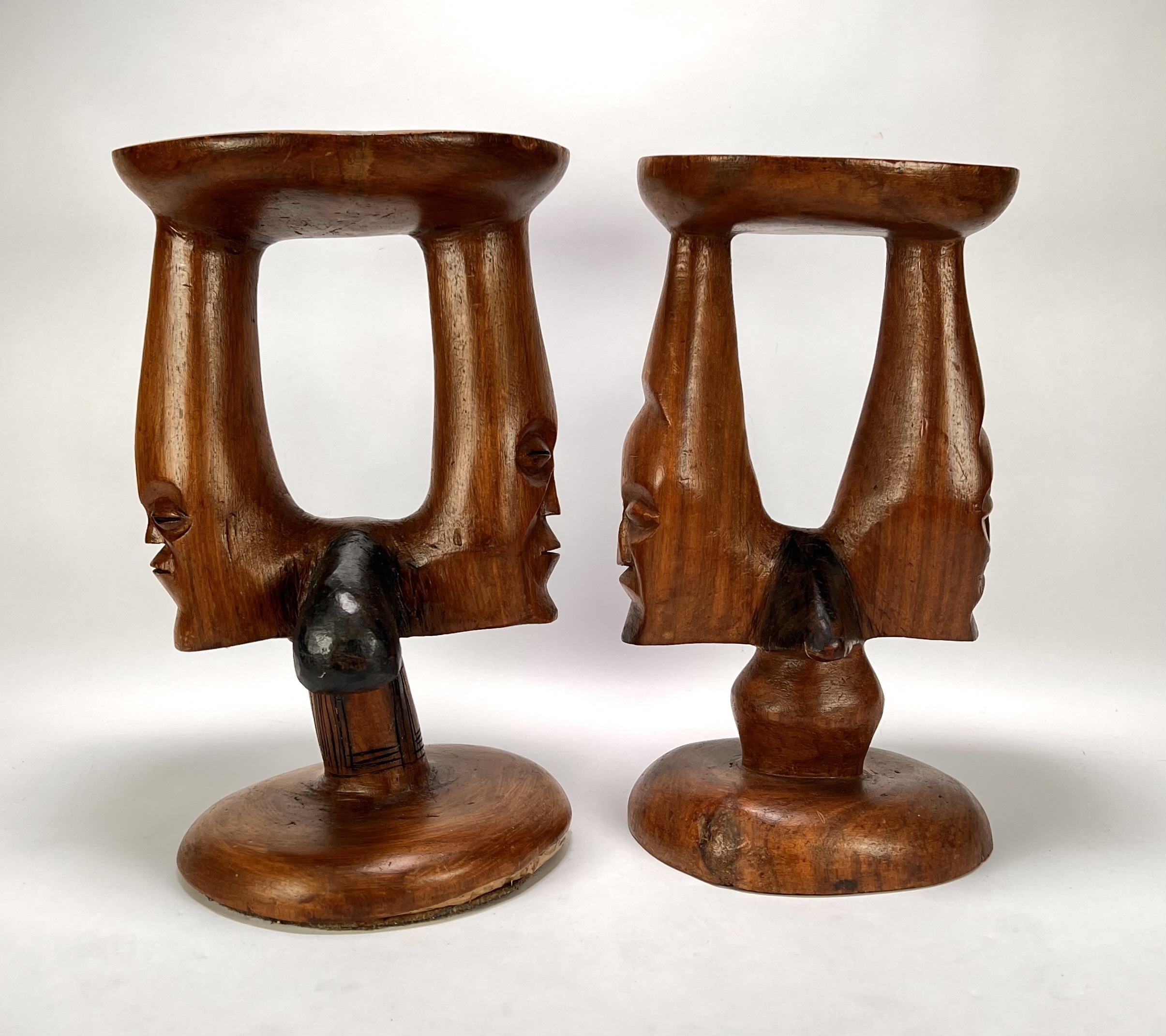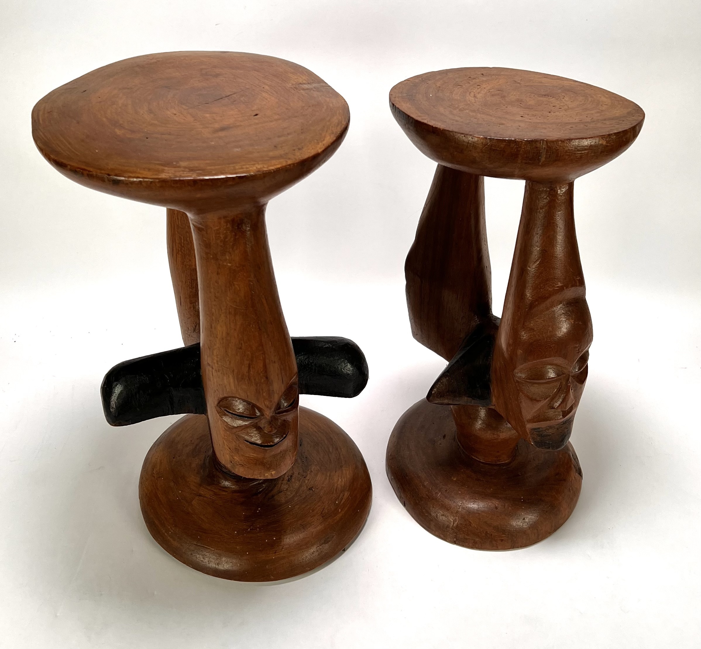 West-Afrikaanse krukjes uit Ghana, midden 20e eeuw, gesneden uit massief hout. De ronde zittingen rusten op antropomorfe steunen met langgerekte gezichten, amandelvormige ogen en horizontaal uitgestrekte armen. De krukjes fungeerden als status/ceremoniële zitplaatsen binnen Akan-tradities. Kom langs tijdens de kijkdagen (10 t/m 12 april) en ontdek deze krukjes zelf! |