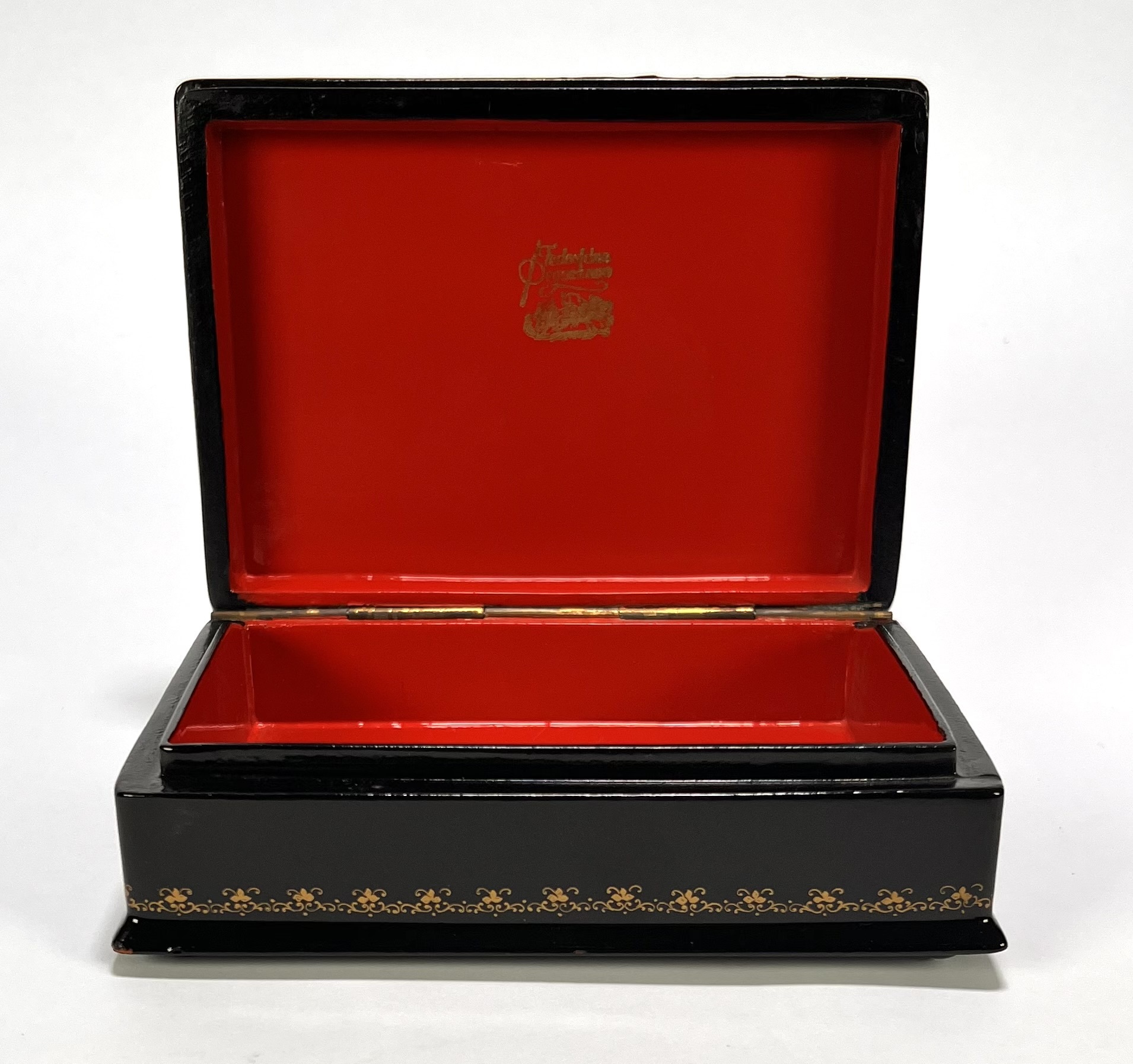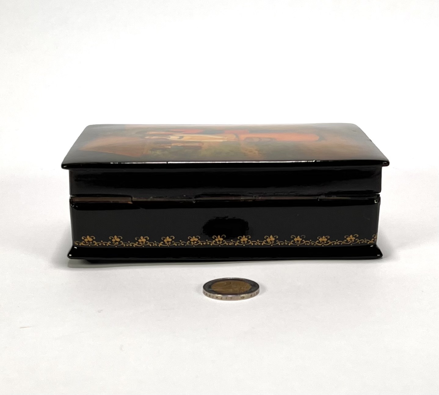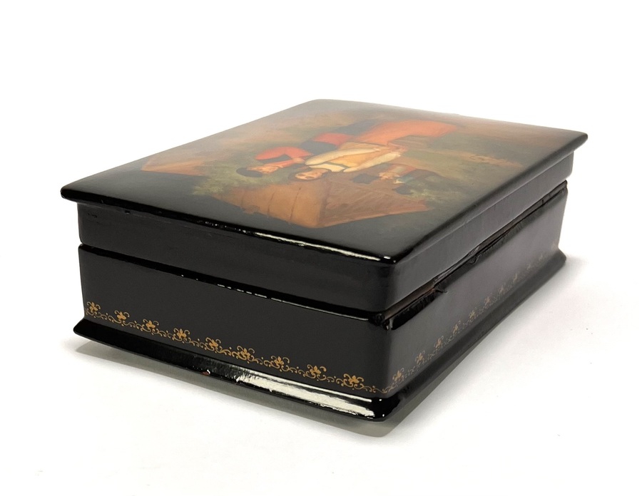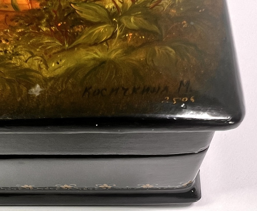 Fedoskino lakdoos uit 1992, uitgevoerd in olieverf op papier-maché. De lakdoos toont een paar in een naturalistisch dorpslandschap. Gesigneerd: Косичкина М., 1992 / M. Kosichkina. De realistische compositie en kleurstelling zijn typerend voor de Fedoskino-traditie. De lakdoos bevat een rood gelakt interieur met fabrieksmerk. Wil je deze lakdoos in het echt bekijken? Kom naar de kijkdagen! |