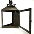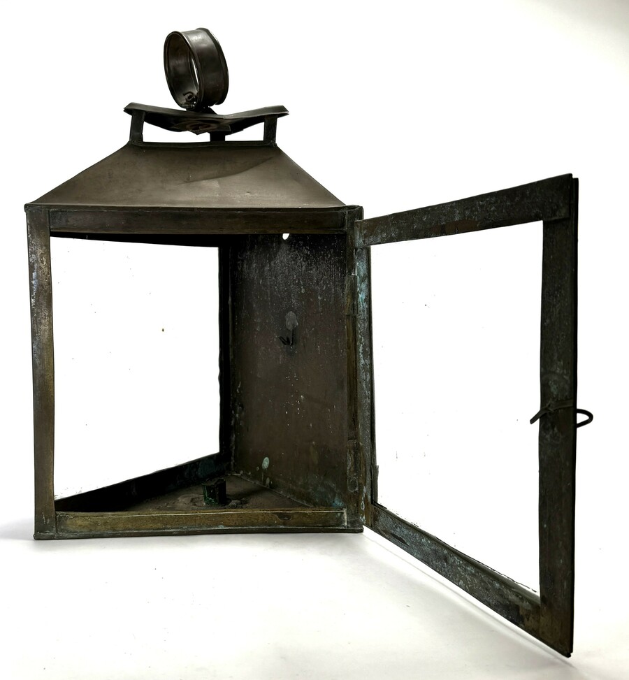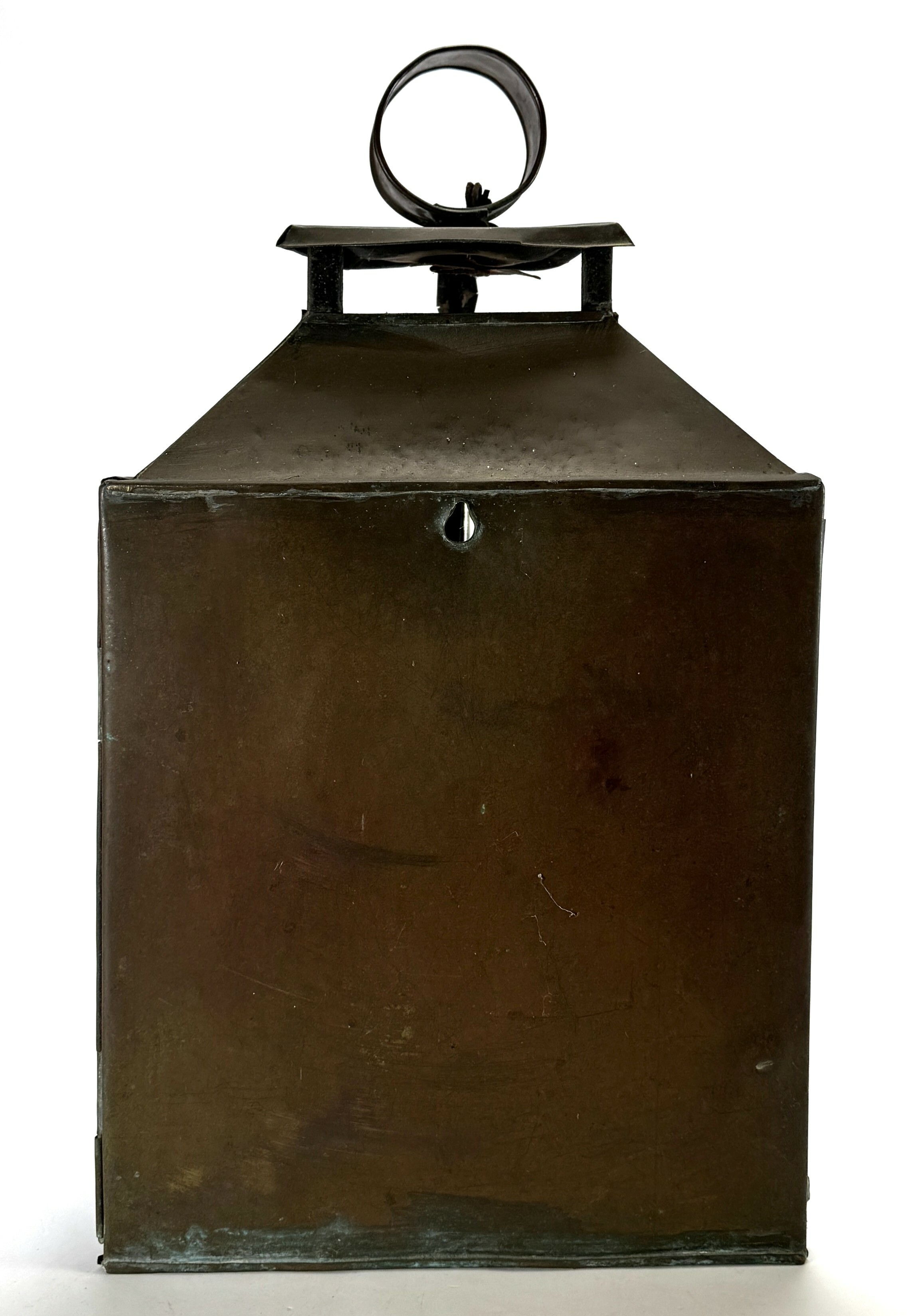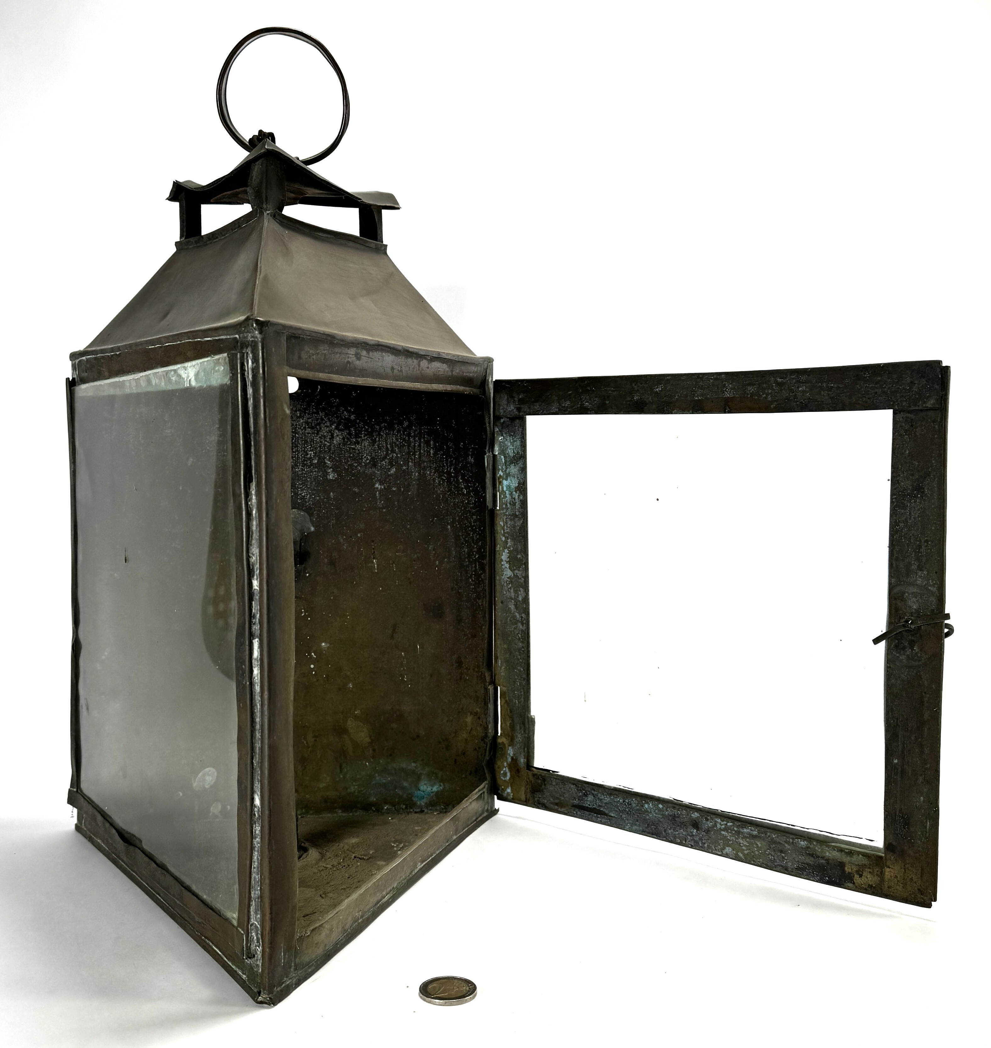 Lantaarn in utilitaire stijl, vervaardigd uit koper en glas met gesoldeerde plaatconstructie. Het rechthoekige corpus heeft een gesloten achterwand, scharnierende frontdeur en licht oplopende kap onder een opengewerkte ventilatiezone met ronde draagring. Datering circa 1900. Eerst deze lantaarn zien voordat je biedt? Bezoek onze kijkdagen op 10, 11 en 12 april! |