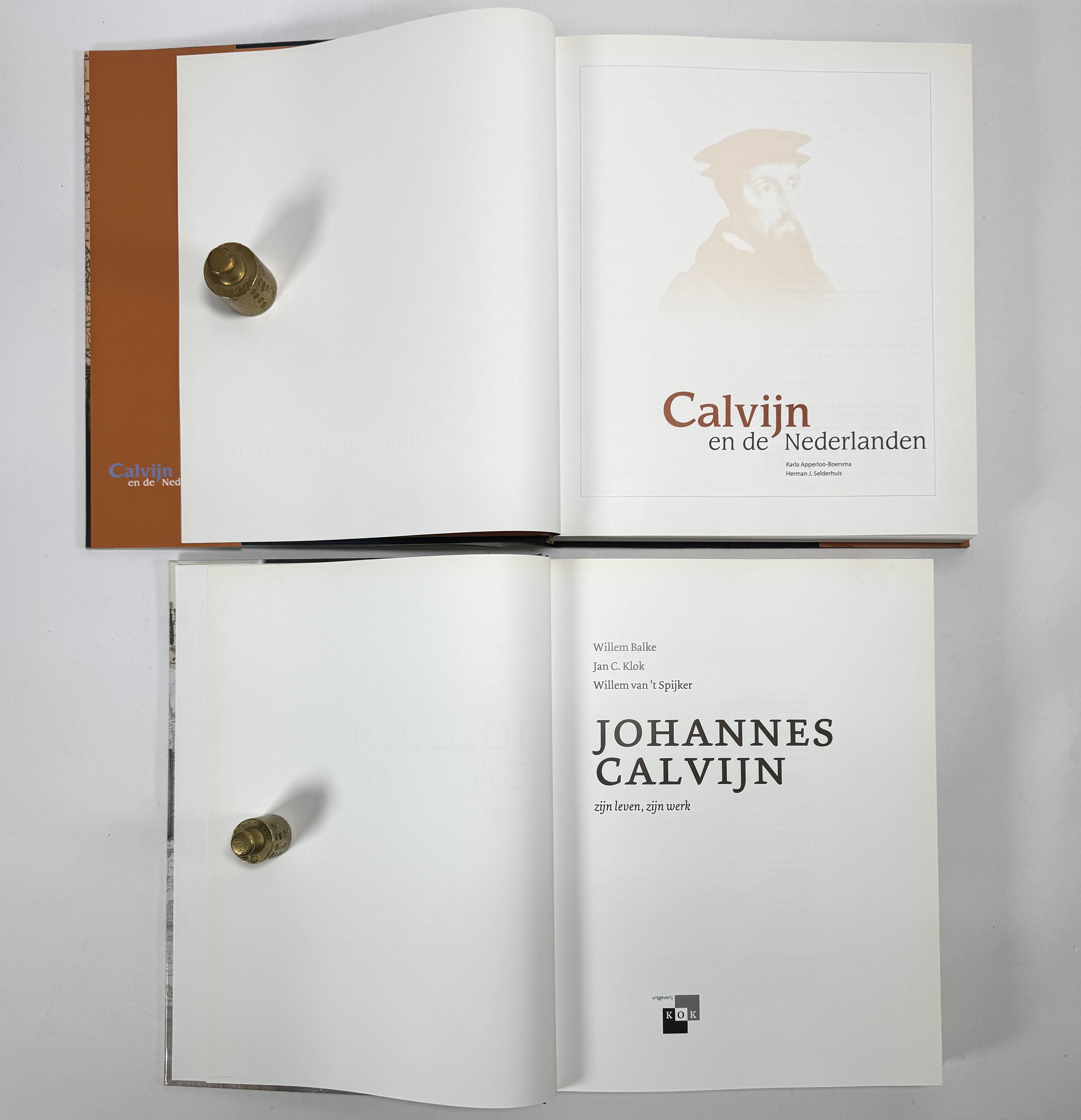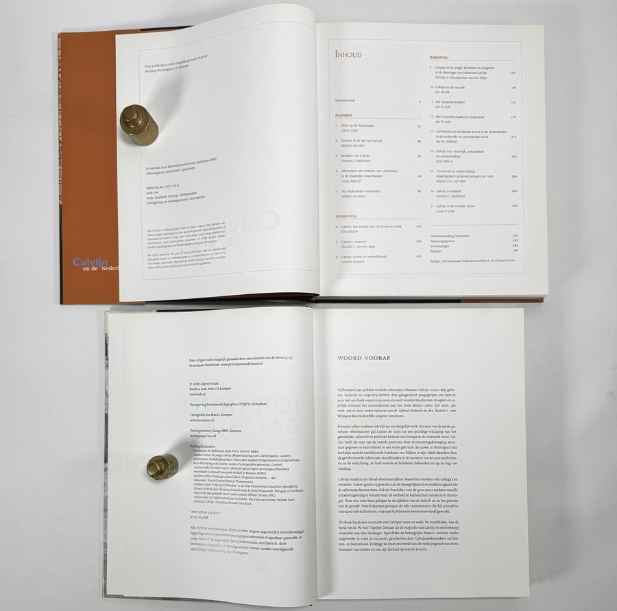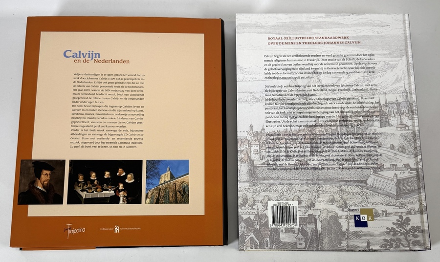 Boeken van diverse auteur waaronder W. van 't Spijker en K. Apperloo-Boersma over Johannes Calvijn, vervaardigd uit papier en karton in hardcover binding met stofomslagen. De set omvat het standaardwerk over zijn leven en werk, evenals de studie naar zijn invloed in de Nederlanden. De uitgaven zijn rijk voorzien van reproducties en historische bronnen uit de 16e eeuw. Uitgegeven 2008-2009. Deze boeken zelf beoordelen? Je bent welkom op onze kijkdagen op 10, 11 en 12 april! |