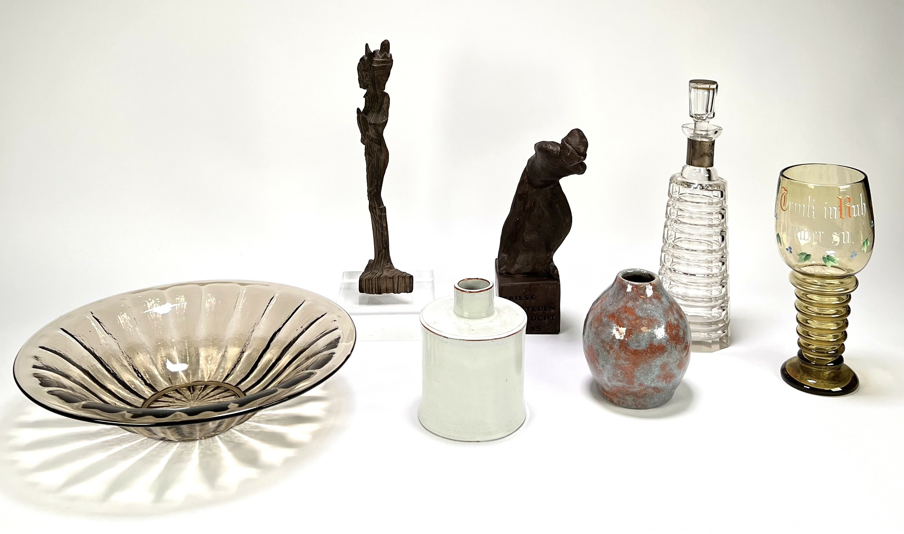 Lot curiosa bestaande uit beelden, keramieken vazen en kristallen glaswerk. Onder andere een geslepen karaf met zilveren montuur en twee figuren, waarvan één herinnert aan de Friese Elfstedentocht uit 1963. Datering tweede helft 20e eeuw. Dit kavel zelf beoordelen? Je bent welkom op onze kijkdagen op 10, 11 en 12 april! |