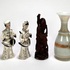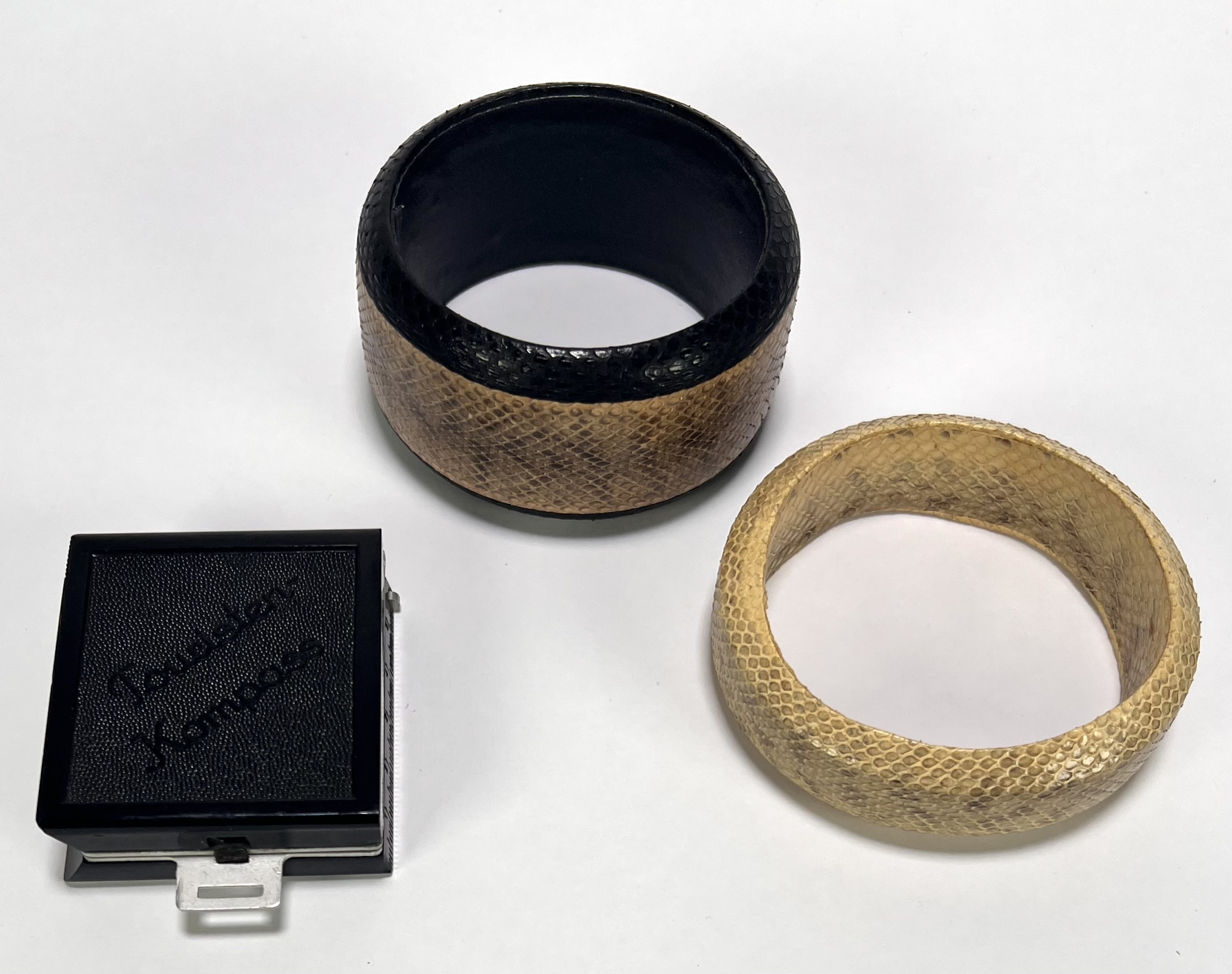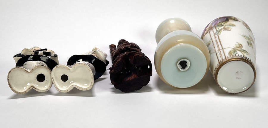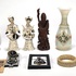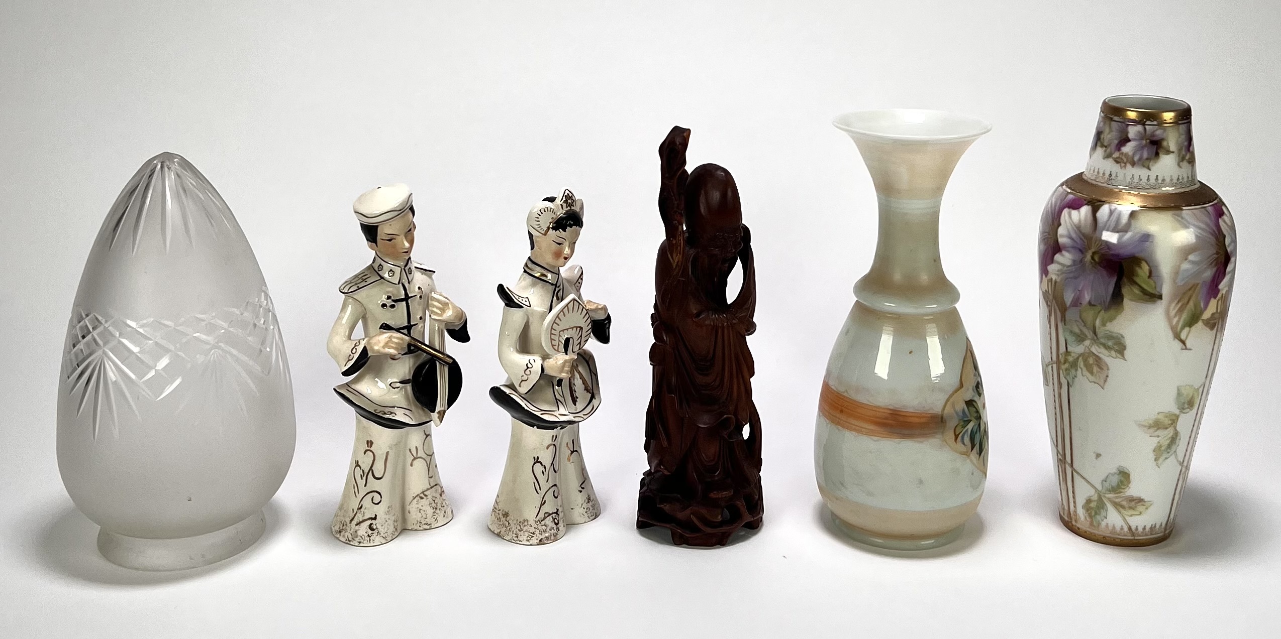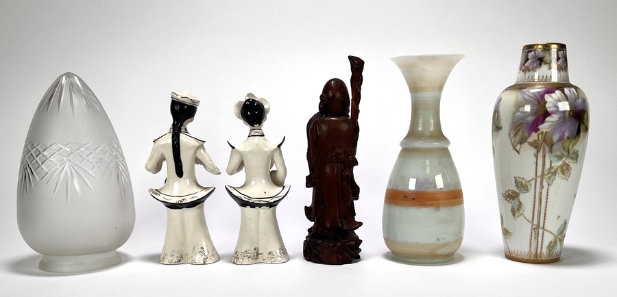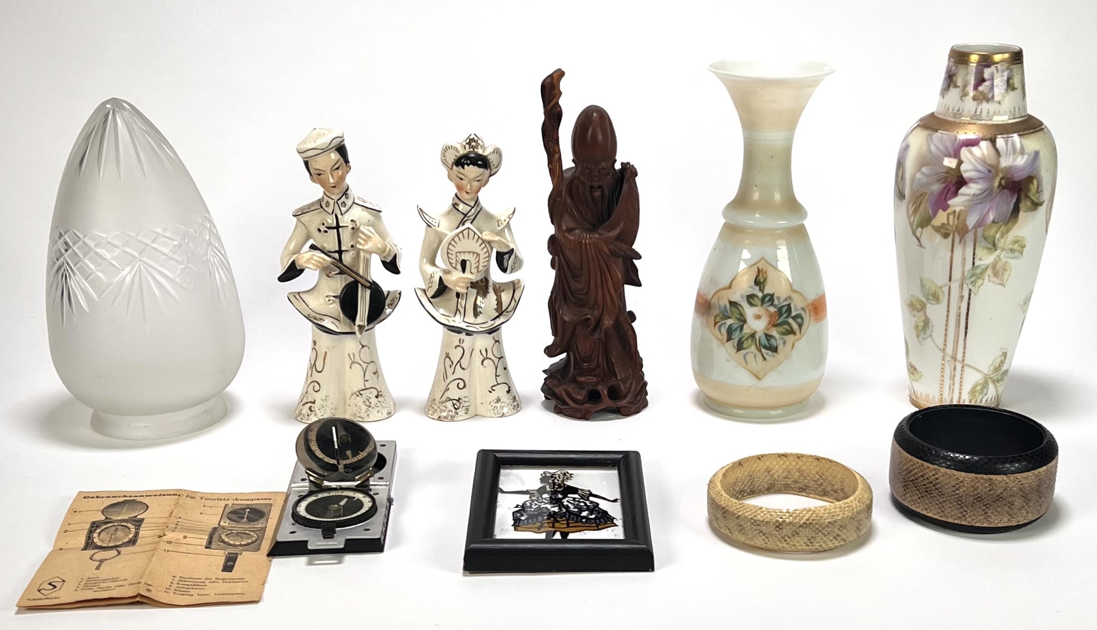 Eclectische samenstelling, deels uit de Art Deco periode, vervaardigd uit keramiek, albast, glas, hout, messing en slangenhuid met handbeschildering, slijpwerk en houtsnijwerk. De kavel bestaat uit een druppelvormige glazen lampenkap met geometrisch slijpmotief, porseleinen muziekfiguren, een gesneden houten wijze, twee vazen, een inklapbaar kompas, schildering achter glas en twee brede armbanden. Daterend uit de 20e eeuw en een Europese en Aziatische herkomst. Klaar om te bieden? Registreer je nu en doe mee aan de veiling! |