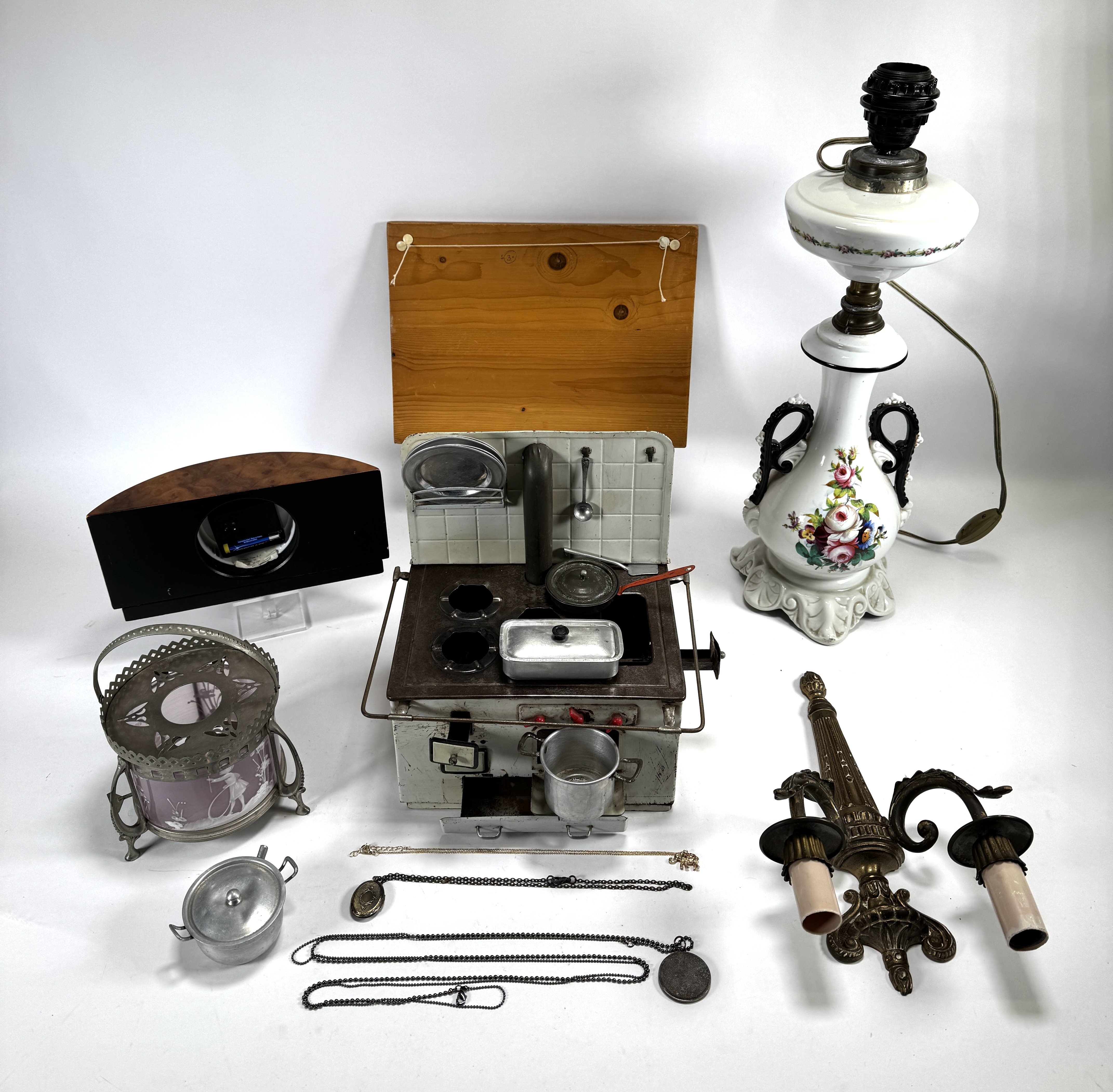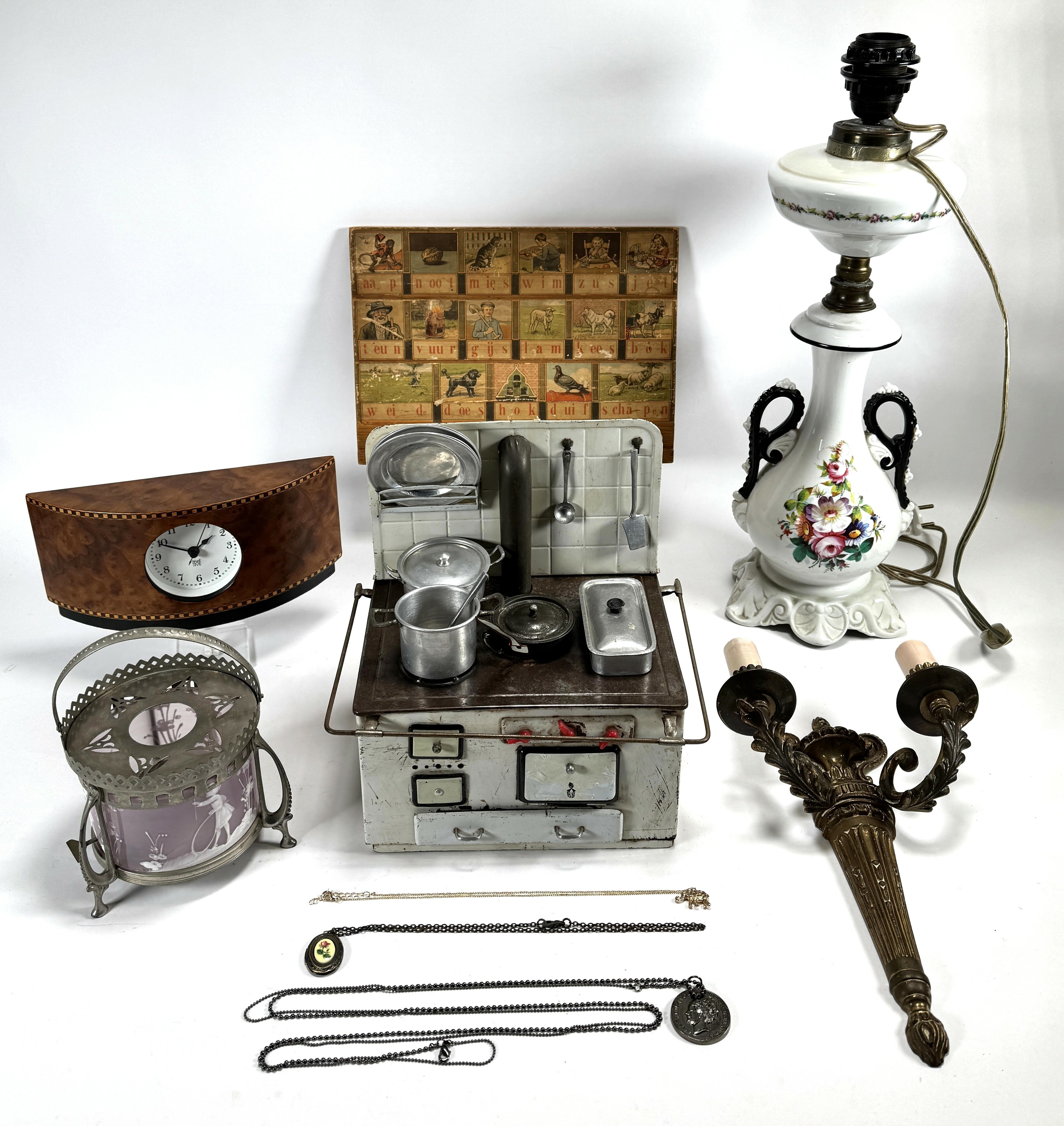 Collectie uit de Art Nouveau en Art Deco periode, vervaardigd uit porselein, messing, hout, blik en glas met gietwerk, handbeschildering en plaatmetaalconstructie. De kavel omvat onder andere een porseleinen olielamp met florale cartouches, een gietmetalen wandkandelaar, een miniatuurfornuis met pannenset, een gebogen fineerklok en diverse kettingen met medaillons. De voorwerpen dateren uit eind 19e eeuw tot midden 20e eeuw en hebben een Europese herkomst. Registreer nu en bied eenvoudig online mee op dit lot. |