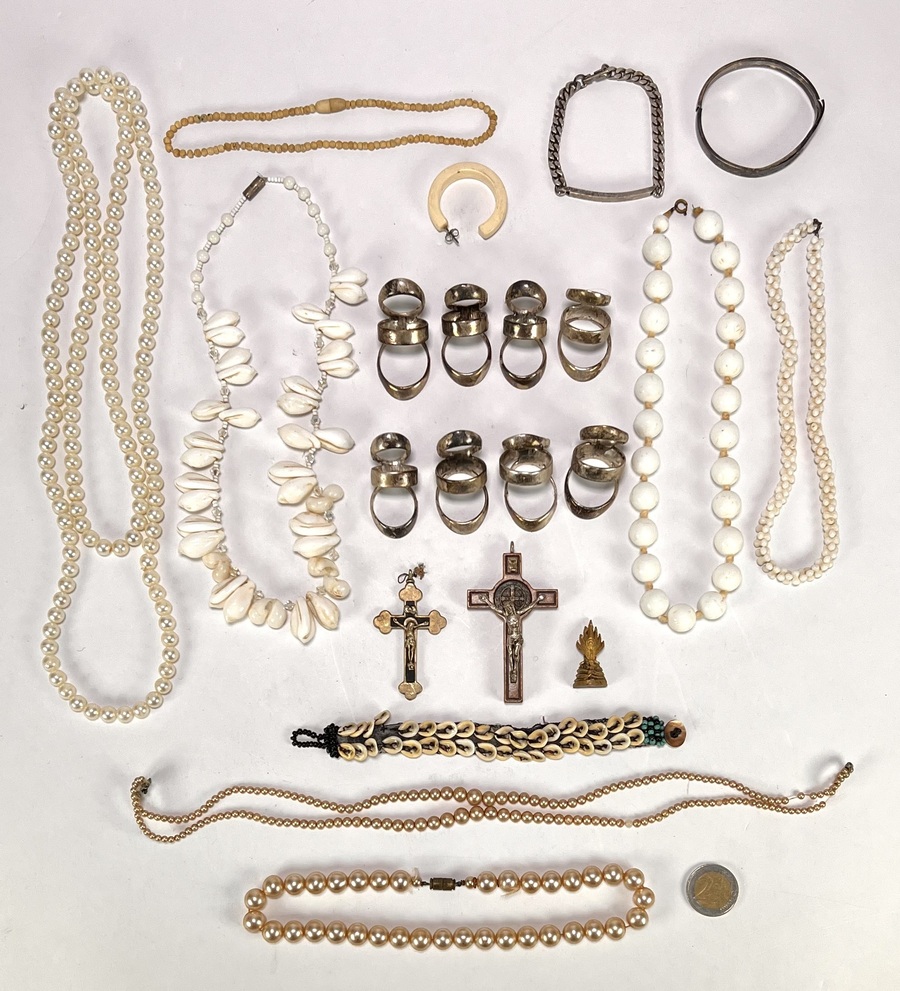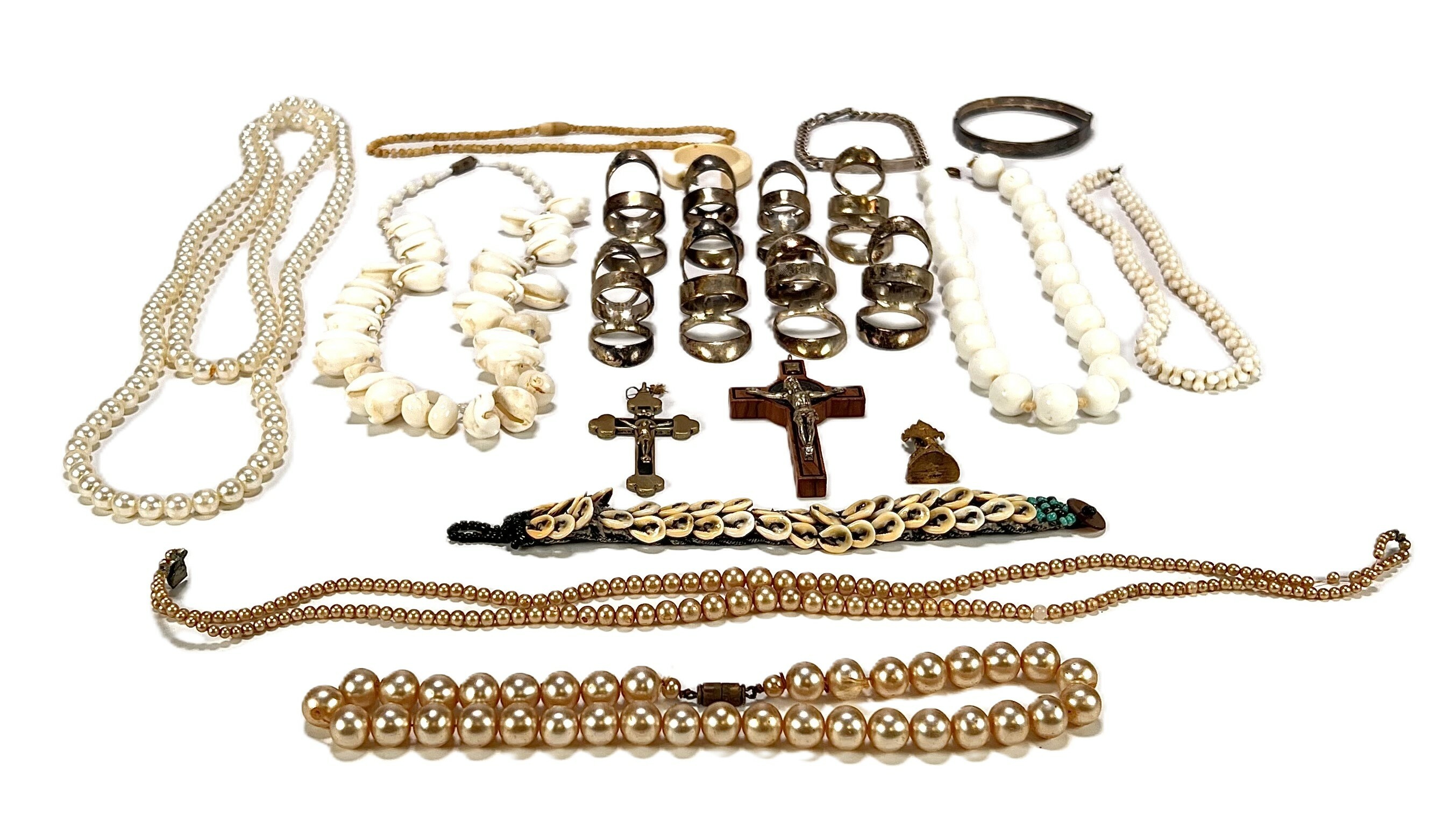 Lot sieraden van goudkleurig metaal en imitatieparels, bestaande uit lange kralensnoeren, ringen, armbanden en hangers. Met variatie in schakeltypes, kraalvormen en monturen, datering 20e eeuw. Wil je direct deelnemen? Plaats vanaf 3 april alvast een schriftelijk bod via onze website! |