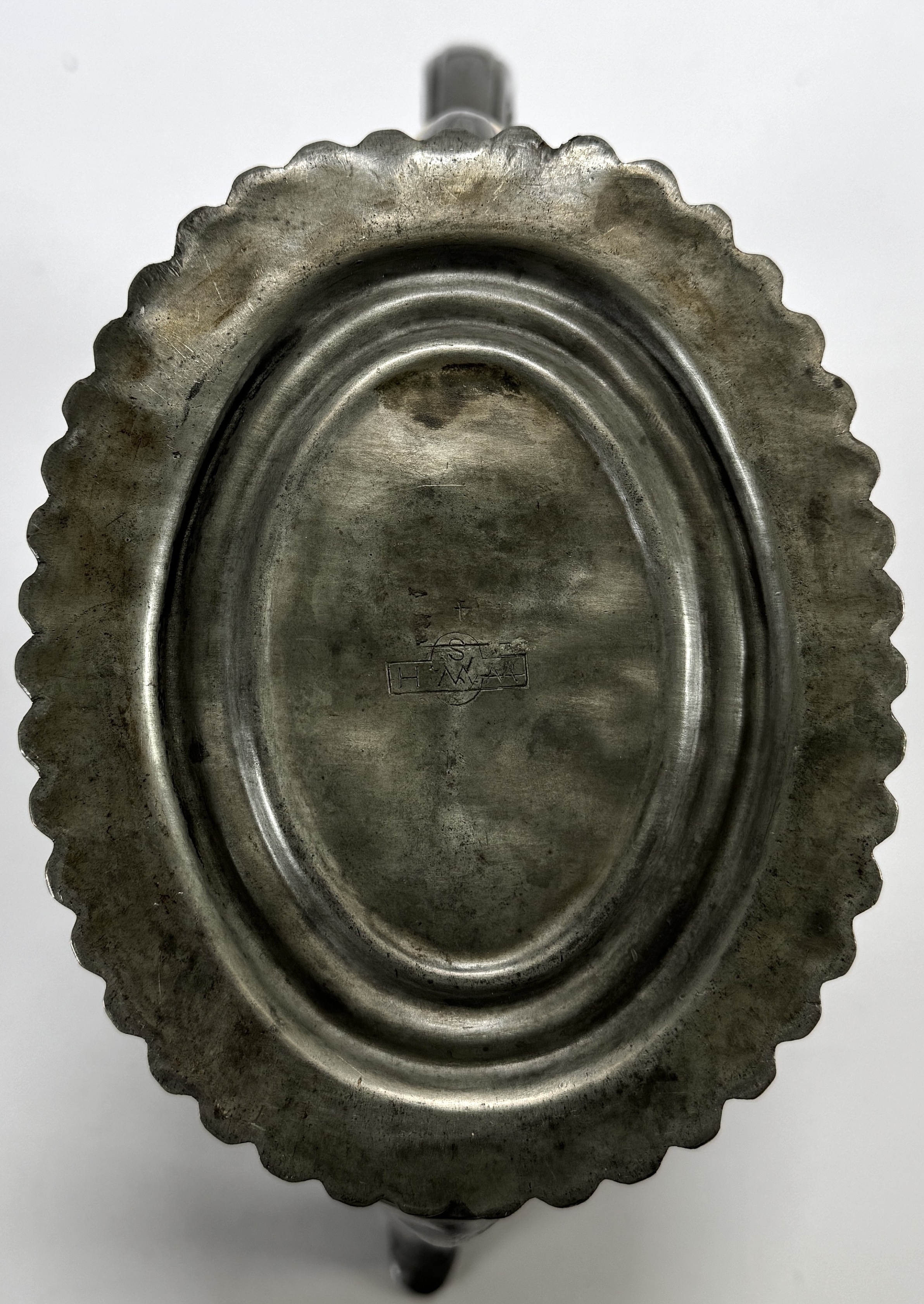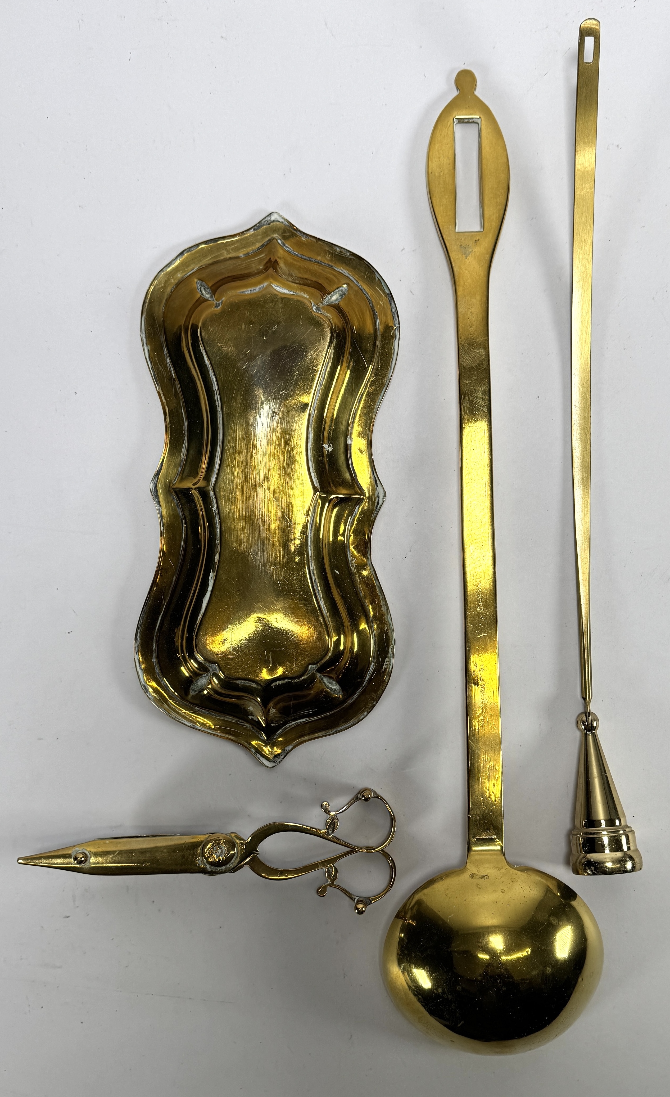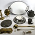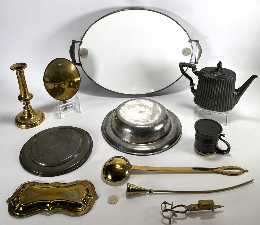 Convoluut Hollands tin en messing, 19e/20e eeuw, verzameling van diverse utilitaire objecten uit de barokke en neoclassicistische periode, vervaardigd uit tin en messing middels giet- en drijftechnieken. Het lot omvat onder meer tinnen schotels met diverse keurmerken, een koperen snotneus, een balusterkandelaar en een aardewerken blad met blauw molendecor in metalen montuur. Wil je deze verzameling in het echt bekijken? Kom naar de kijkdagen! |