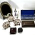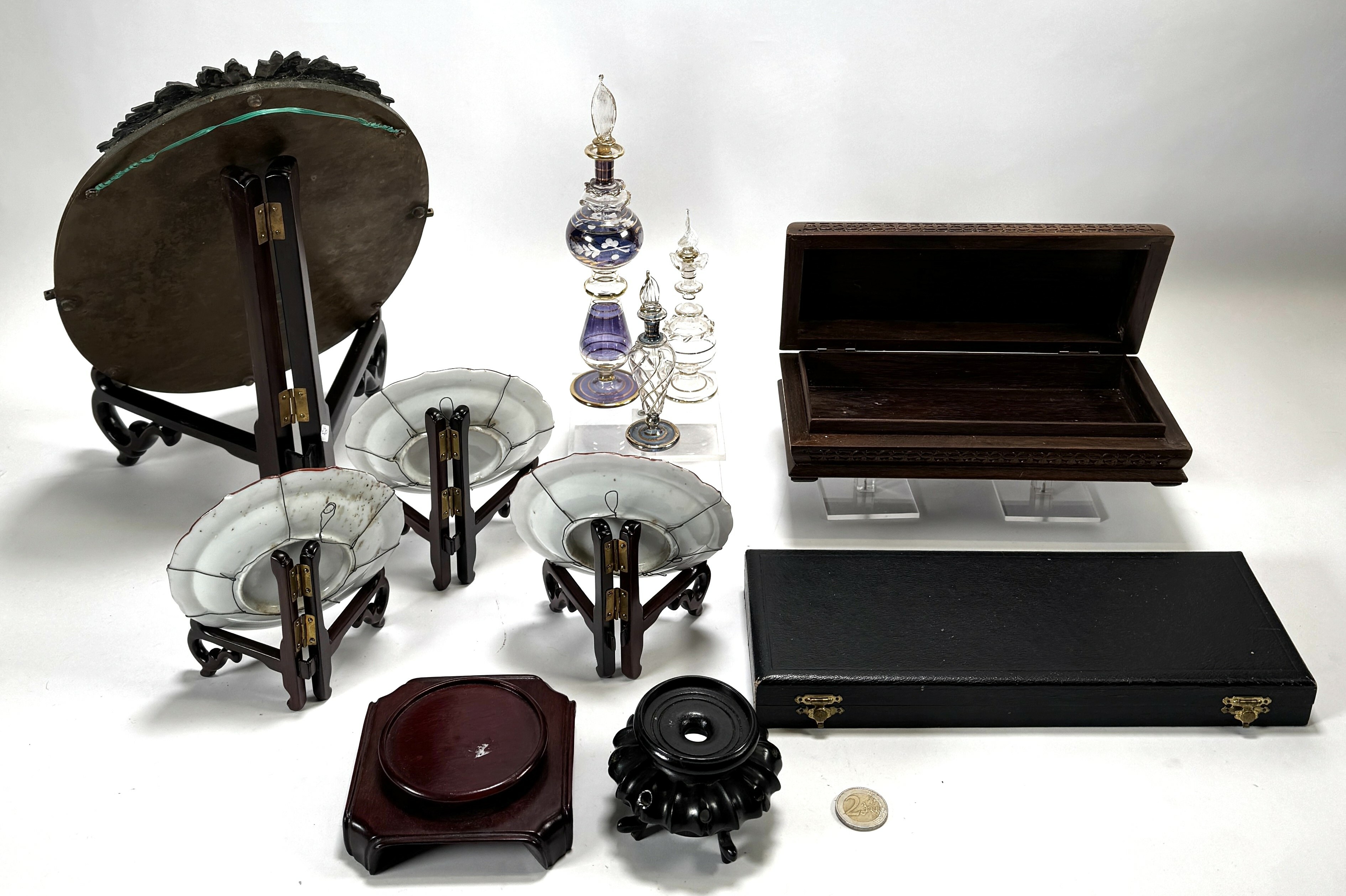 Lot curiosa bestaande uit onder andere een ovale spiegel met messing montuur, drie porseleinen schoteltjes met floraal handbeschilderd decor, drie glazen flesjes, een set messenleggers, een houten kistje en een schaaltje. De objecten zijn vervaardigd uit hout, porselein, glas en metaal en hebben een herkomst in Europa en Azië, 19e/20e eeuw. Klaar om te bieden? Registreer je nu en doe mee aan de veiling! |