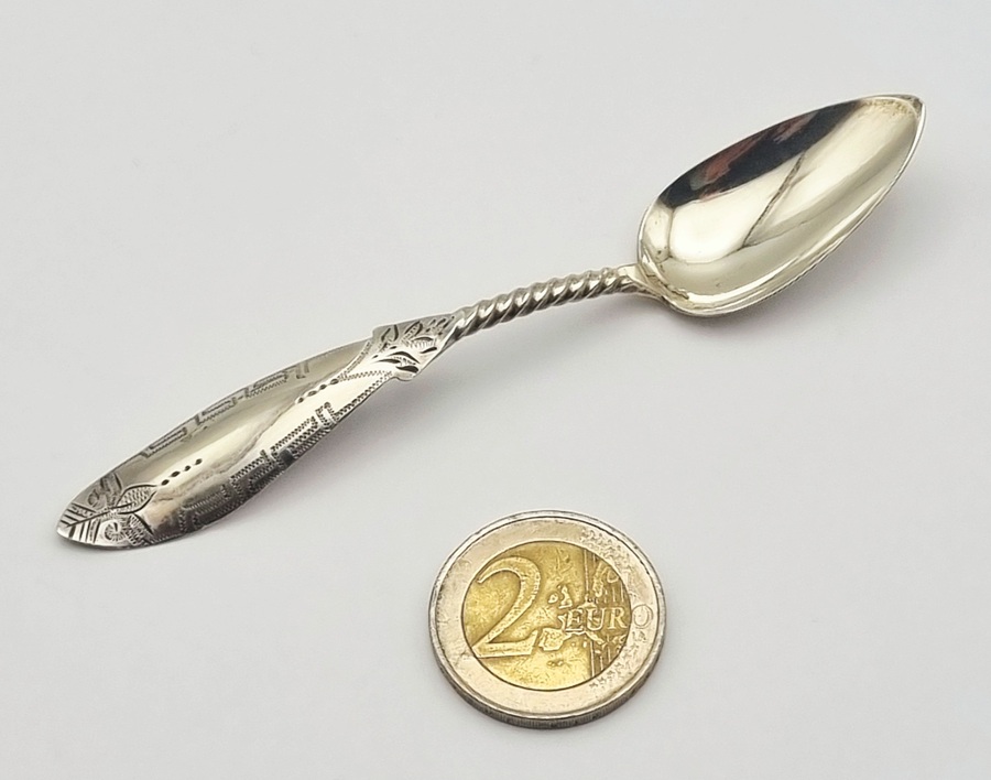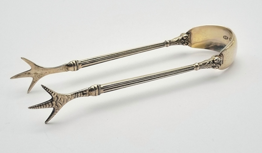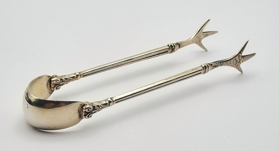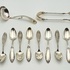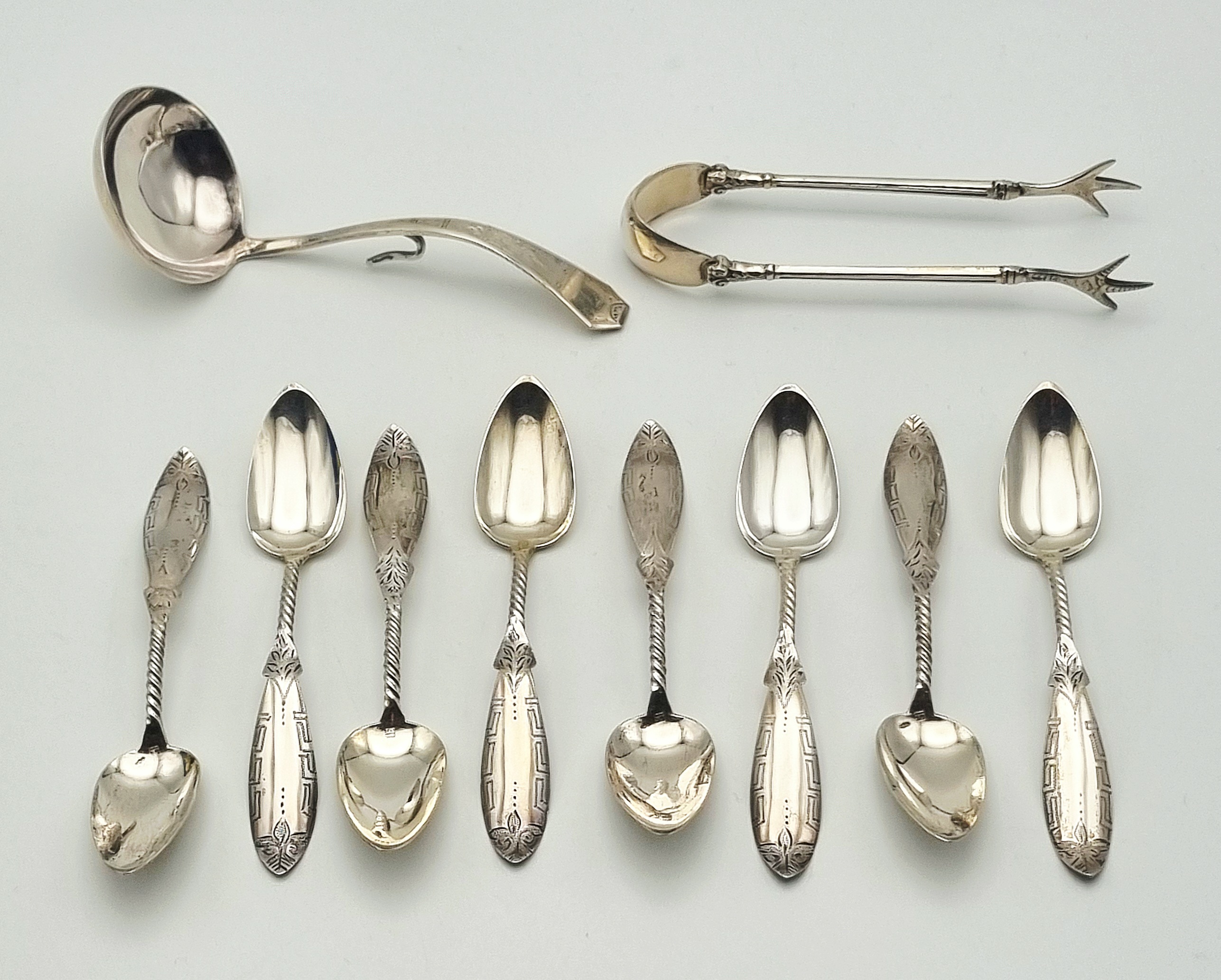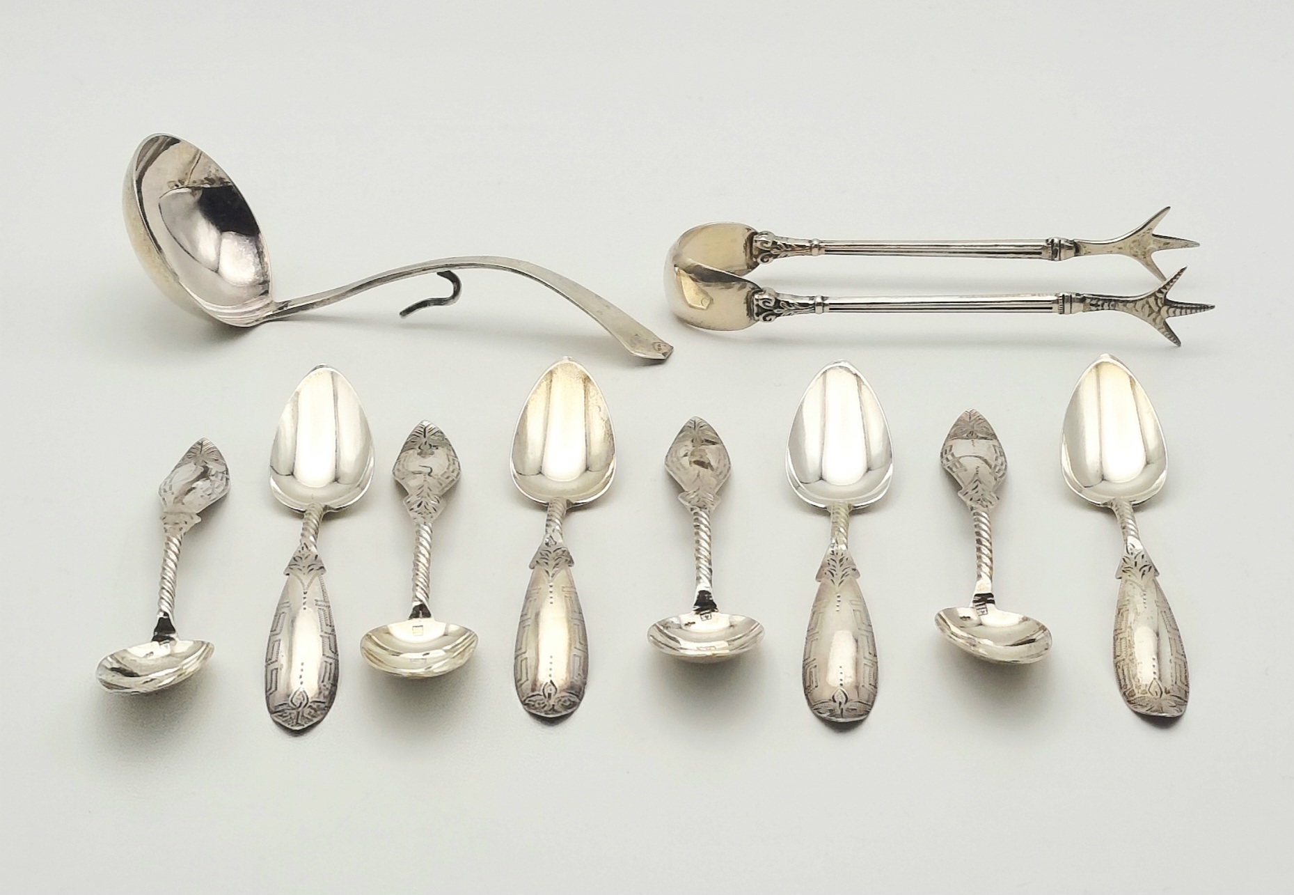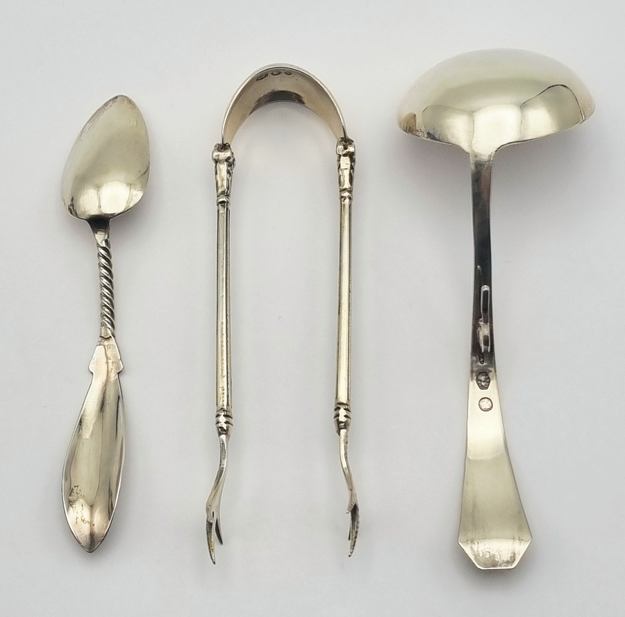 Zilveren theelepels, roomlepel en klontjestang, begin 20e eeuw
