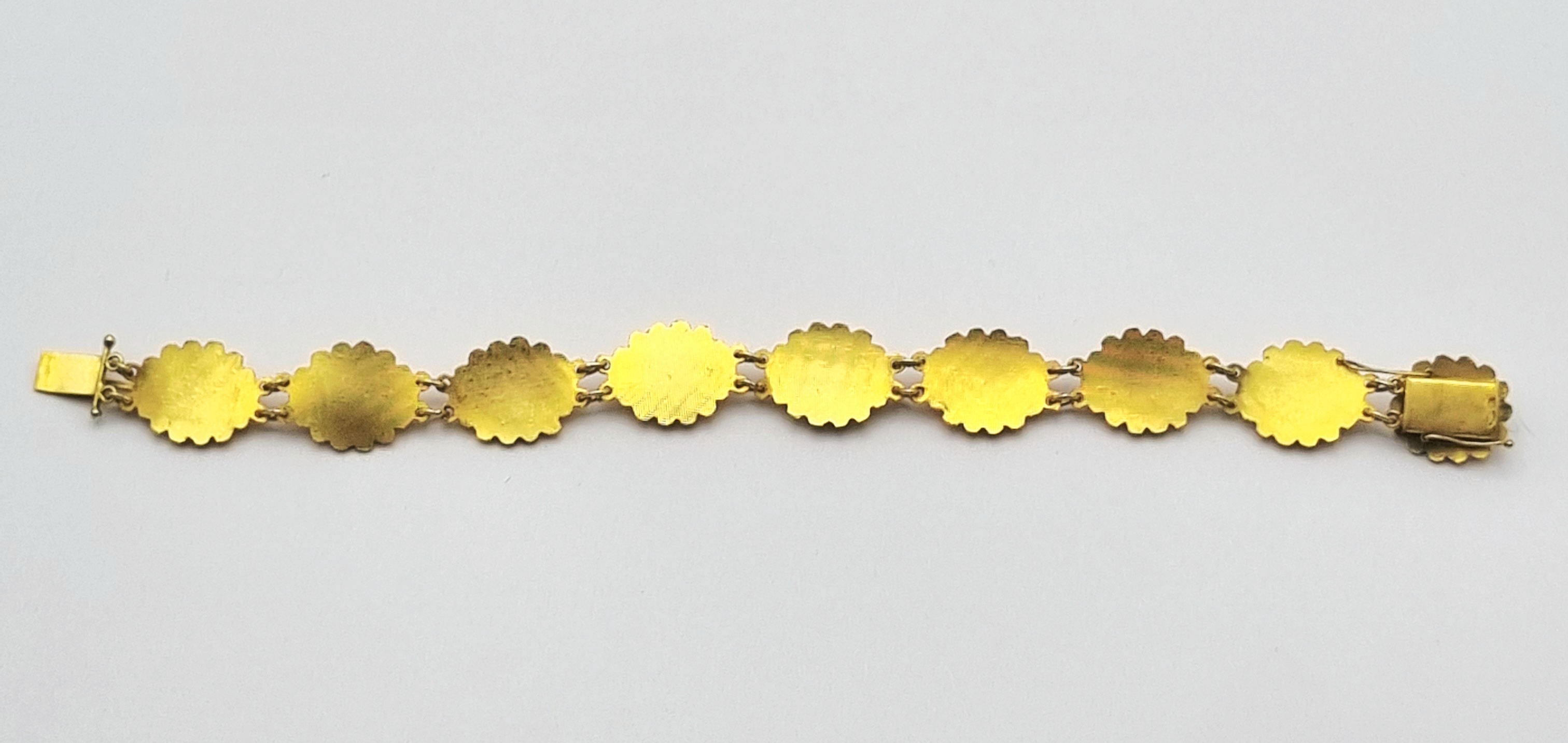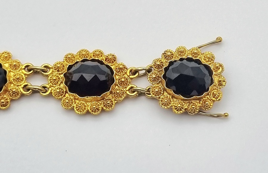 Gouden 14-karaats armband bezet met negen roosgeslepen granaten in een verfijnde zetting. Elke schakel is gedecoreerd met minutieus filigraanwerk en cannetille-details in bloemvorm. Het sieraad is voorzien van een bakslot met veiligheidssluiting. De armband toont een grote dichtheid in het fijnmazige gouddraadwerk tussen de centrale stenen. Datering 20e eeuw. Klaar om te bieden? Registreer je nu en doe mee aan de veiling! |