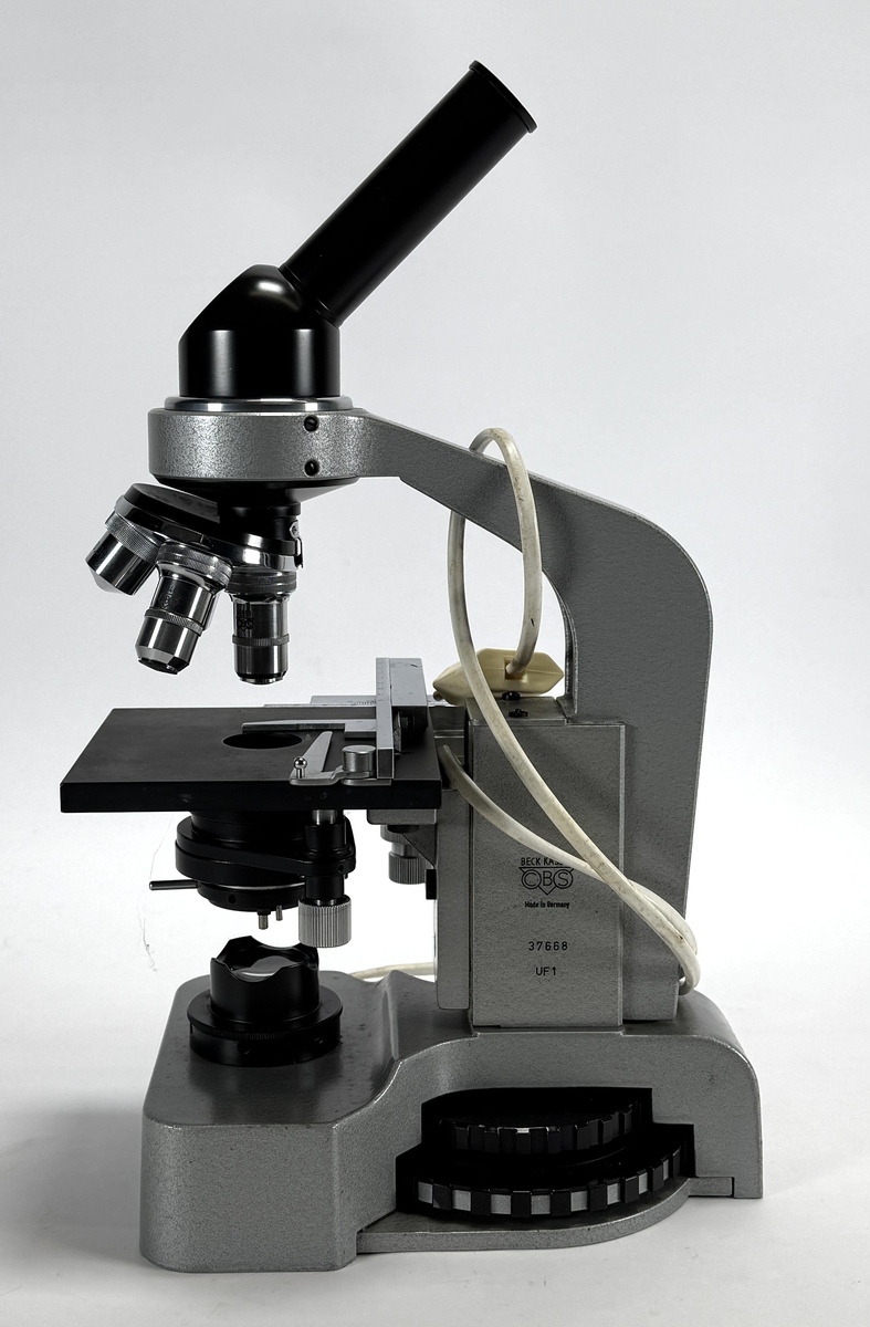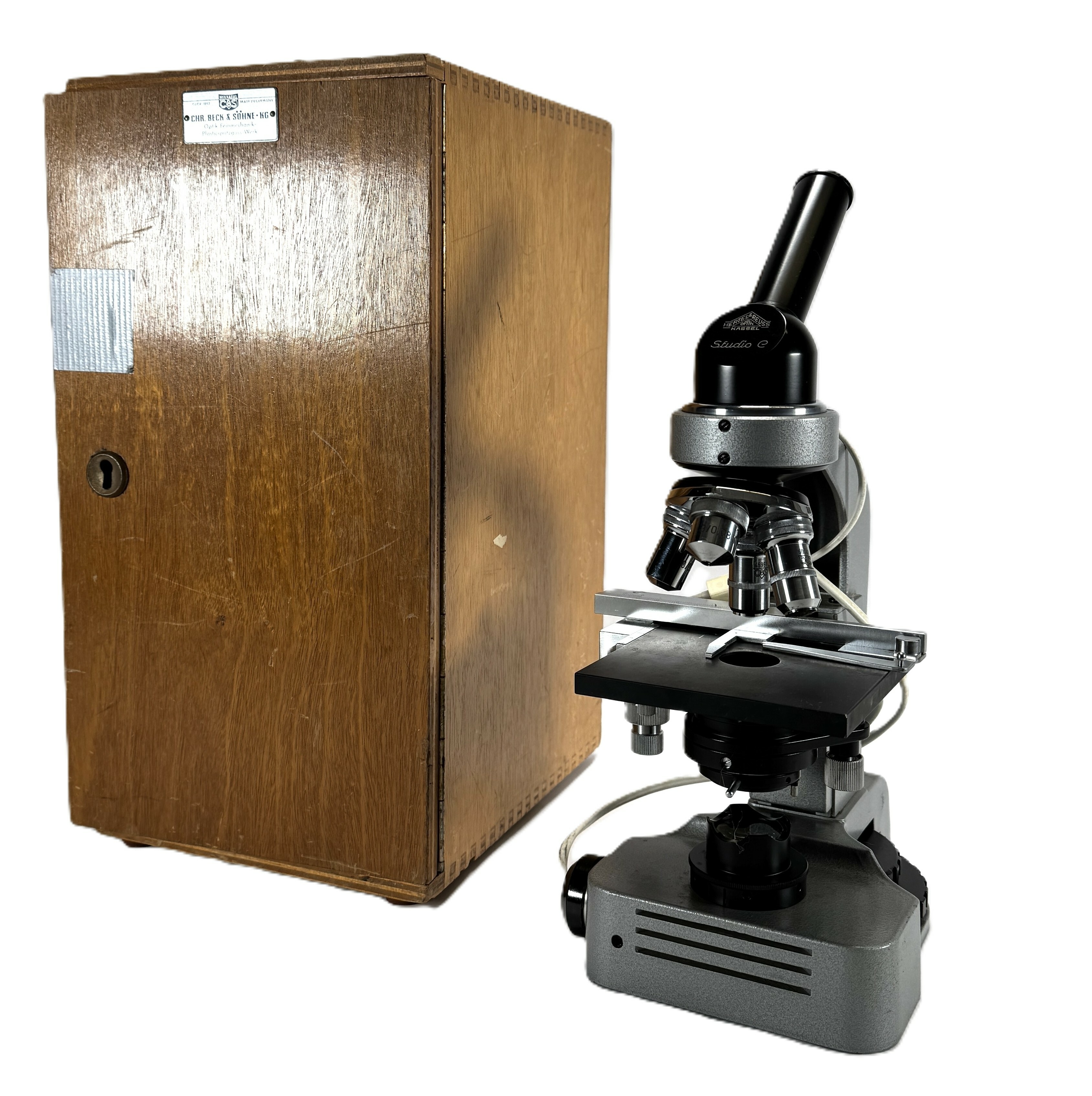 Microscoop van Hertel & Reuss vervaardigd uit grijs gelakt gietmetaal met optische glaselementen. Het Studio C model is uitgevoerd met een drievoudige revolverkop en een Beck Kassel UF1 voet. De bijbehorende houten kist is voorzien van het originele fabrieksetiket. Deze microscoop dateert uit circa 1965 en heeft een West-Duitse herkomst. Registreer nu en bied eenvoudig online mee op deze microscoop! |