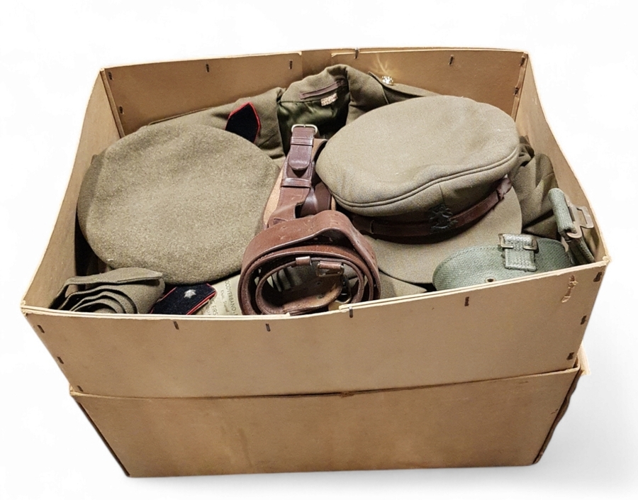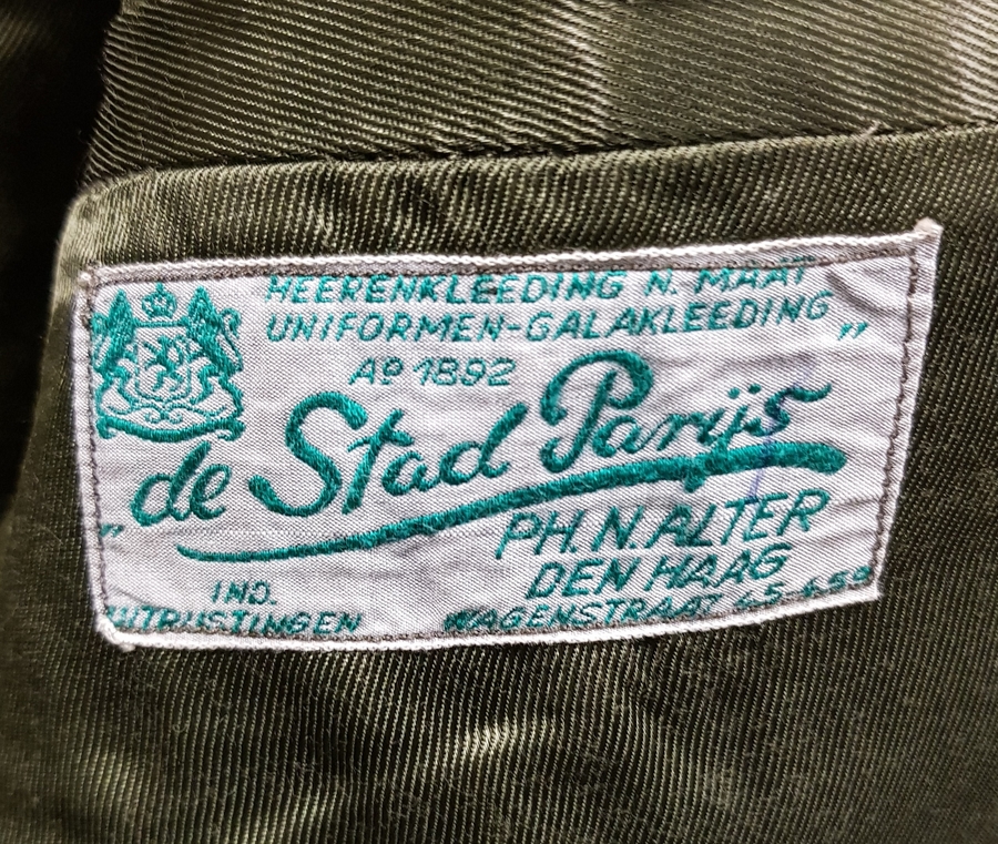 Militaire uniformstukken van De Stad Parijs, Ph. N. Alter, Den Haag (actief sinds 1892), ca. 1960, vervaardigd uit wol met katoen, messing knopen en leren koppelriem. Bestaande uit een jas met klepzakken, kraagspiegels met dubbele rangsterren, bijpassende overjas en kepies. Registreer nu en bied eenvoudig online mee op dit lot! |