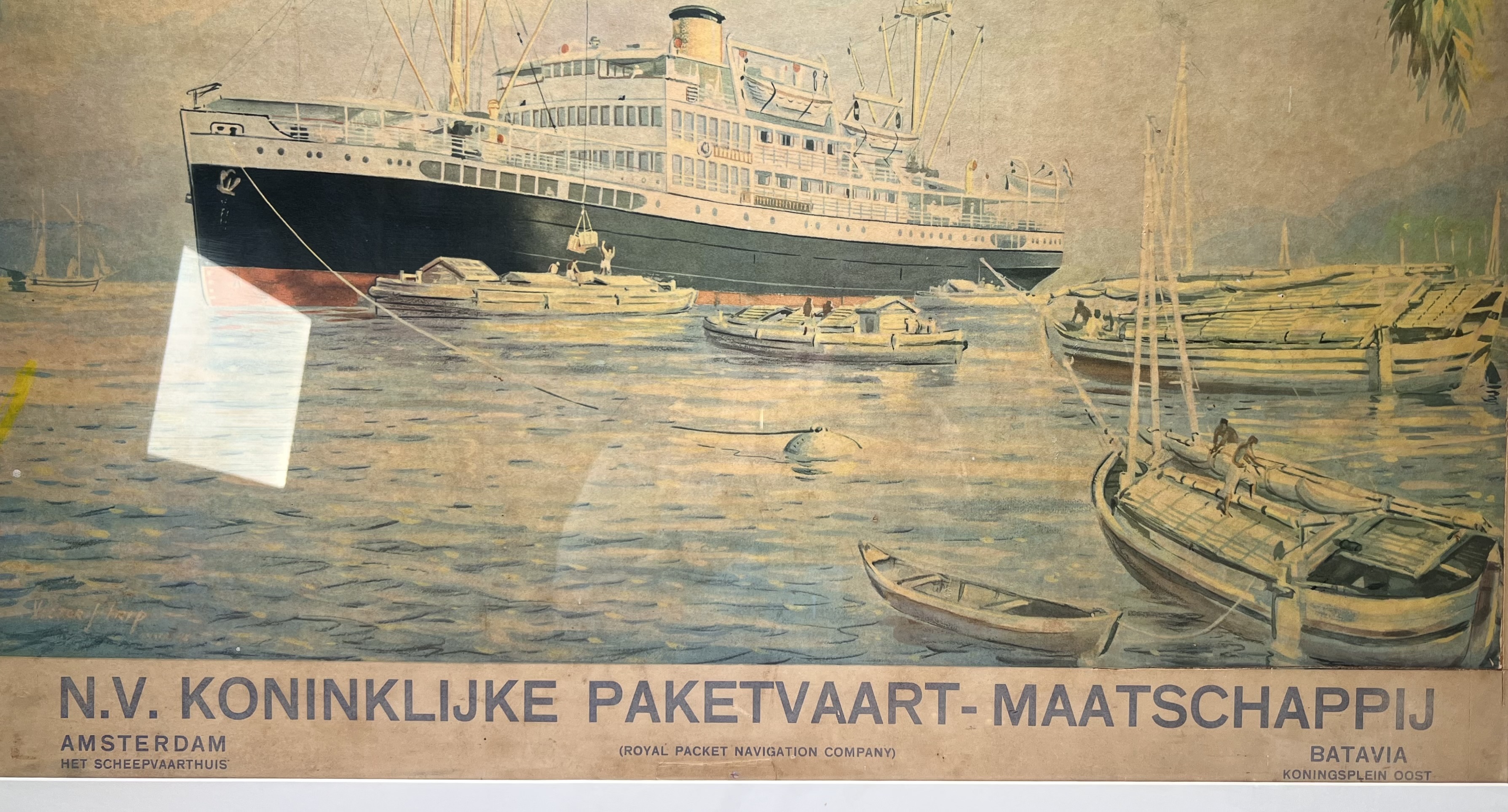 Prent van de NV Koninklijke Pakketvaart-Maatschappij uit de 20e eeuw, vervaardigd uit papier met de techniek van kleurenlithografie. De maritieme voorstelling toont een stoomschip met omliggende boten, de litho is ingelijst achter glas met een houten omlijsting. Van Nederlandse herkomst met historische verbinding Nederlands-Indië. Kom langs tijdens de kijkdagen (10 t/m 12 april) en ontdek deze prent zelf! |