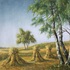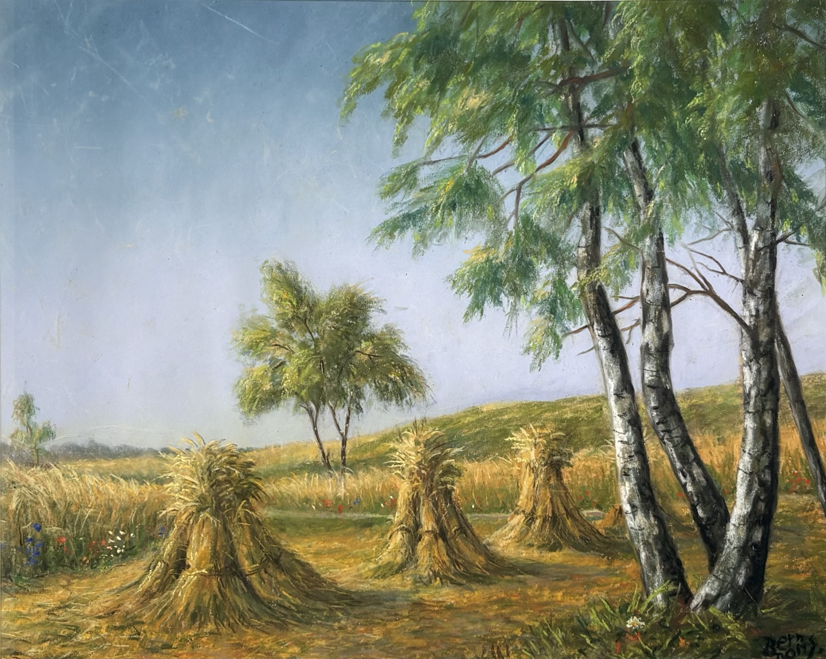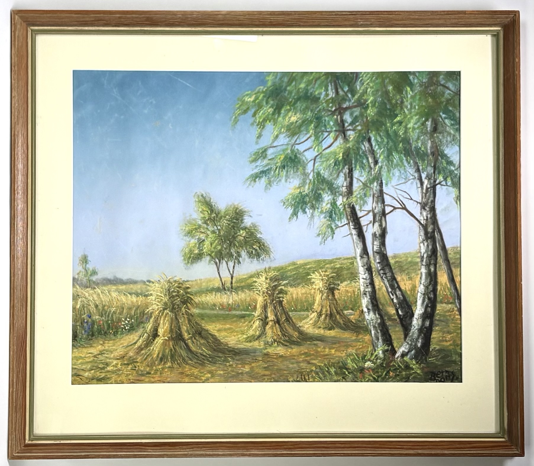 Pasteltekening - Bernard Dons, landschap met korenmijten, midden 20e eeuw