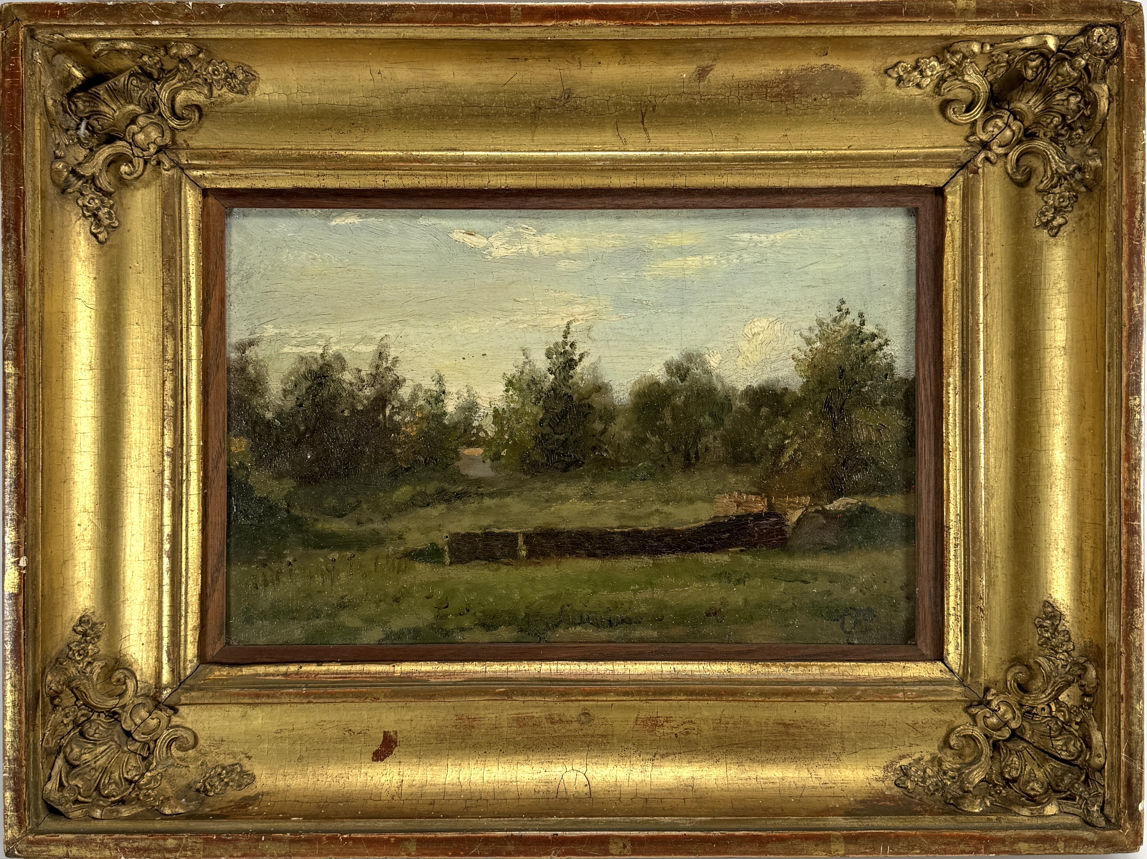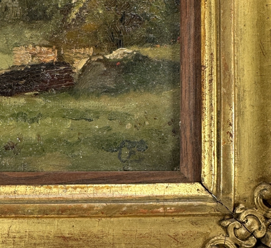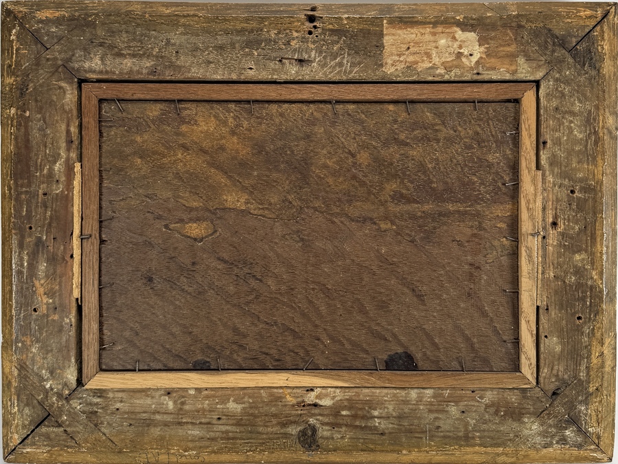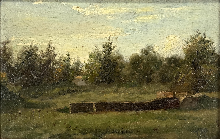 Schilderij van de Hollandse School, uitgevoerd in olieverf op paneel, toont een bosrijk landschap. De voorstelling typeert zich door een getemperd palet van oker- en mosgroene tonen onder een bewolkte lucht. Rechtsonder bevindt zich een onduidelijk monogram, het schilderij dateert uit de tweede helft van de 19e eeuw. Kom langs tijdens de kijkdagen (10 t/m 12 april) en ontdek het schilderij zelf! |