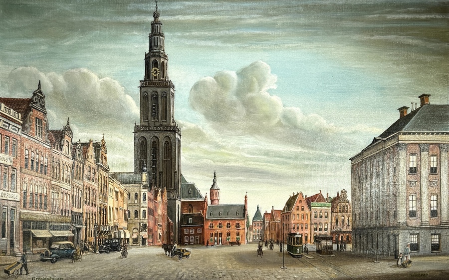Schilderij van T. Timmer toont een panoramisch gezicht op de Grote Markt te Groningen in topografisch realistische stijl, uitgevoerd in olieverf op doek. De compositie centreert de Martinitoren en toont historische stoffage van een tram, oldtimers en passanten. Rechtsonder gesigneerd en linksonder getiteld "Groningen 1927". Midden 20e eeuw, Nederlandse herkomst. Voorzien van een klassieke geprofileerde houten lijst. Geïnteresseerd? Bezoek onze kijkdagen op 10, 11 en 12 april van 11:00 tot 17:00 uur! |